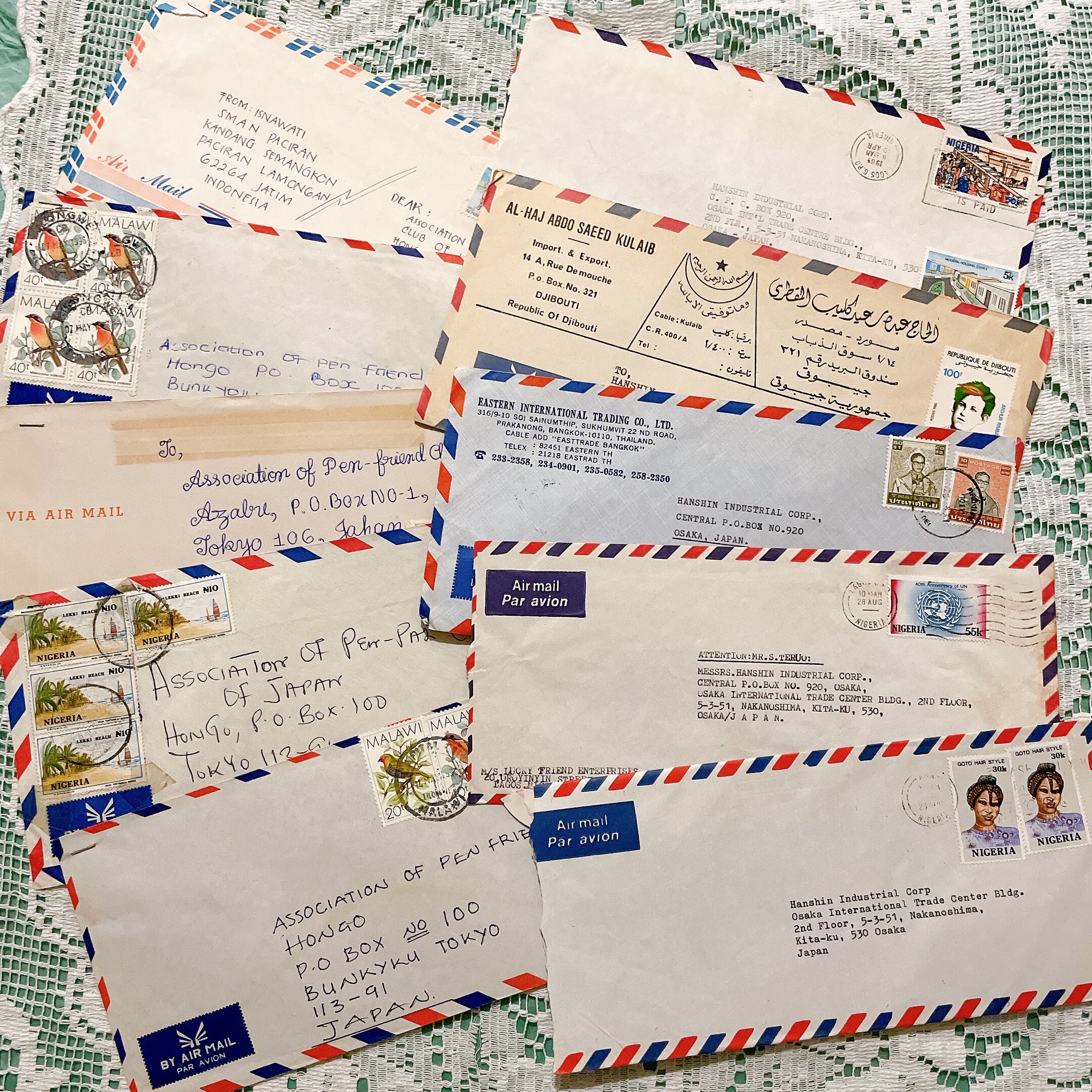 こちらは、世界中から集めたエアメール封筒10枚セットです。各封筒には、それぞれ異なる国の切手や消印が施されており、歴史的な背景や国際交流の息吹を感じられるアイテムとなっています。ビンテージならではの経年変化が味わい深く、紙の質感や印刷の風合いが一層特別感を引き立てます。