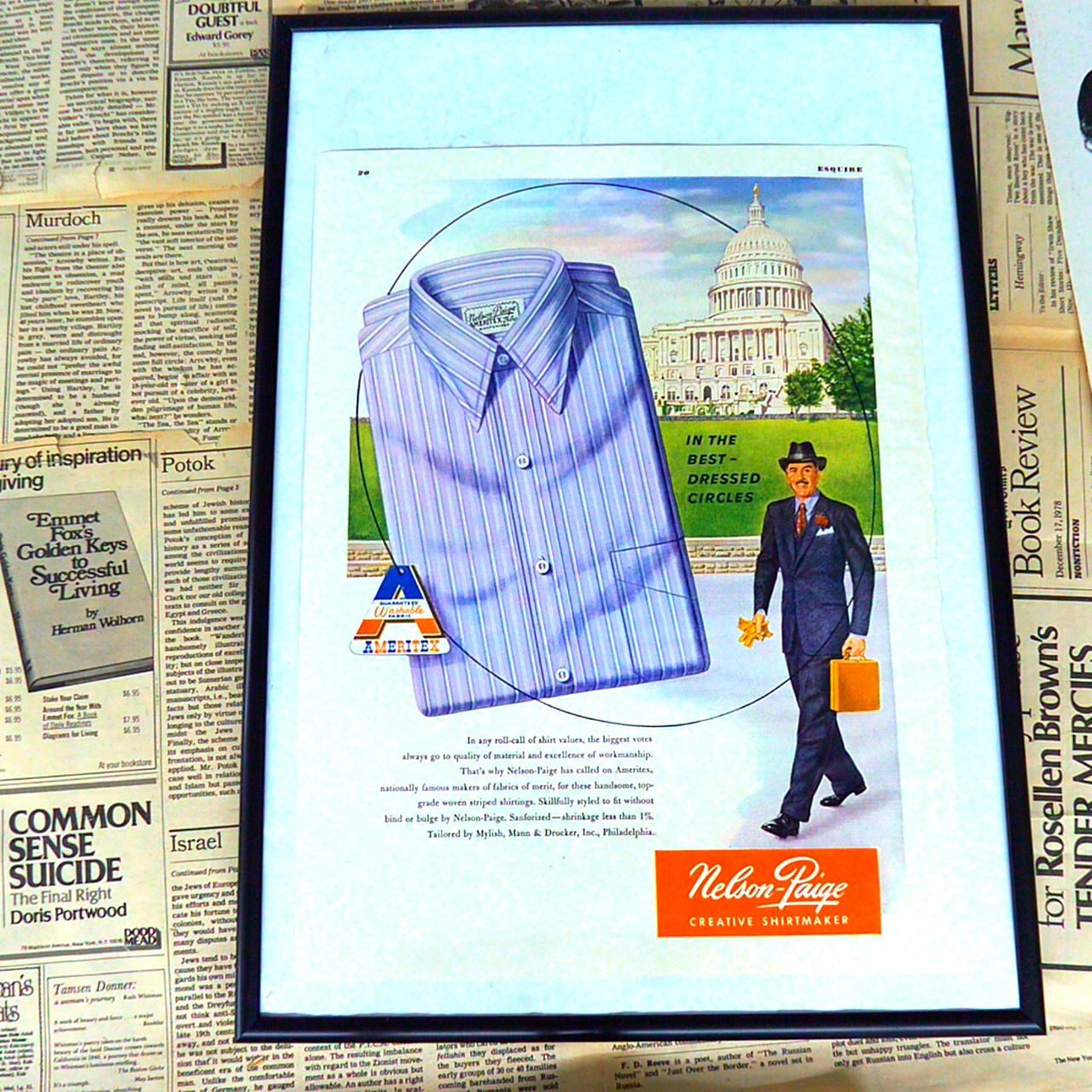 Nelson-Paigeは、アメリカを代表するシャツメーカーであり、その品質と仕立ての良さで広く知られています。特に1950〜70年代のアメリカにおいて、同社はビジネスパーソンやエグゼクティブ層をターゲットにした上質なワイシャツを提供していました。伝統あるテイラリング技術と、時代に合わせたデザイン性を融合させた製品が特徴です。素材選びから縫製まで一切の妥協がなく、着心地と耐久性を兼ね備えています。広告にもあるように、洗練された装いを求める人々に選ばれ続けており、「最も洗練されたサークルの中で」着用されることを誇りとしています。