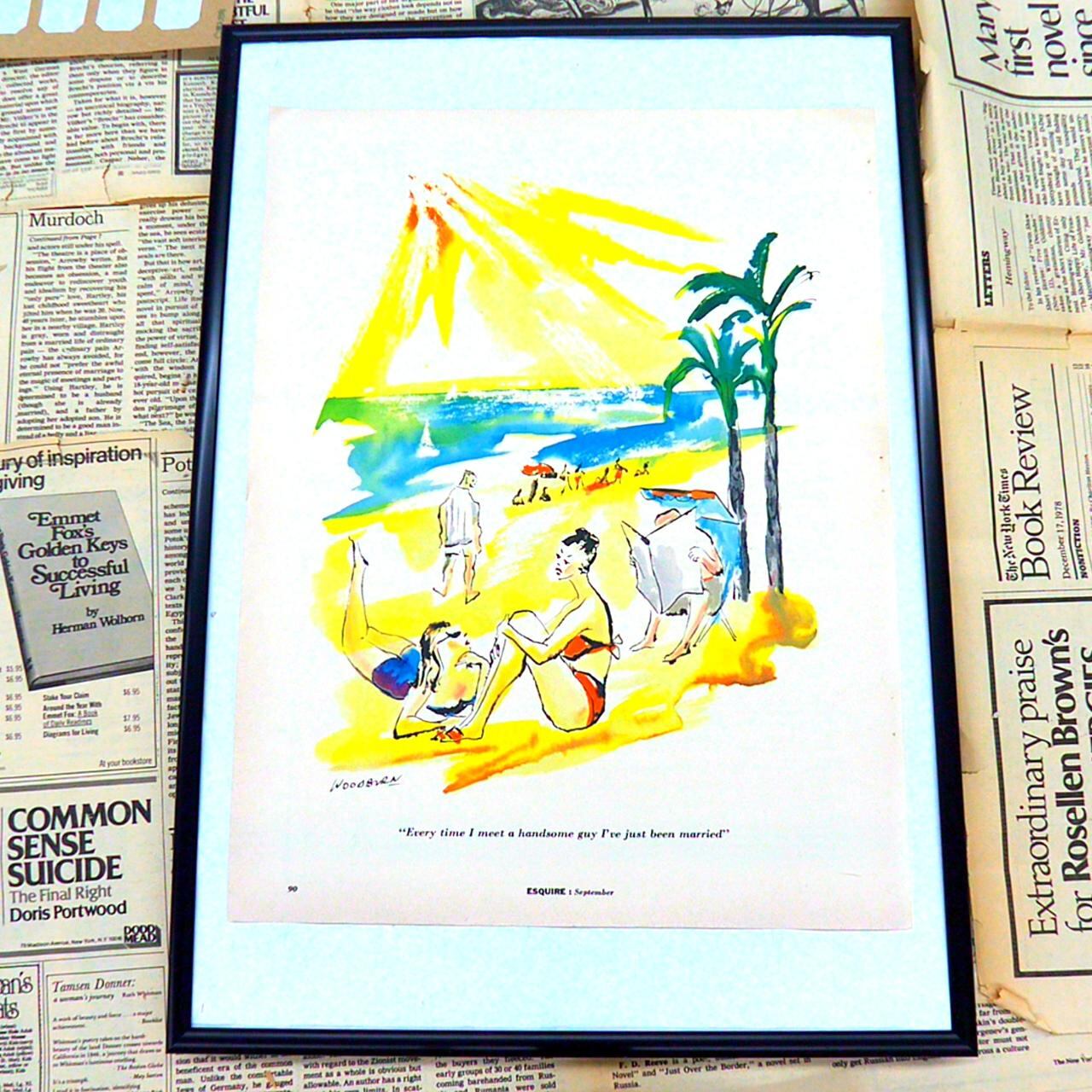 このイラストは、鮮やかな水彩タッチで描かれたビーチの風景が印象的です。手前には水着姿の若い女性が二人、リラックスした様子で砂浜に座り会話を楽しんでいます。その奥にはヤシの木や鮮やかな太陽、そして青い海が広がり、さらに遠くにはヨットやビーチでくつろぐ人々が描かれています。イラストのキャプションは『Every time I meet a handsome guy I've just been married』とあり、ユーモラスで少し皮肉なニュアンスが込められています。出会うたびに素敵な男性が現れるのに、いつも『ちょうど結婚したばかり』という状況に陥る女性の心情が洒落たタッチで表現されています。明るい色彩と軽やかな線描が、1970年代らしいポジティブなムードと、ビーチリゾートの開放感を伝えてくれます。インテリアとしても飾りやすい、ポップでウィットに富んだ一枚です。