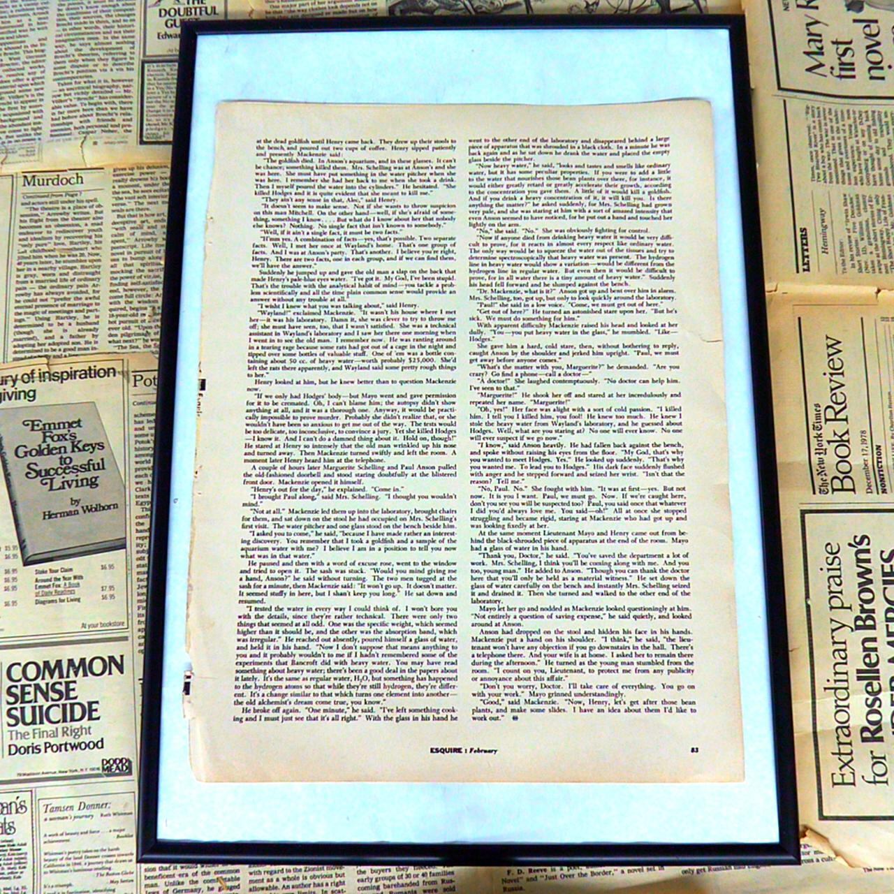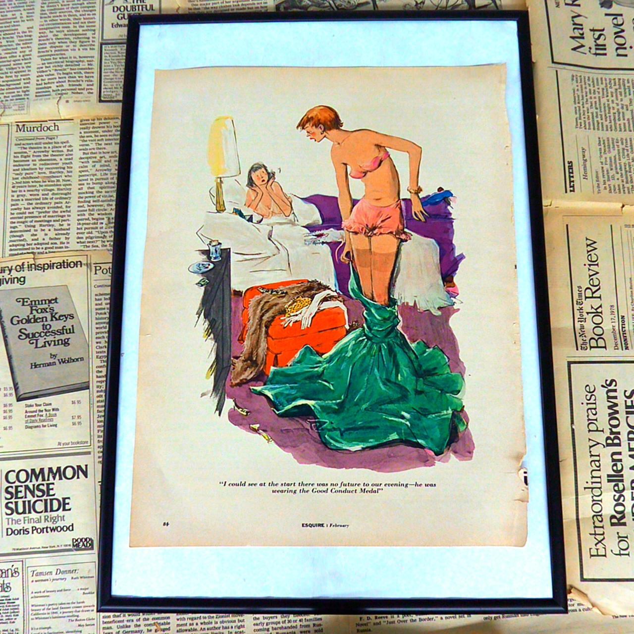 このイラストは、エスクワイヤー誌らしいユーモアと風刺に満ちたワンシーンを描いています。寝室で女性がランジェリー姿で立っており、ベッドには男性がくつろぐ姿が見えます。女性の前には脱ぎ散らかされたドレスやコートがあり、部屋の雰囲気は親密でありながら、どこかコミカル。キャプションでは男性が“Good Conduct Medal(善行章)”を身に着けていることが示されており、これは軍や警察などで模範的な行動に贈られるメダルです。イラストの意図は、女性が「今夜はうまくいかない」と最初から感じていた理由が男性の“真面目すぎる”キャラクターであったという皮肉。つまり、ロマンティックな期待と現実のギャップをユーモラスに描き、見る人にくすりとした笑いを誘います。1970年代らしい色彩とタッチも魅力の一つです。