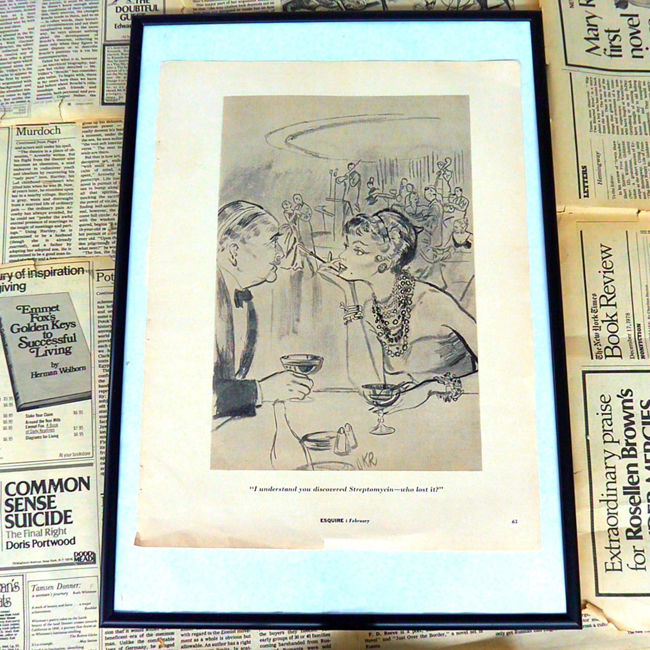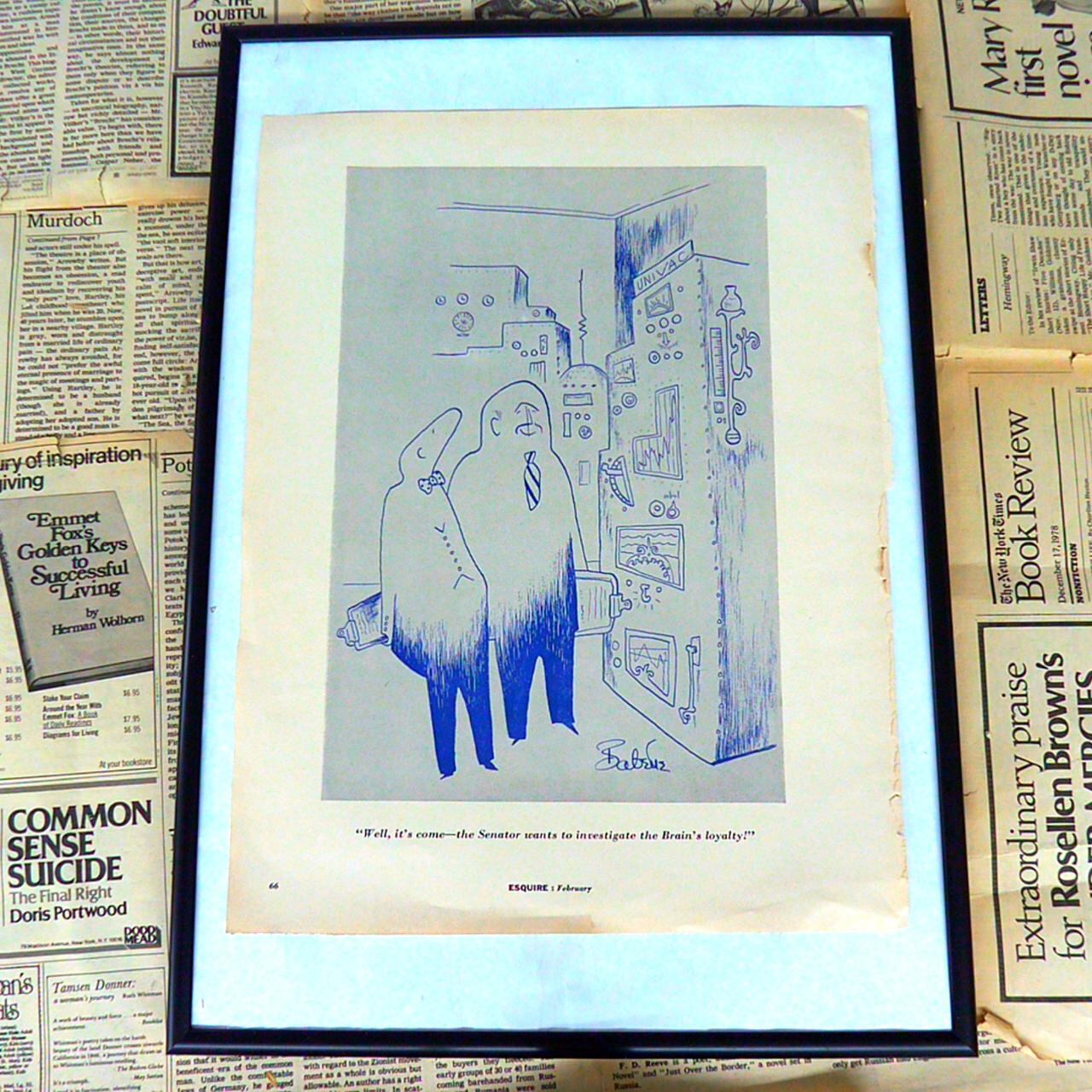 このイラストは、1970年代のエスクワイヤー誌に掲載された風刺的なワンカットです。特徴的な青インクで描かれた二人の人物が、巨大なコンピュータの制御盤の前で話している様子が描かれています。コンピュータには『UNIVAC』という文字が見え、これは当時の大型計算機を象徴するものです。キャプションの『ついに来たよ—上院議員が“ブレイン”の忠誠心を調査したいってさ』というセリフから、冷戦時代の監視社会や、技術革新を巡る政治的な緊張感をユーモラスに風刺していることがわかります。人間の知性や機械の進化が、時に権力者から疑いの目で見られる社会的現象を、シンプルながらも印象深い線画で表現しており、ユーモアと皮肉が絶妙に融合した一枚です。インテリアとしても、当時の社会風刺やテクノロジー観を今に伝える、会話のきっかけになるヴィンテージ・アート作品です。