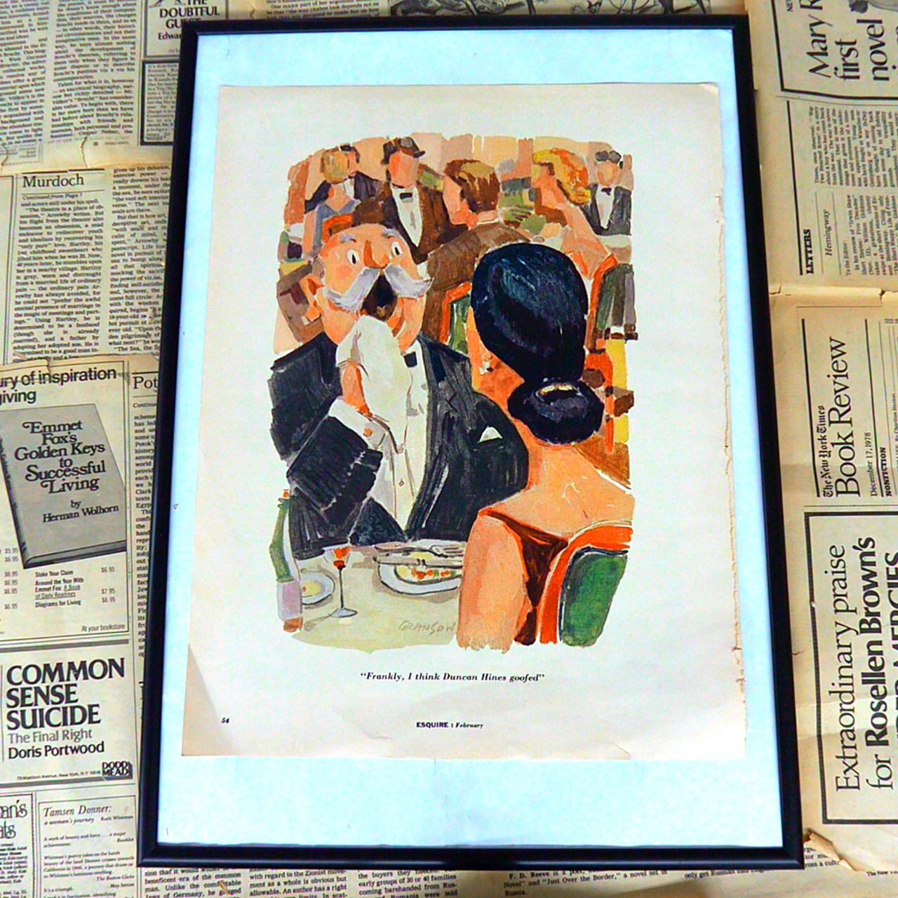 このイラストは、華やかなレストランでの一幕を描いています。前景にはエレガントなドレスを着た女性と、燕尾服姿の紳士が座っています。紳士はナプキンを口元に当てて驚いた表情を浮かべており、そのコミカルな顔立ちと仕草が印象的です。背景にはパーティーの賑やかな雰囲気が伝わるように、複数の男女が談笑している様子が描かれています。イラストの下には「Frankly, I think Duncan Hines goofed(率直に言うと、ダンカン・ハインズは失敗したと思う)」というキャプションが添えられており、これは当時人気のあった食品評論家ダンカン・ハインズに対するユーモアや風刺が感じられます。食通が集う場で、期待を裏切られた料理に対して思わず本音が漏れた瞬間を描いた、機知に富んだ作品です。明るくカラフルな色彩と、流れるような筆致が見る人の目を惹きつけ、当時のアメリカン・コミックやユーモア文化を象徴する一枚となっています。