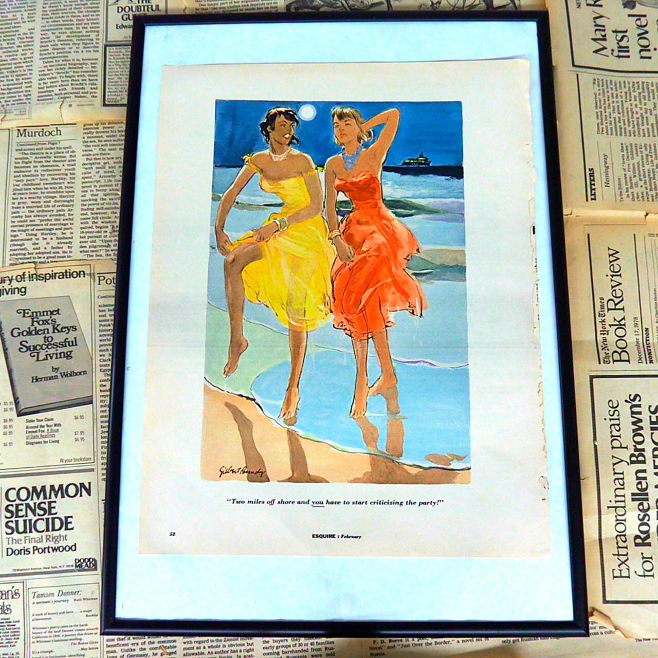 このイラストは、月明かりの下、海辺でドレス姿の女性二人が裸足で楽しそうに歩いている様子を描いています。片方は鮮やかな黄色、もう一方は情熱的なオレンジ色のドレスを身に付け、どちらも波打ち際の水面に足を浸しています。背景には船が見え、二人はリラックスしながらも親密に会話を交わしている様子が印象的です。キャプションの『Two miles off shore and you have to start criticizing the party!(海岸から2マイルも離れたのに、あなたはパーティーの批判を始めるのね!)』というフレーズには、ウィットと皮肉が感じられ、友人との軽妙な会話や社交の場での軽やかな一幕が表現されています。エスクワイヤー誌らしいユーモアを含んだイラストは、当時の社交文化や女性の自由な雰囲気を鮮やかに切り取っています。