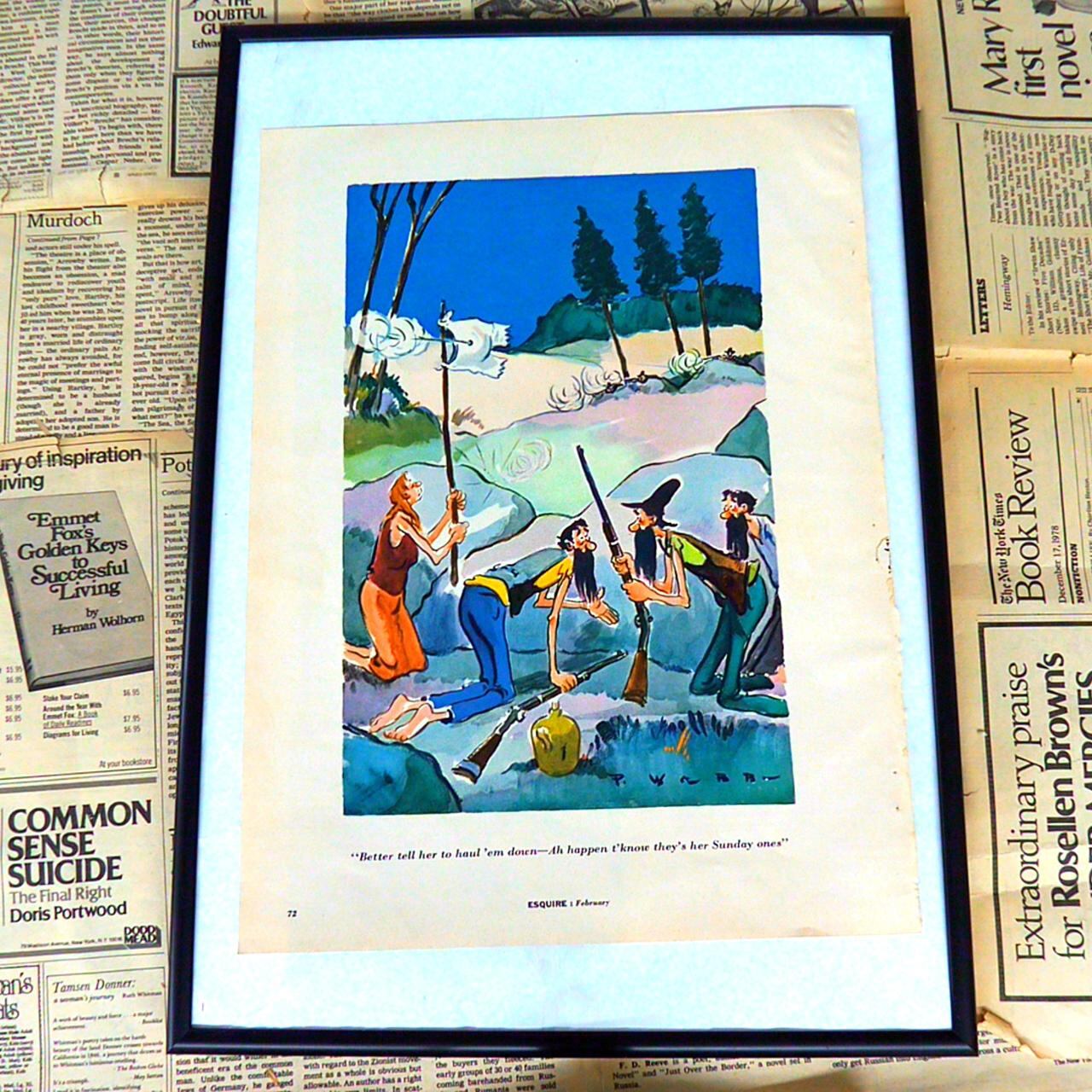 このイラストは、アメリカのユーモア雑誌『ESQUIRE』に掲載されたコミカルなワンシーンです。画面には、川辺で洗濯物を干している女性と、銃を持った三人の男性が描かれています。女性が干しているのは大きな白い布(おそらく下着)であり、男性たちはその様子を興味津々に見つめています。キャプションには「彼女に早く洗濯物を下ろすよう伝えた方がいいぞ――あれは日曜用だからな」とあり、日常のちょっとしたハプニングを面白おかしく描写しています。ユーモラスで牧歌的なタッチのイラストは、当時のアメリカの田舎の雰囲気や人々の素朴な暮らし、そしてコミュニティの中での笑いが伝わってきます。コミカルな風刺としても機能し、見る人に思わずくすりとさせる、時代を超えて愛されるヴィンテージアートです。