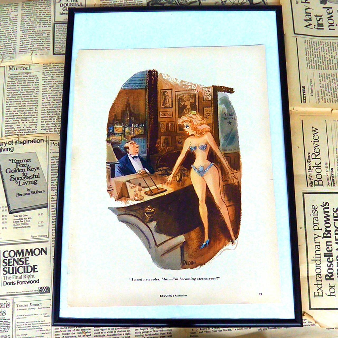 このイラストは、舞台裏の一幕をコミカルに描いた作品です。ドレッシングルームのような場所で、セクシーな衣装を身にまとった金髪の女性が、デスクに座る男性に向かって訴えかけています。キャプションは「新しい役が必要よ、マックス——型にはめられちゃう!」というもので、女優が自分の配役がワンパターンになっていることに不満を持ち、エージェントと思われる男性に新しい役柄を求めている風刺的な内容です。背景には映画やショービジネスの雰囲気が漂っており、壁には様々なポスターや写真が貼られ、デスクには書類や電話などが描かれています。女性の堂々とした態度と、男性のやや困惑したような表情が対照的で、当時のエンタメ業界にありがちな固定観念やステレオタイプ化への風刺が込められています。イラストレーションとしても色彩豊かで、細部まで丁寧に描かれており、インテリアとして飾っても目を惹く一枚です。