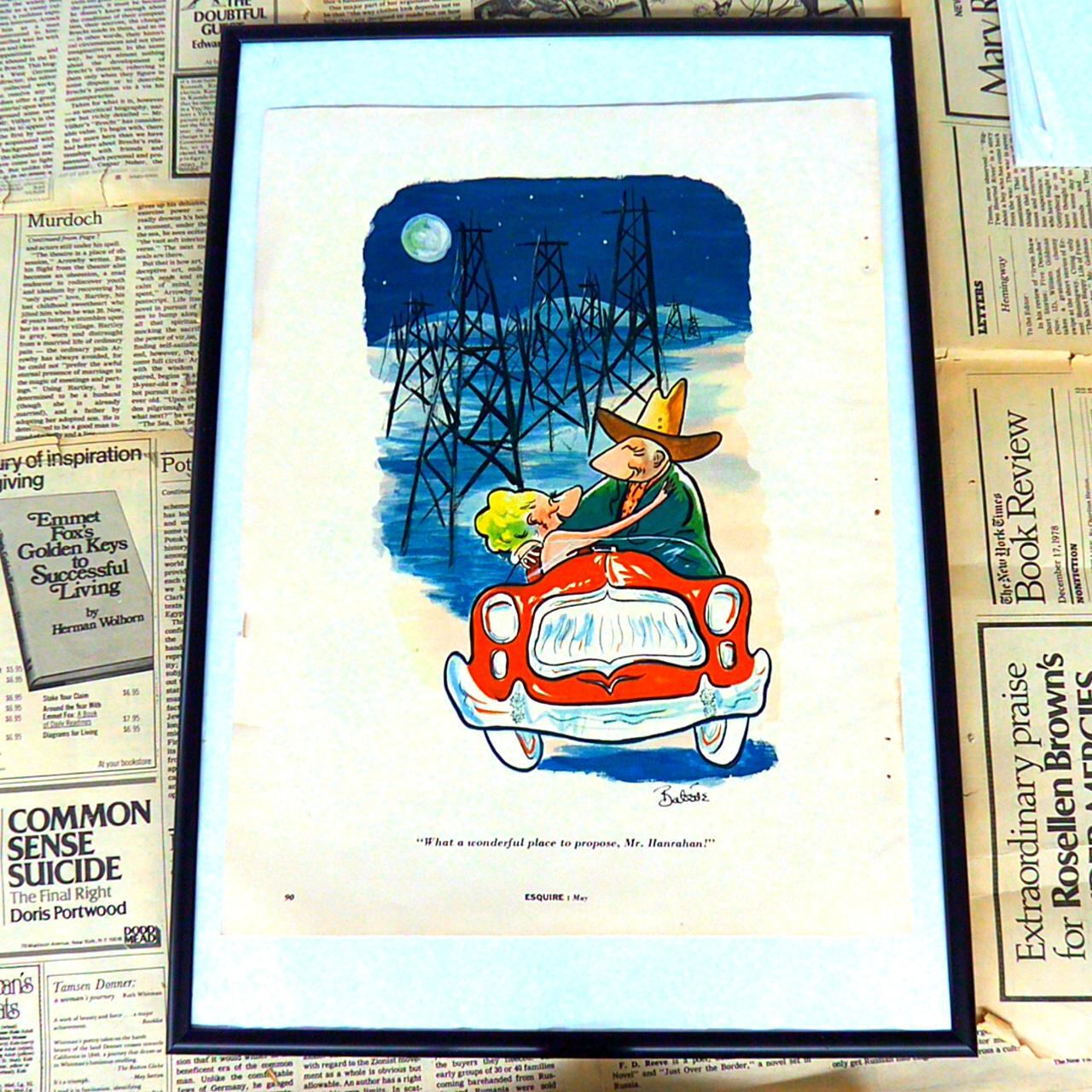 このイラストは、アメリカのユーモア雑誌『ESQUIRE』に掲載された作品です。内容は、満月の夜、無数の石油採掘用のタワーが立ち並ぶ風景を背景に、カウボーイハットをかぶった男性とブロンドの女性が赤いクラシックカーに座り、ロマンチックな会話をしている様子を描いています。キャプションには「なんて素敵なプロポーズの場所なんだ、ハナハンさん!」という言葉が添えられており、石油産業が生活や夢、ロマンスにまで深く関わっていたアメリカ社会を風刺的に表現しています。荒涼とした油田を背景にすることで、通常は夢や愛の象徴とされるプロポーズの場面を、現実的かつ少し皮肉なユーモアで包み込み、見る人にクスッと笑わせてくれる一枚です。イラストは鮮やかな色使いと簡潔な線描で、70年代特有のポップな雰囲気を感じさせ、インテリアとしても目を引くアートピースとなっています。
