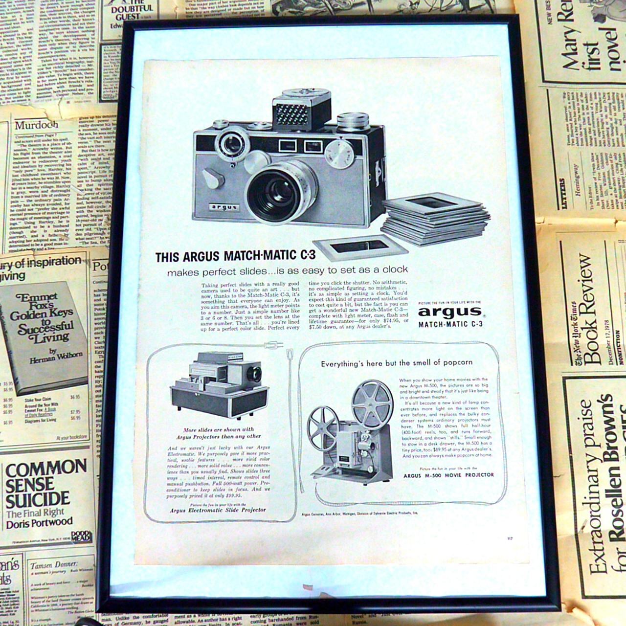 Argus(アーガス)は、アメリカ・ミシガン州アナーバーを拠点とする歴史ある光学機器メーカーです。1930年代から1960年代にかけて、手頃な価格と高品質を両立したカメラやスライドプロジェクターを数多く生み出し、一般家庭に写真撮影の楽しさを広めました。特に“レンガ”の愛称で親しまれたC3型カメラはベストセラーとなり、数百万台が販売されました。Argusは、技術革新を重ねつつも使いやすさにこだわり、写真の大衆化に大きく貢献した企業です。現在もビンテージカメラ愛好家から高く評価されています。