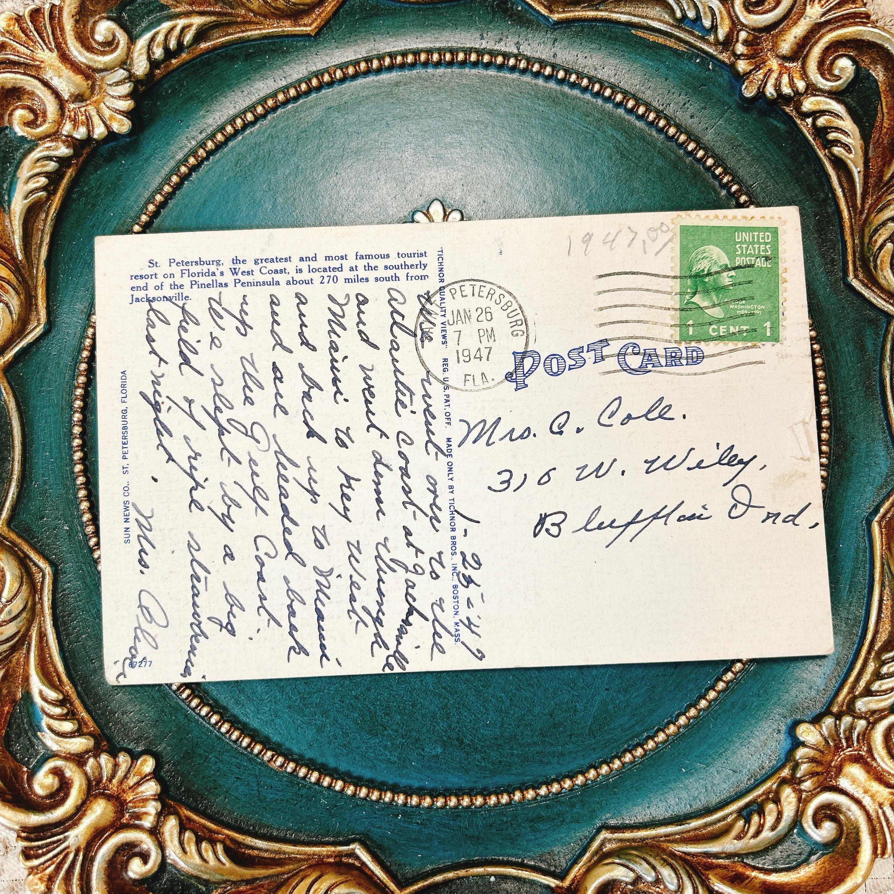 裏面には1セント切手(ジョージ・ワシントン緑色)が貼られ、「1947年1月26日」の消印とともに、Mrs. C. Cole宛にインディアナ州バッファローへと送られた記録が残っています。筆記面では、送信者がマイアミ滞在を経てセントピーターズバーグを訪れた旅の報告をしており、当時の観光文化と季節感が垣間見える内容となっています。