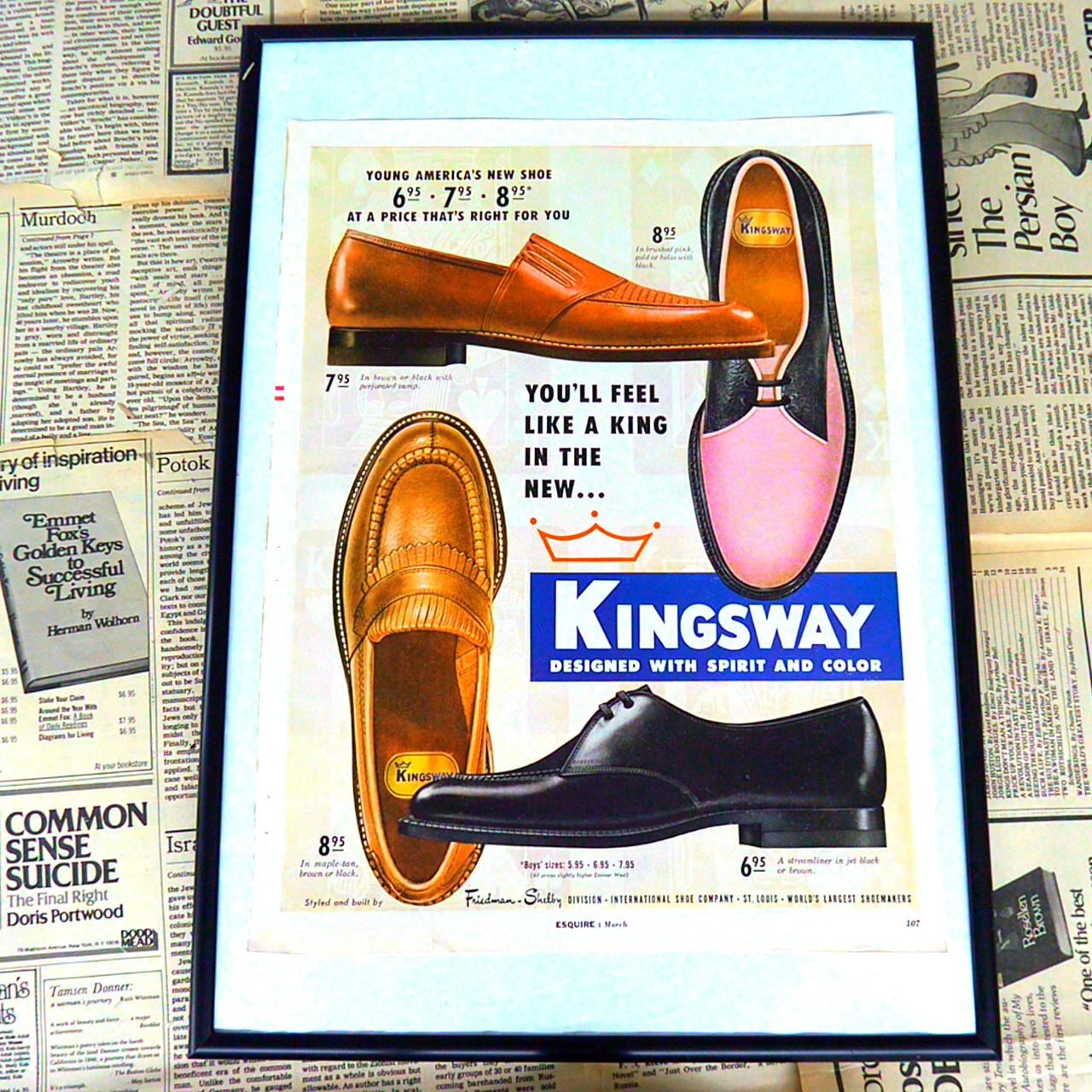 International Shoe Companyは、アメリカ・ミズーリ州セントルイスに本拠を置く老舗の靴メーカーで、20世紀半ばには全米最大規模を誇るシューズブランドのひとつとして知られていました。同社は、耐久性と快適性、そしてファッション性を兼ね備えた幅広い靴のラインナップを提供し、子供から大人まで幅広い層に支持されていました。広告中で紹介されている『KINGSWAY』シリーズは、デザイン性に優れた紳士用シューズとして展開され、洗練された色使いとクラシックなフォルムで人気を集めました。高品質な素材を使用した優雅なルックスと、リーズナブルな価格を実現することで、日常の装いをワンランク上へと導くブランドとして長年親しまれています。