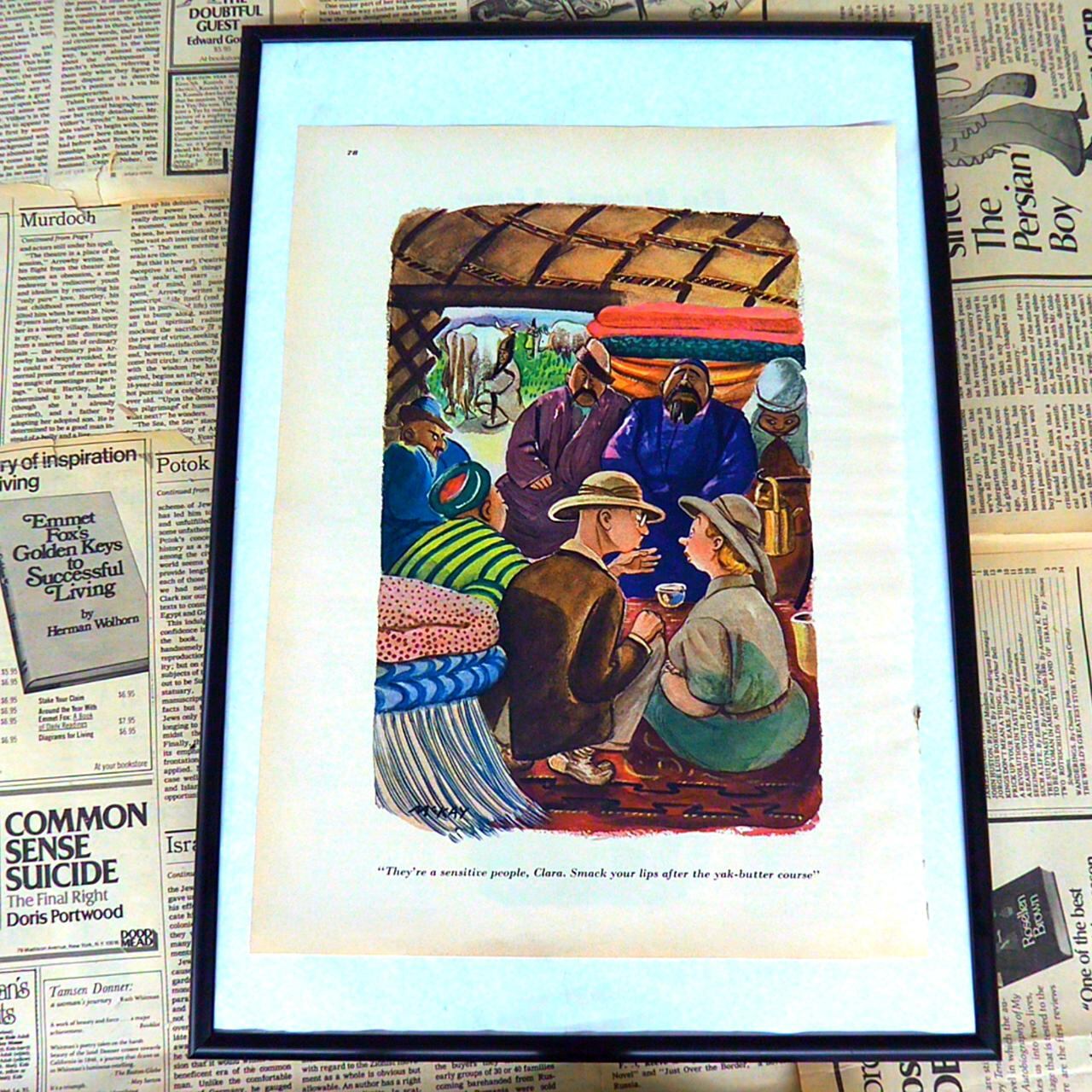 このイラストは、異国の地を訪れた西洋人夫婦が現地の人々と共に食事をしている様子を描いています。色とりどりの民族衣装をまとった人々や、素朴な屋根の下での交流の様子が生き生きと表現されています。キャプションには「ヤクバター料理の後で唇を鳴らしてね、クララ。彼らは繊細な人たちだから」とあり、文化的な習慣やマナーの違いをユーモラスに描写しています。西洋人夫婦の緊張感と、周囲の現地住民の好奇心が対比的に描かれており、異文化交流の場でよくある戸惑いと、現地の人々の繊細さを風刺的に表現しています。イラスト全体は温かみのある筆致と鮮やかな色彩で仕上げられ、どこかコミカルな雰囲気が漂っています。見ているだけで異国の空気や文化の違いを感じ取れる、ユーモアと人間味にあふれる一点です。