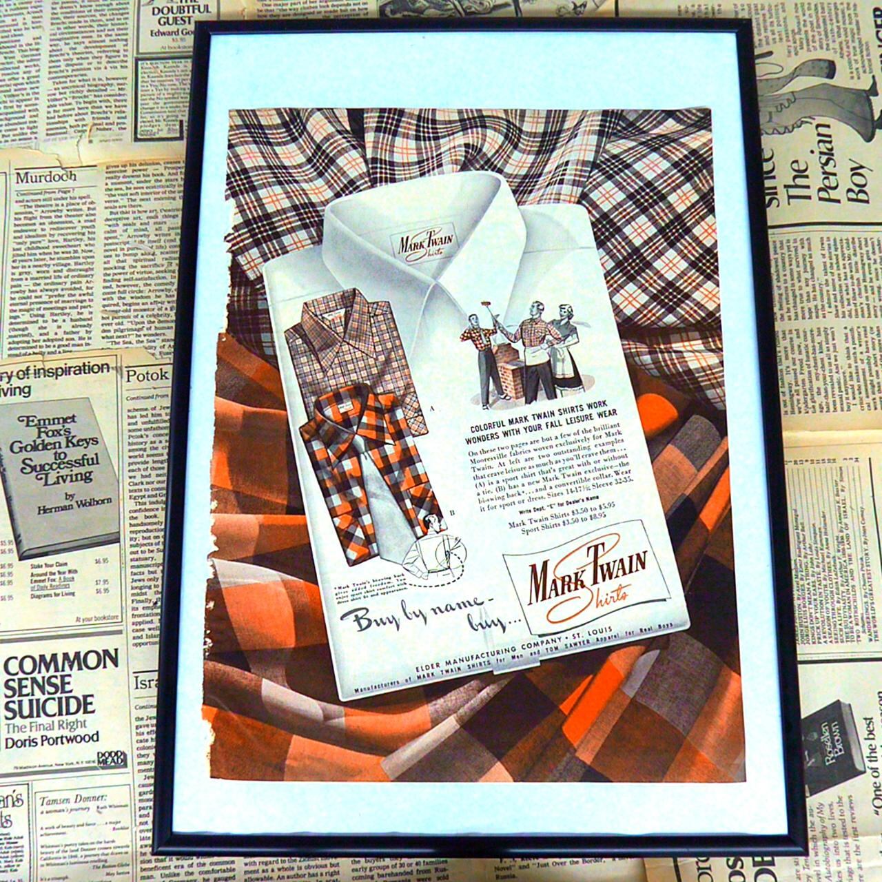 Elder Manufacturing Companyはアメリカ・セントルイスに本拠を置く老舗のアパレルメーカーで、特に『Mark Twain Shirts』ブランドで知られています。同社は20世紀中頃から、品質の高い紳士用シャツやカジュアルウェアを展開し、クラシックなデザインと実用性を兼ね備えた製品で幅広い年代から長く愛されてきました。当時の広告にも見られるように、カラフルで独自性のあるチェック柄や多様な生地使いが特徴で、日常使いはもちろん、レジャーやフォーマルな場面にもふさわしいラインナップが揃っています。伝統を守りながらも時代のトレンドを取り入れ、常に進化を続けてきた企業です。