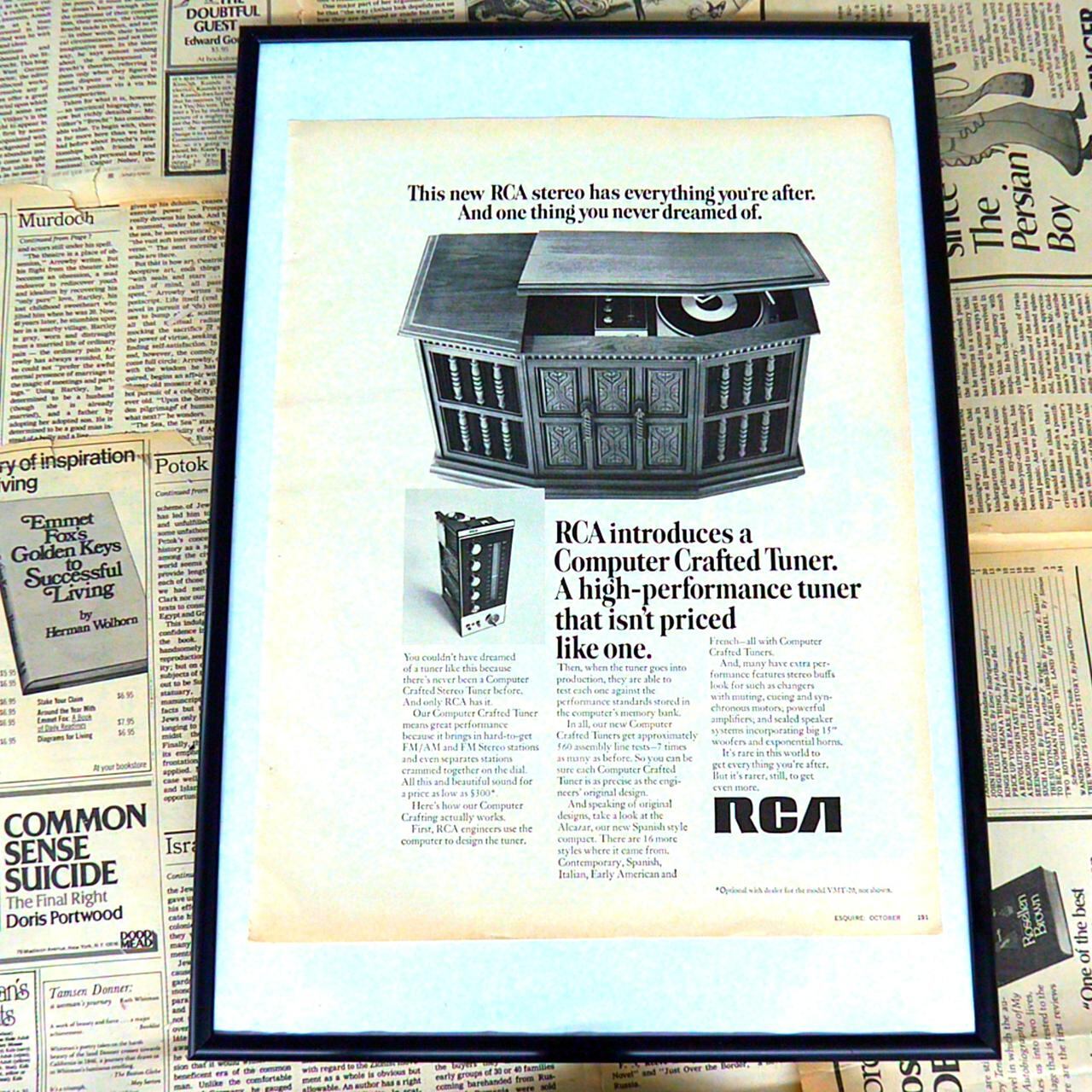 RCA(Radio Corporation of America)は、1919年に設立されたアメリカの大手エレクトロニクス企業で、通信機器や放送機器、オーディオ製品、テレビなど多岐にわたる分野でイノベーションをリードしてきました。特に20世紀中盤には家庭用ラジオやテレビの普及に大きく貢献し、一般家庭のエンターテイメント文化の発展を支えた存在です。また、RCAはレコード盤の標準規格化や、オーディオ・ビジュアル機器の開発にも積極的で、音楽・映像産業の基盤を築いた企業のひとつとしても知られています。この広告は、RCAが持つ技術力と革新性を象徴する、コンピュータ設計のチューナーを搭載したステレオを紹介しています。