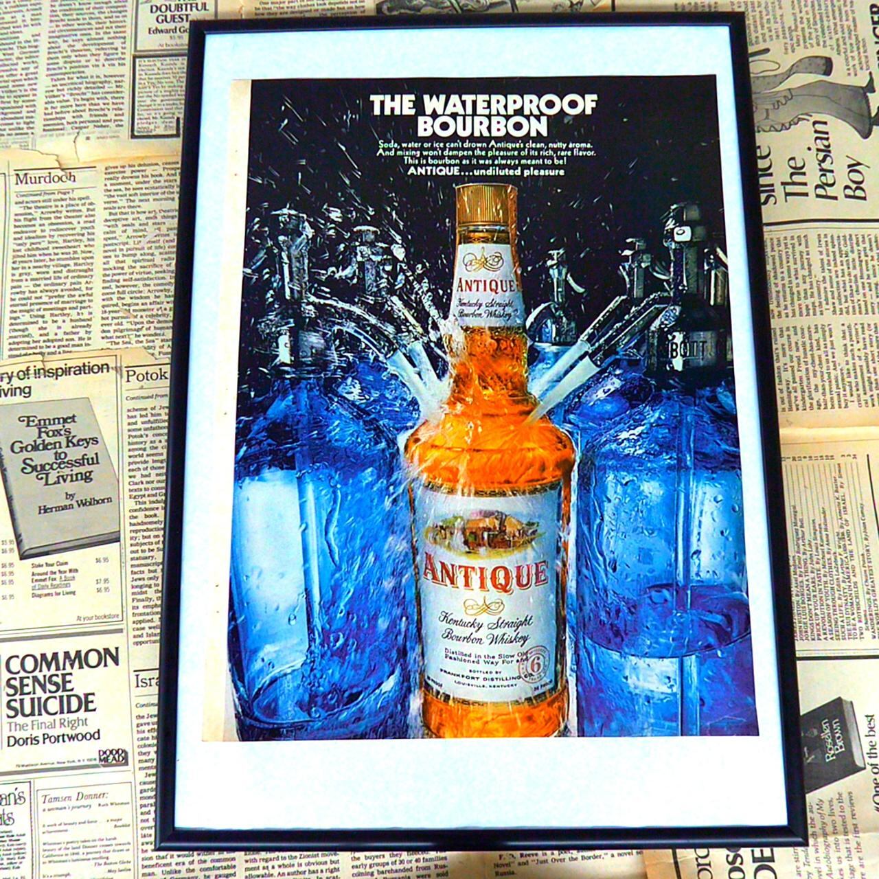 Antique Bourbonは、アメリカ・ケンタッキー州で製造される伝統的なバーボンウイスキーを展開しています。ブランド名『Antique』は、熟成されたウイスキーならではの豊かな風味と歴史を象徴しており、長年にわたる製法のこだわりと品質の高さで多くのファンを魅了し続けています。ケンタッキー州の新しいオーク樽で最低6年間熟成されることで、独自のまろやかさと芳醇な香りを実現し、ストレートはもちろん、カクテルベースとしても親しまれています。その広告からも、割りものや水割りでも薄まらずに楽しめる“本物の味”への自信が表現されており、バーボン愛好家にとっては欠かせない存在です。