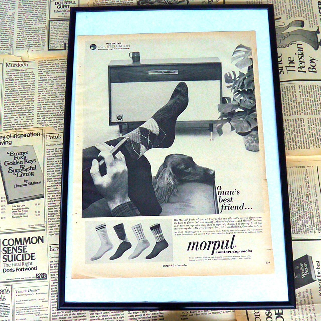 morpul(モープル)は、アメリカで展開されていた靴下メーカーで、特に快適性と品質にこだわった製品作りで知られていました。1950〜70年代の同社は、斬新なデザインや機能性に優れたソックスを次々と発表し、多くの男性から高い支持を集めていました。特に履き口部分の締め付けを抑えた“Comfort-top socks”シリーズは、長時間着用しても快適さが続く点が特徴です。広告にも見られるように、日常のくつろぎやビジネスシーンに似合うスタイリッシュなデザインが多く、時代を超えてヴィンテージファッションファンにも愛されています。