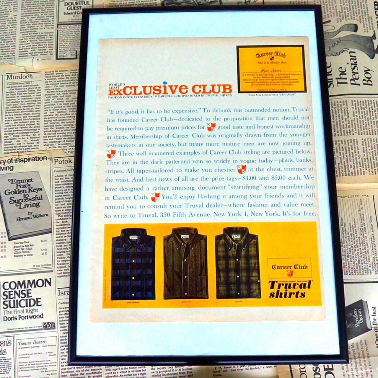 Truvalは、20世紀半ばのアメリカにおいて人気を博した紳士向けシャツメーカーです。高品質な生地と確かな仕立てを特徴とし、特にカジュアルからビジネスまで幅広いシーンで活躍するシャツブランドとして知られています。Truvalのプロダクトは、時代のトレンドを押さえつつも、手頃な価格と洗練されたデザインを両立させることで、多くの男性から支持されてきました。また、「Career Club(キャリア・クラブ)」などのクラブコンセプトを通じて、ただの衣服ではなく、ライフスタイルや価値観を提案するブランド戦略も特徴的です。トレンドのチェック柄やバティック、ストライプなど、時代を感じさせるデザインが魅力のコレクションも豊富です。