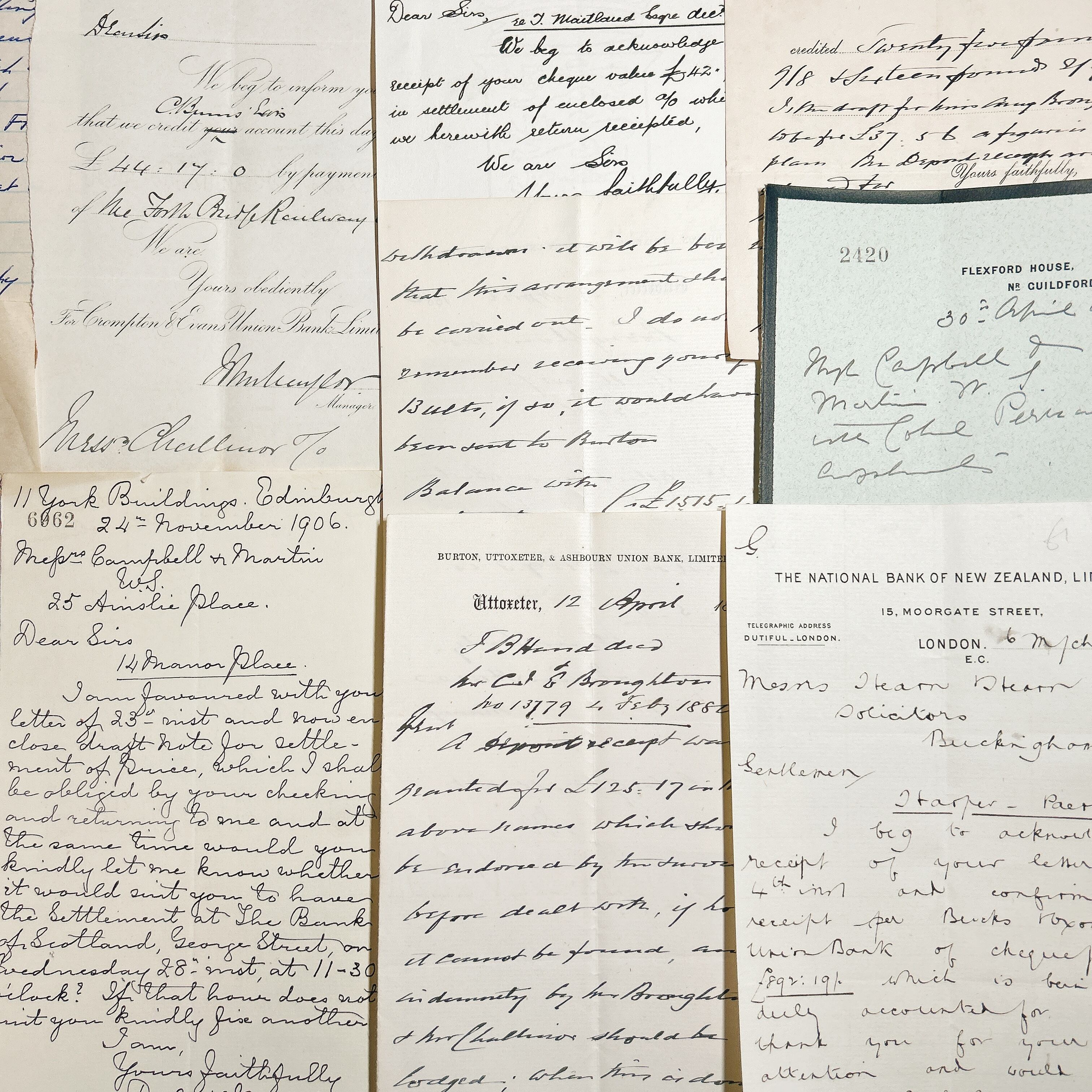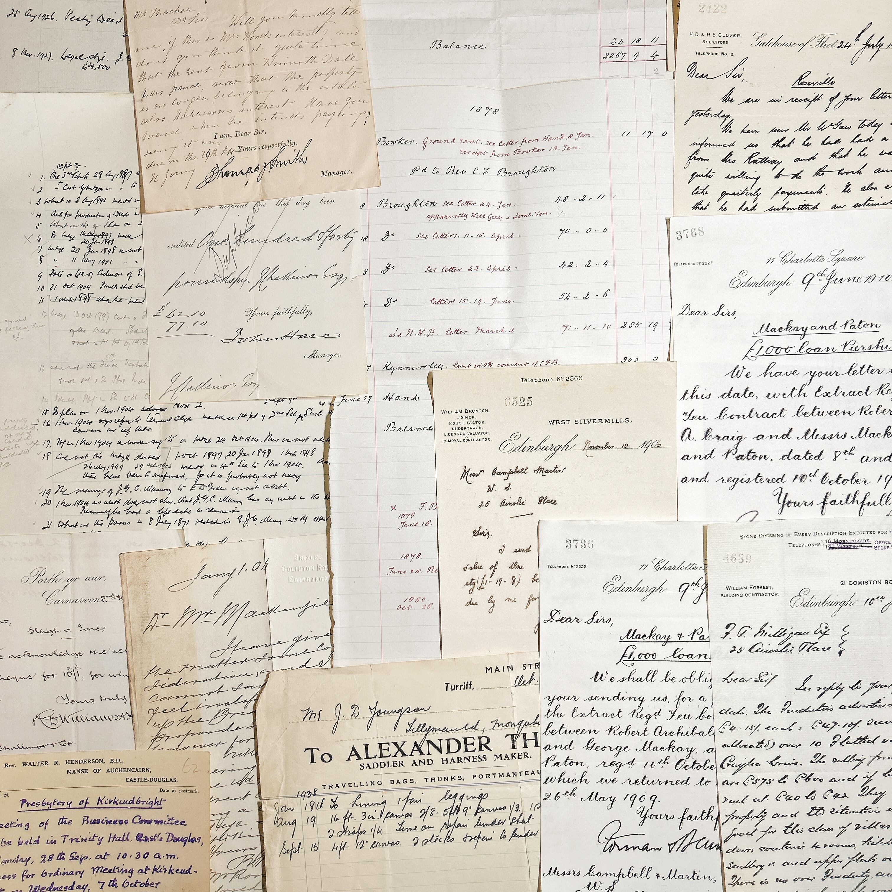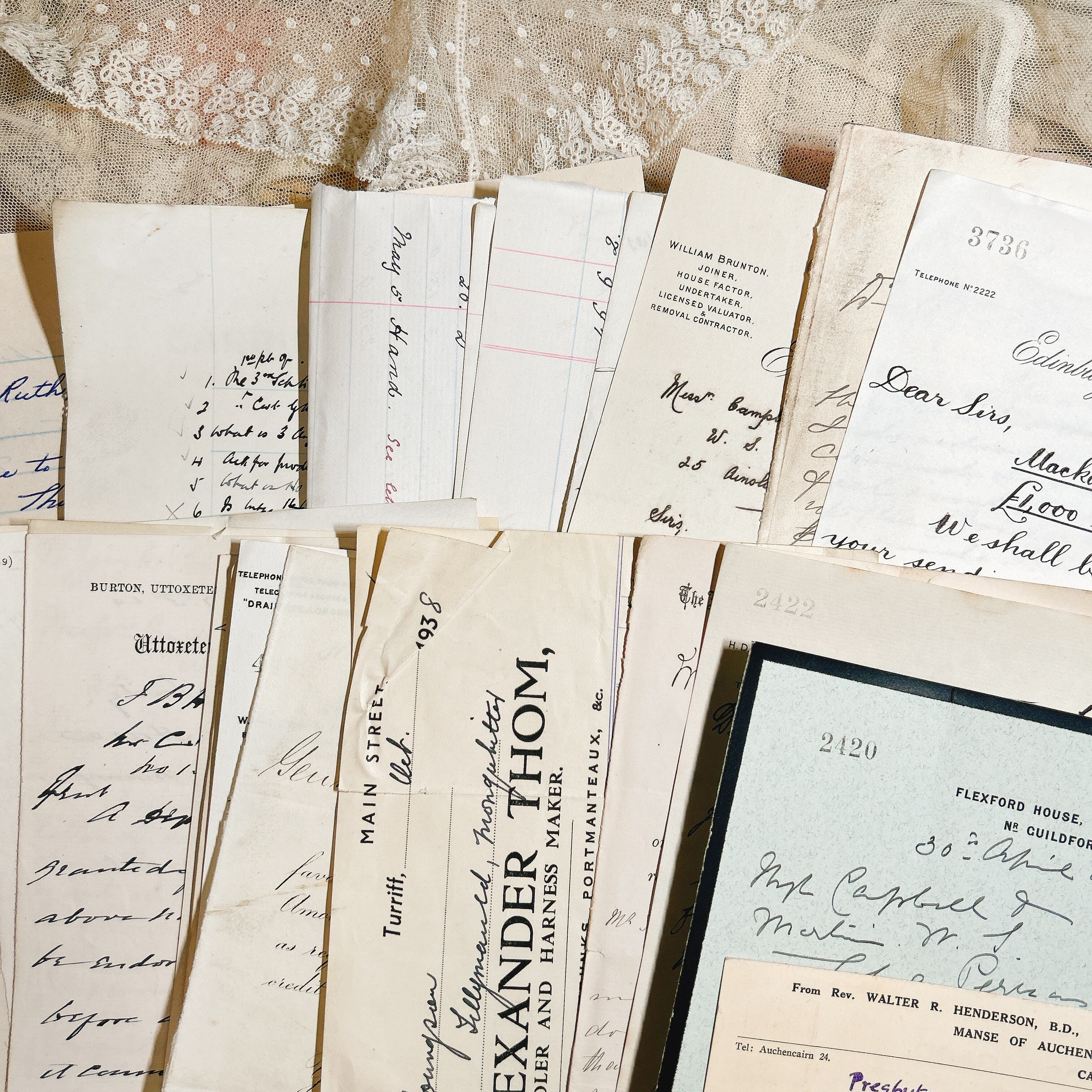 これらの書類は、様々な形式の手書き文字や内容が含まれており、時代を超えた物語を伝えます。内容には、手紙、公式な書類、取引記録、手書きのメモなどが含まれており、当時の生活や文化、商業活動の一端を垣間見ることができます。それぞれの書類が異なる書体やインクで書かれており、アンティーク感を一層引き立てています。