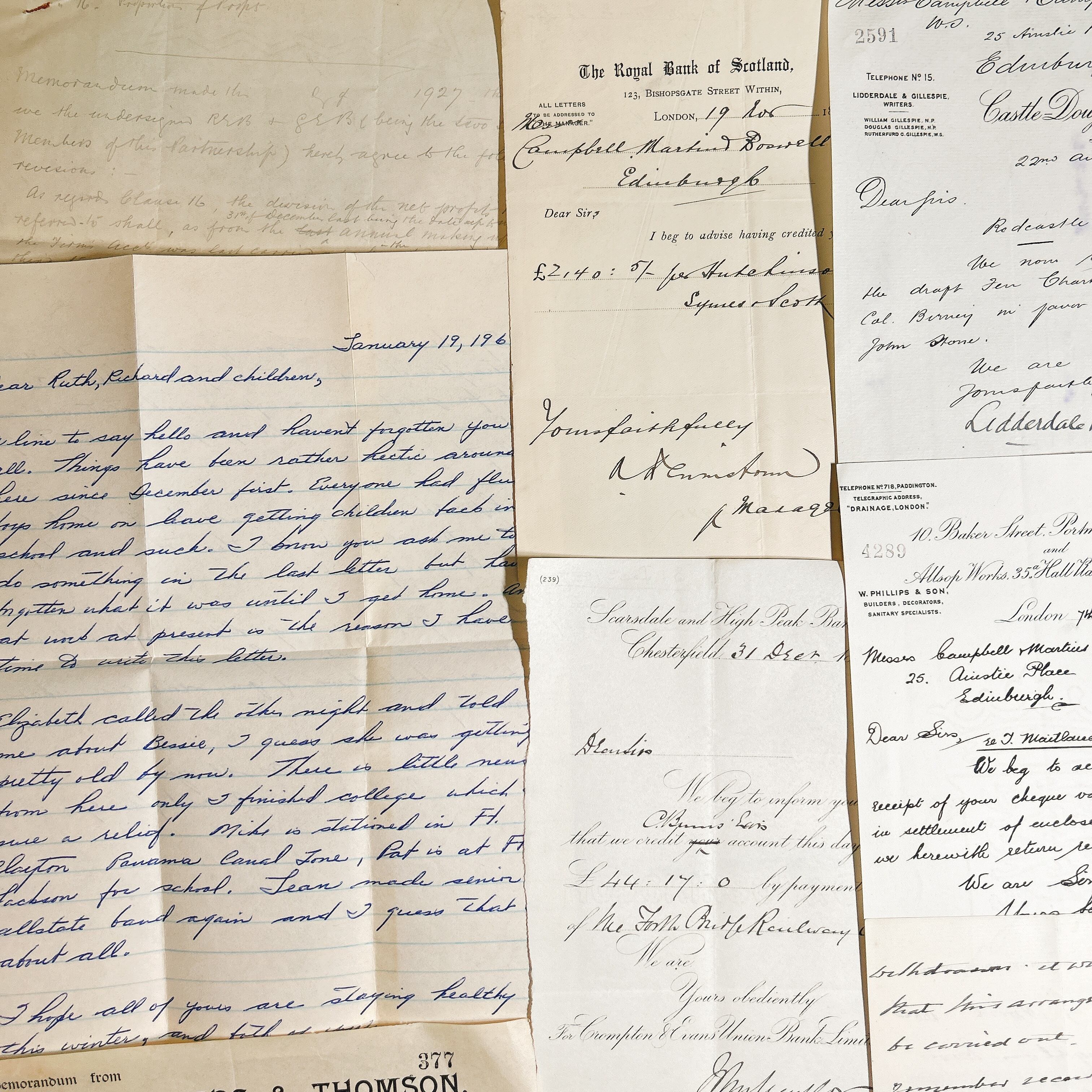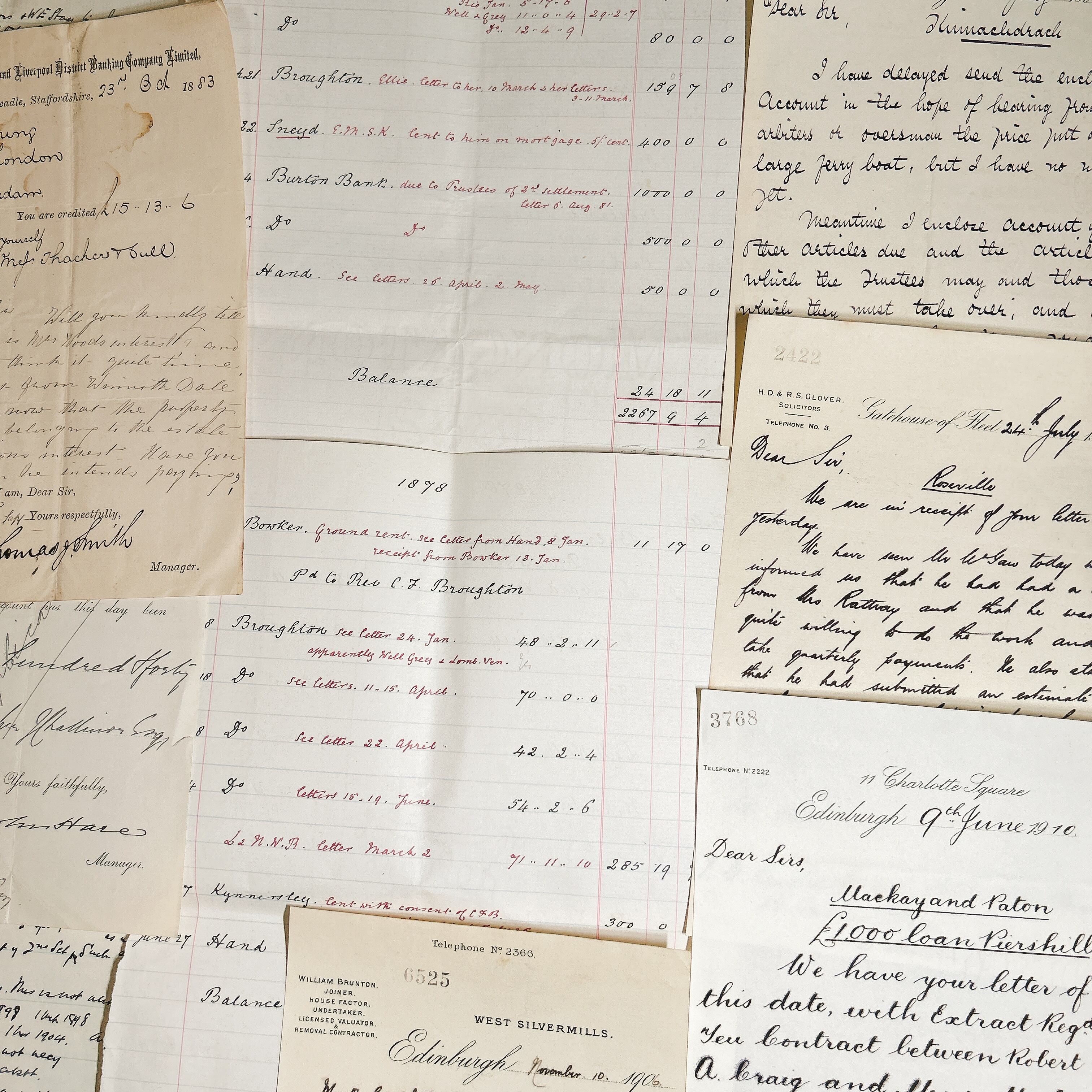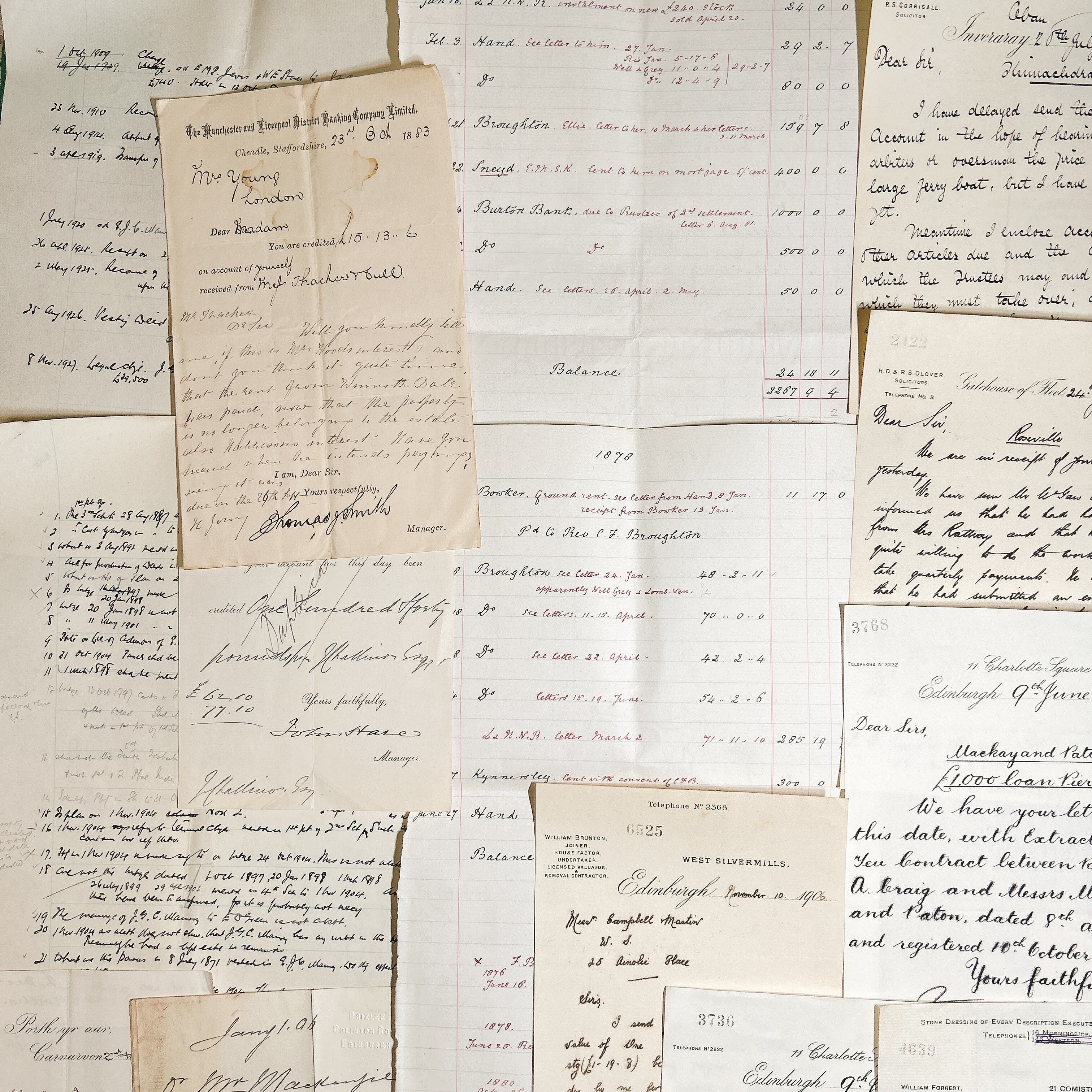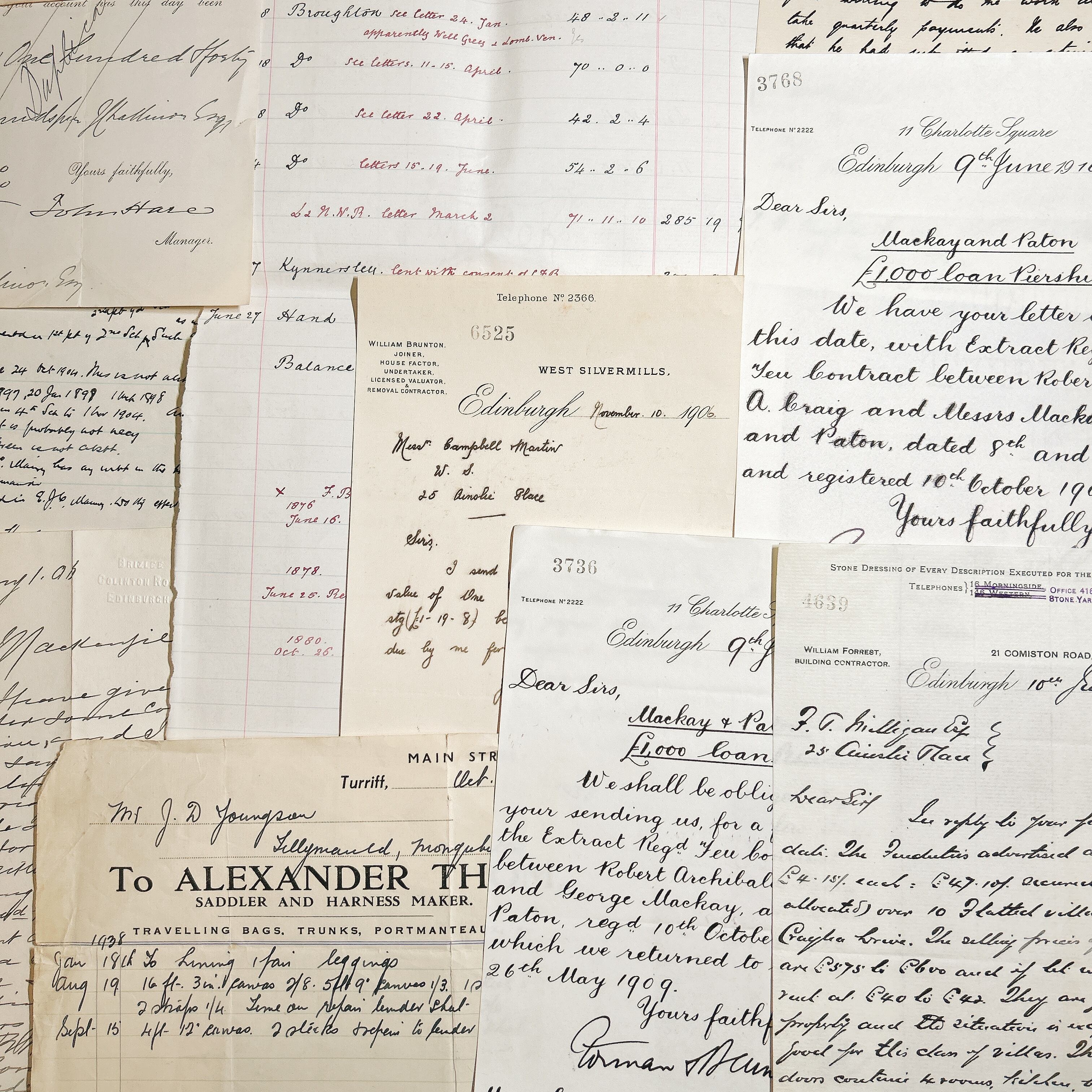 これらの書類は、様々な形式の手書き文字や内容が含まれており、時代を超えた物語を伝えます。内容には、手紙、公式な書類、取引記録、手書きのメモなどが含まれており、当時の生活や文化、商業活動の一端を垣間見ることができます。それぞれの書類が異なる書体やインクで書かれており、アンティーク感を一層引き立てています。