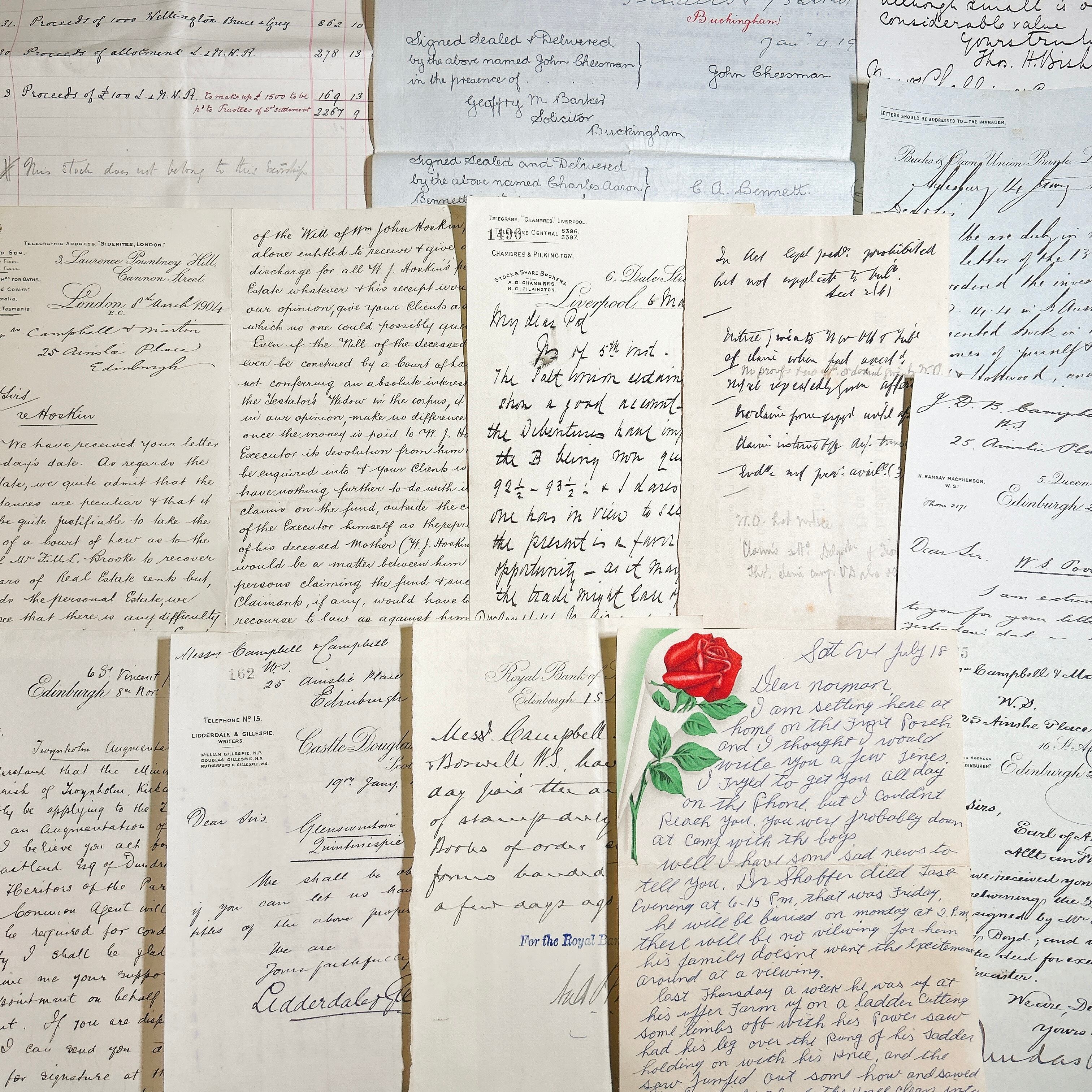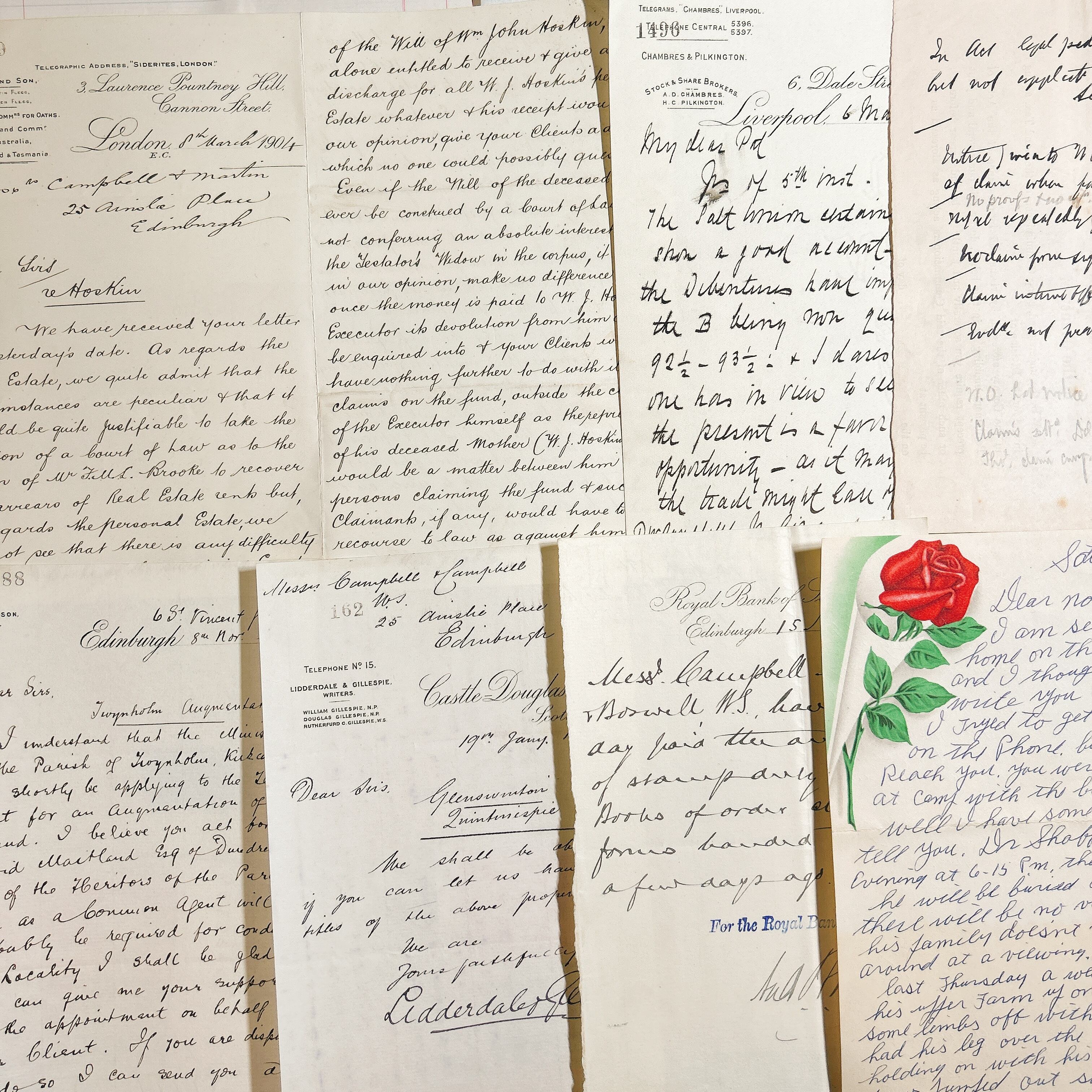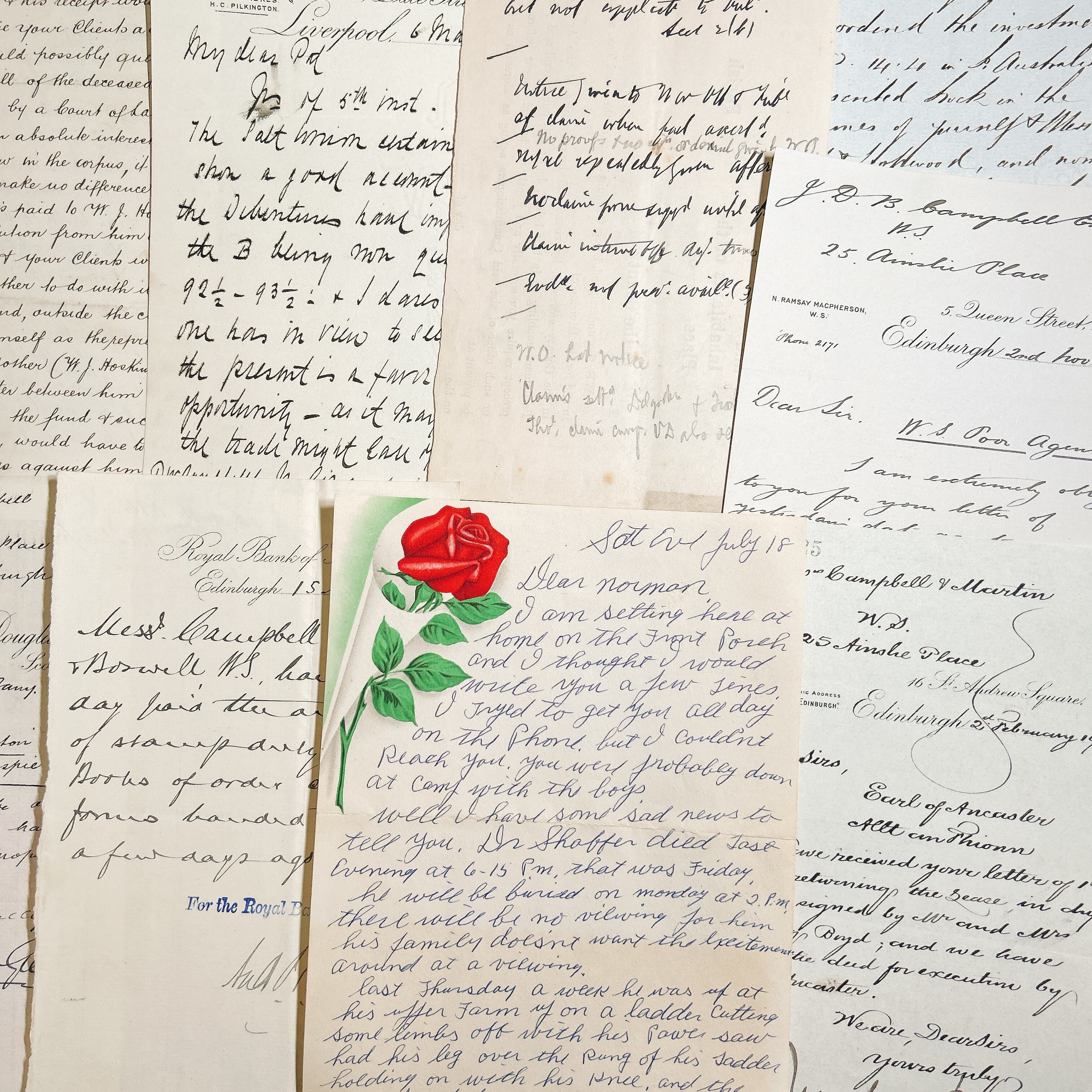 これらの書類は、様々な形式の手書き文字や内容が含まれており、時代を超えた物語を伝えます。内容には、手紙、公式な書類、取引記録、手書きのメモなどが含まれており、当時の生活や文化、商業活動の一端を垣間見ることができます。それぞれの書類が異なる書体やインクで書かれており、アンティーク感を一層引き立てています。