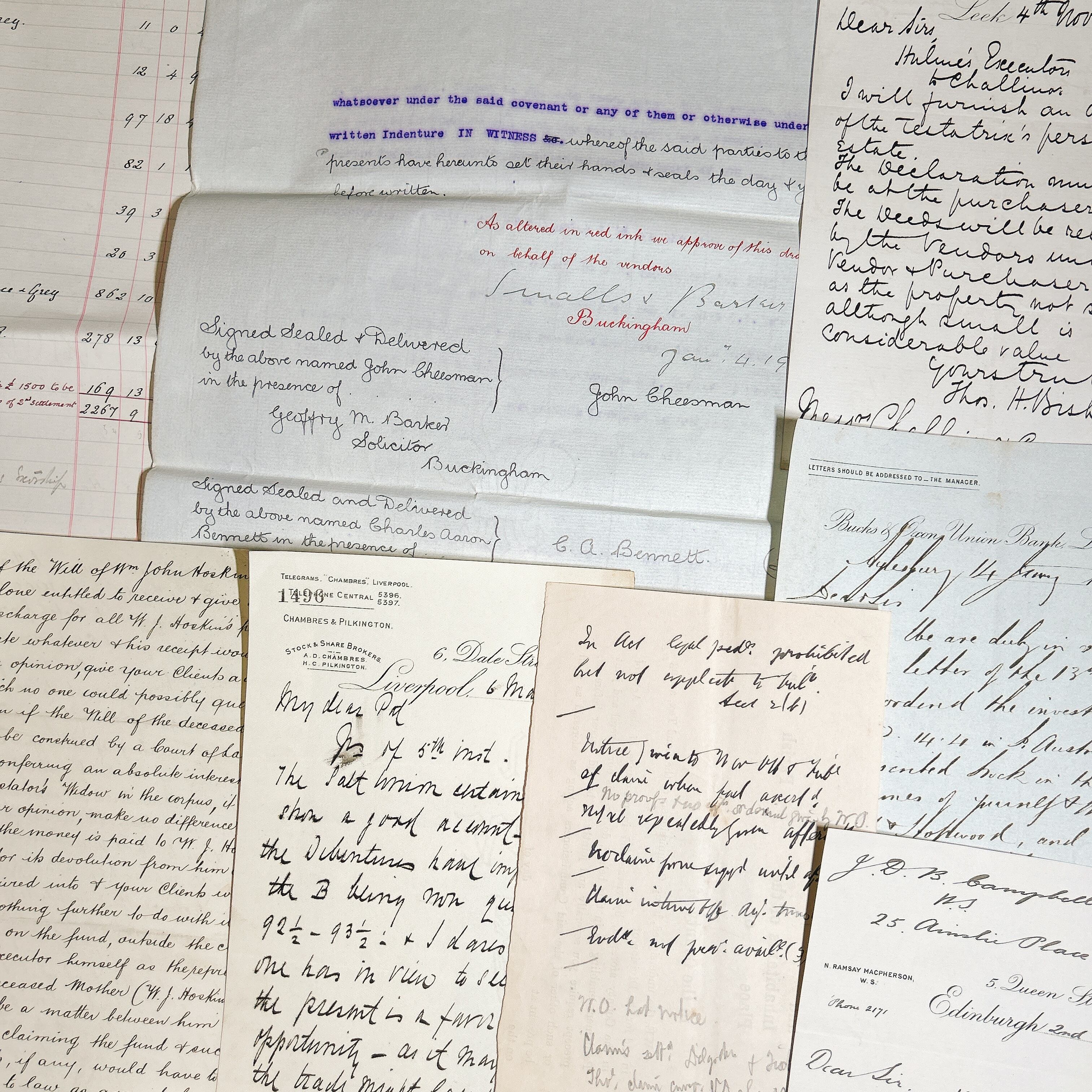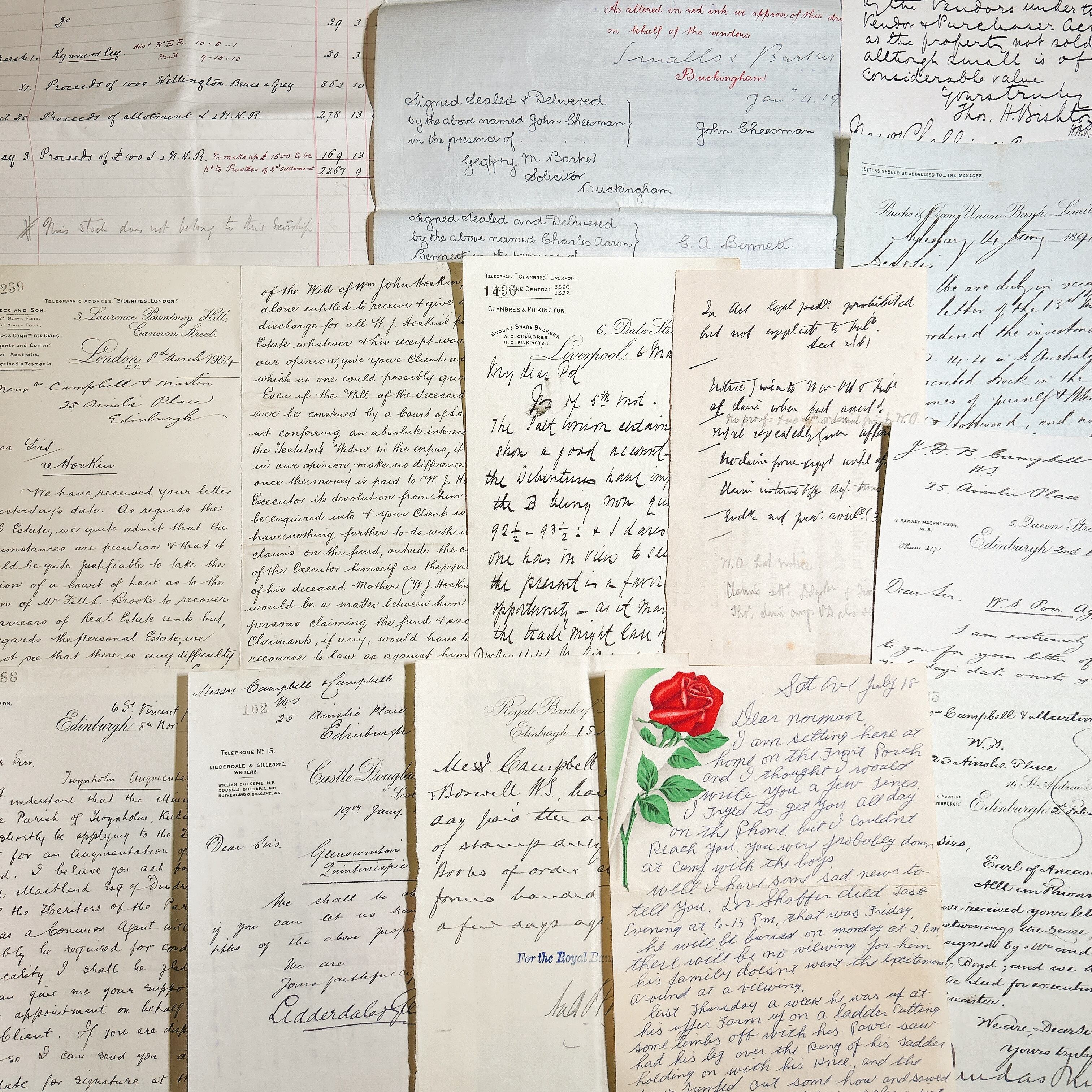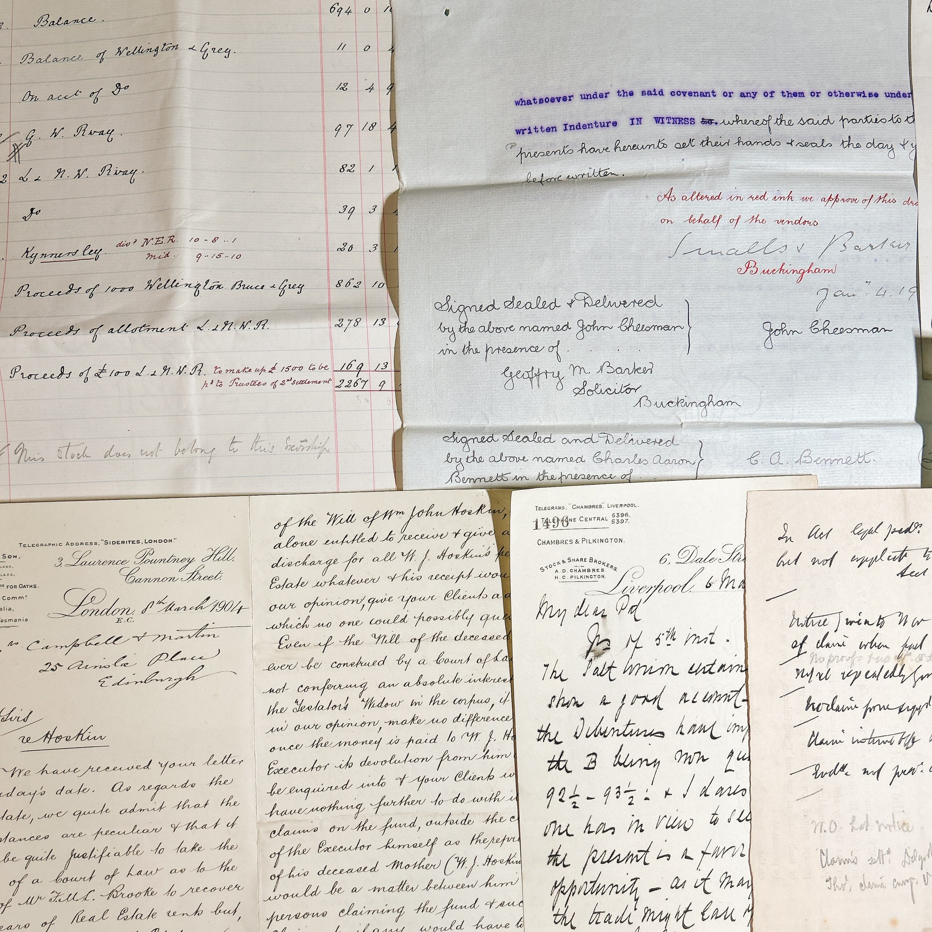 これらの書類は、様々な形式の手書き文字や内容が含まれており、時代を超えた物語を伝えます。内容には、手紙、公式な書類、取引記録、手書きのメモなどが含まれており、当時の生活や文化、商業活動の一端を垣間見ることができます。それぞれの書類が異なる書体やインクで書かれており、アンティーク感を一層引き立てています。