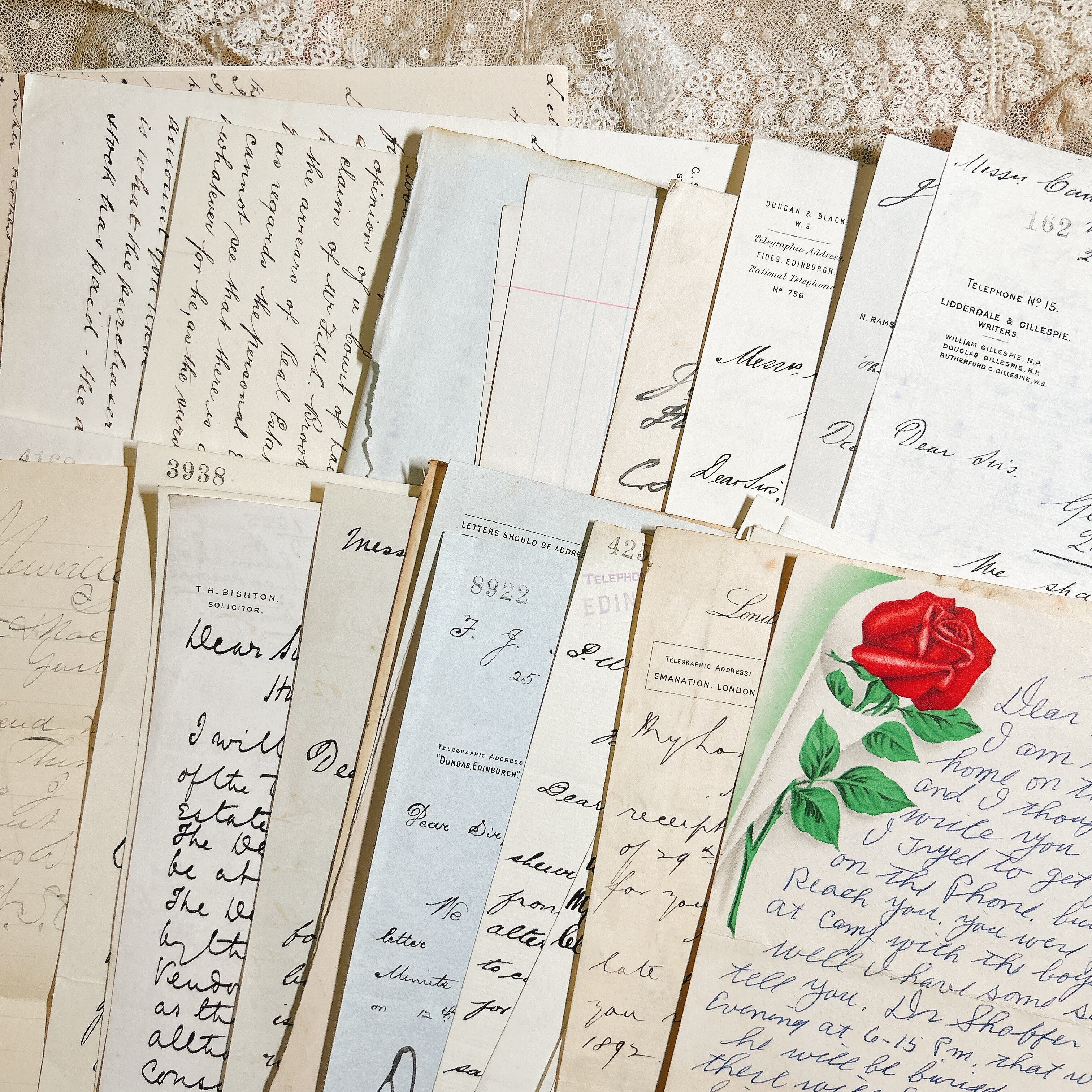 アンティークの手書き書類30枚セットです。19世紀から20世紀初頭にかけて書かれた手紙や記録文書が含まれており、歴史的な雰囲気を感じられる大変貴重な品です。