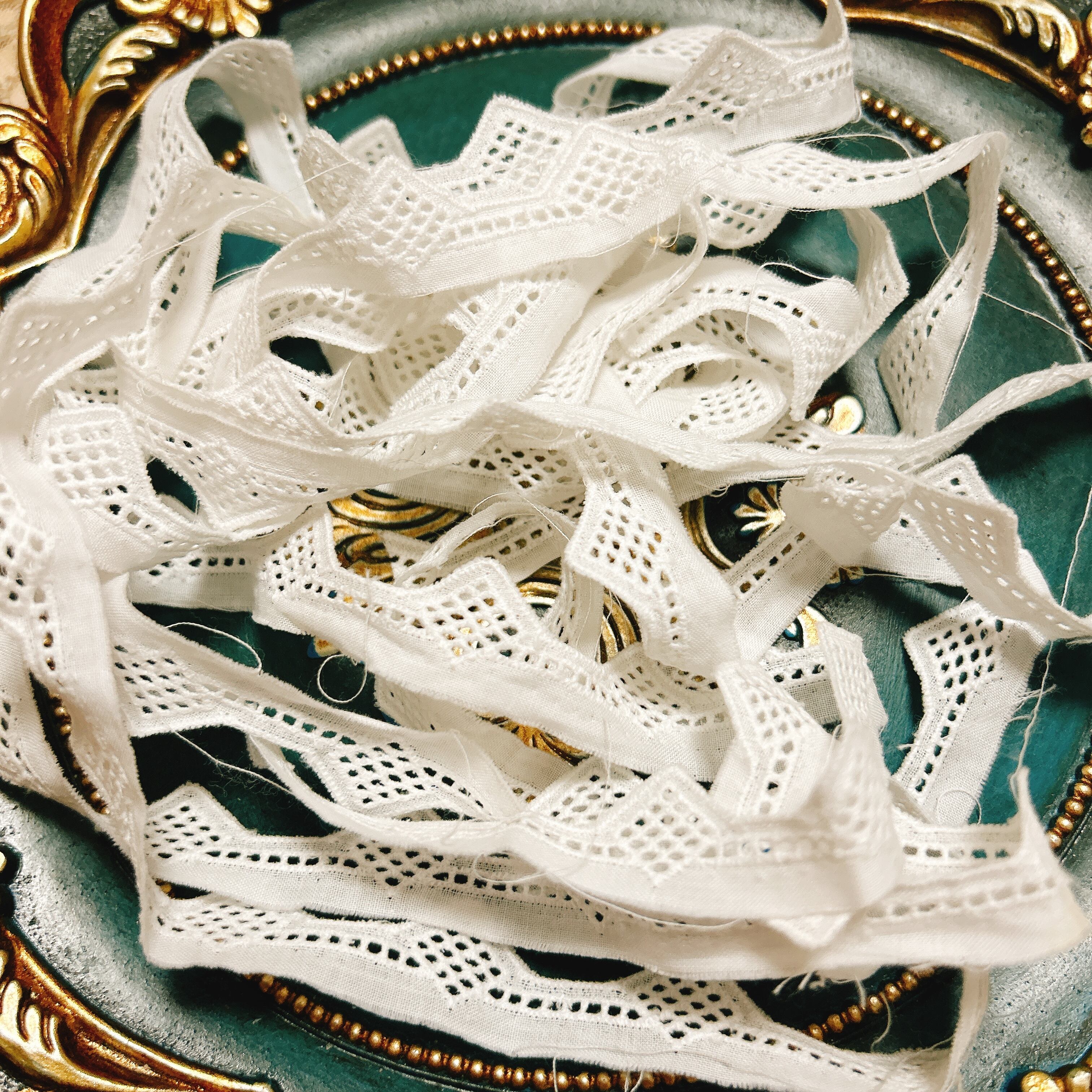 こちらは繊細な刺繍と軽やかな透かし模様が魅力の、アンティーク・コットンレースです。柔らかなホワイトコットン地に幾何学模様のカットワーク刺繍が施されており、ギザギザと波打つスカラップ状のエッジが優雅な印象を与えます。小さな窓のような穴が連なるデザインは、清楚でありながらも程よい装飾性を持ち、作品に軽やかさと奥行きを添えてくれるアイテムです。