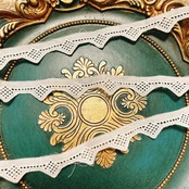 幅は約1.5cm前後。ドール服やアンティークテイストのリネン雑貨、ハンドメイドカードやコラージュ、ヴィクトリアン系の布小物制作など、幅広いジャンルに対応する万能なレースです。糸はしっかりしており、洗いをかけても型崩れしにくいしなやかさを備えています。