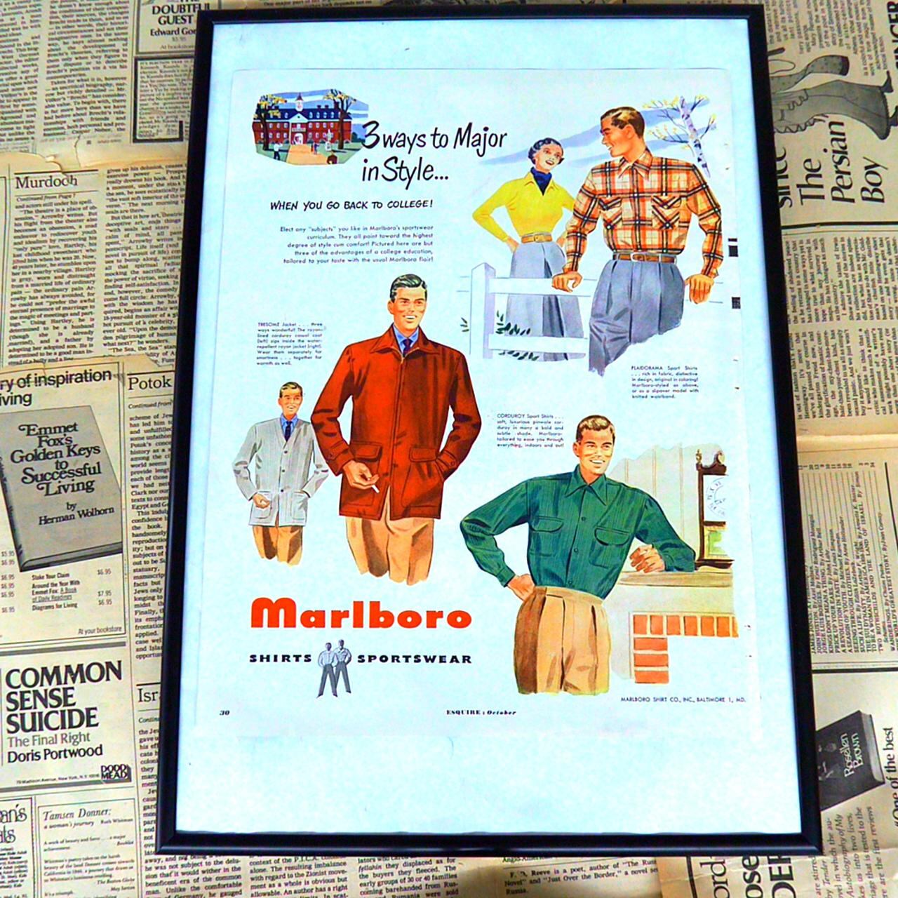 Marlboro Shirt Co., Inc.は、アメリカを代表するシャツおよびスポーツウェアのメーカーです。高品質な素材とクラシカルなデザイン、そして時代を超えて愛されるスタイルで知られ、主に紳士向けのカジュアルウェアやドレスシャツを提供しています。特に1950年代から1970年代にかけて、アメリカン・トラディショナルファッションの象徴的ブランドとして、多くの男性たちに選ばれてきました。学生からビジネスマンまで幅広い層に向けた製品展開が特徴で、丈夫さと着心地の良さが高く評価されています。広告では「スタイルで専攻しよう」というキャッチコピーとともに、カレッジライフやアウトドアシーンに合う洗練された装いを提案しており、着る人の個性と自信を引き立てるブランドです。