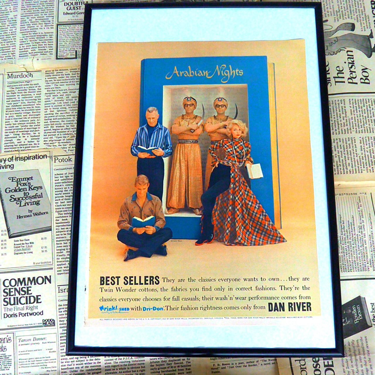 Dan Riverはアメリカに本拠を置く繊維・ファブリックメーカーで、特にコットンやポリエステル混紡生地など高品質な織物を生産する企業として知られています。創業は19世紀と長い歴史を持ち、家庭用テキスタイルからファッション用途の生地まで幅広い製品ラインナップを展開してきました。1950年代から1970年代にかけては、洗濯後のシワになりにくい性能や、色柄の多彩さを打ち出した広告キャンペーンでアメリカの家庭に広く浸透。特に“Wrinkl-Shed”などの独自技術を持つ生地は、アイロン不要で手間いらずな点が消費者に高く評価されました。Dan Riverのテキスタイルは、時代のライフスタイルやファッションに寄り添いながら、品質と機能性を両立したブランドとして多くの人々に愛され続けています。