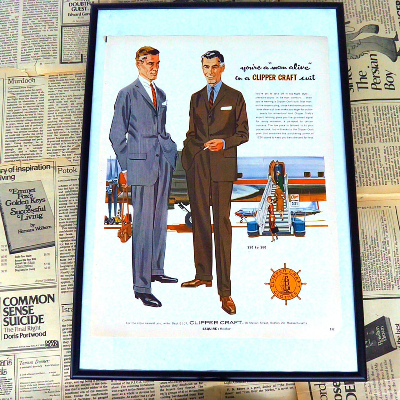 Clipper Craftは、アメリカ・ボストンを拠点とする歴史ある紳士服ブランドです。質の高い素材と卓越した仕立て技術を誇り、1950年代から1970年代にかけて全米各地の小売店をネットワークし、多くの男性に手頃な価格で高品質なスーツを提供してきました。自社工場による大量生産と厳選したデザインで、ビジネスマンやファッショナブルな男性たちから信頼を集めていました。『Esquire』などの有名雑誌でも頻繁に広告を展開し、現代でもヴィンテージファッション愛好家に根強い支持を持っています。