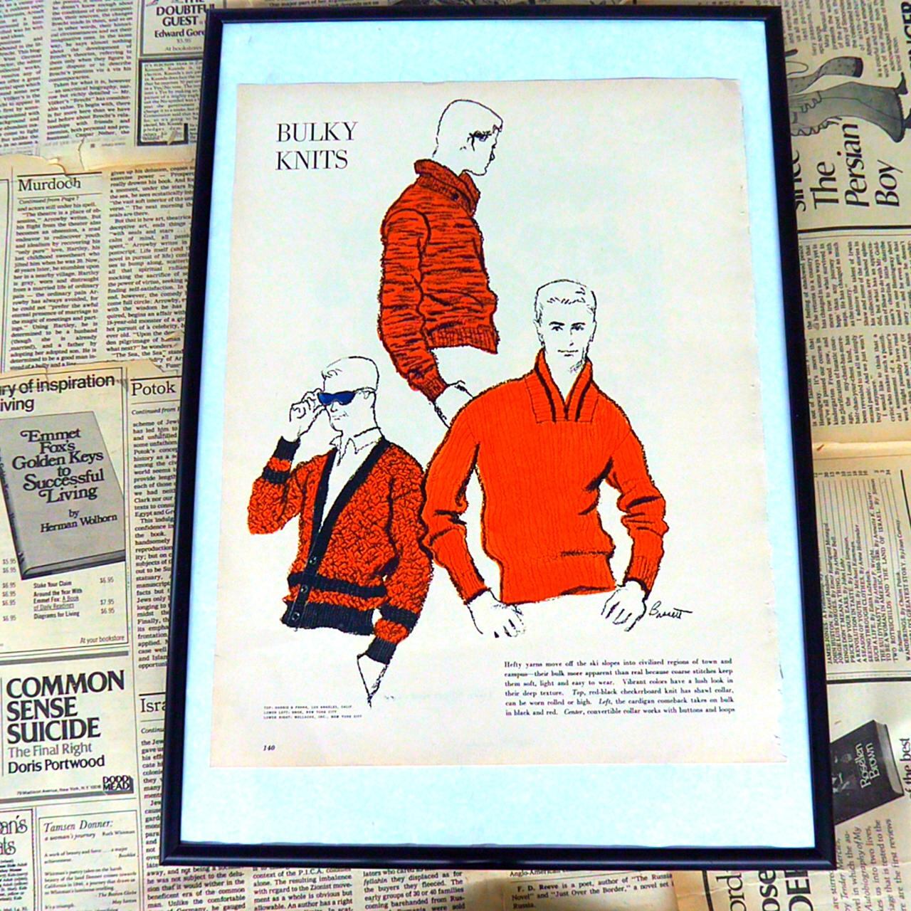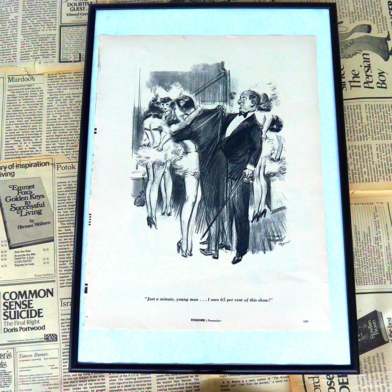 このイラストは、舞台裏らしき場所でショーガールたちとタキシード姿の紳士が描かれているユーモラスなワンシーンです。キャプションには「ちょっと待ちなさい、若者……このショーの65パーセントは私の持ち分だ!」とあり、権力や資本の力で物事を左右しようとする大人と、ショービジネスの華やかな世界を対比的にユーモラスに描いています。観客には見えない舞台裏での人間模様や、当時のショービジネス界の裏事情を風刺している点が特徴的です。繊細な線描と躍動的なポーズが、ショーガールたちの華やかさと、紳士の自信に満ちた態度を鮮明に表現しています。エスクワイヤー誌らしい大人のウィットが効いたイラストとして、お部屋や店舗のディスプレイにもおすすめです。