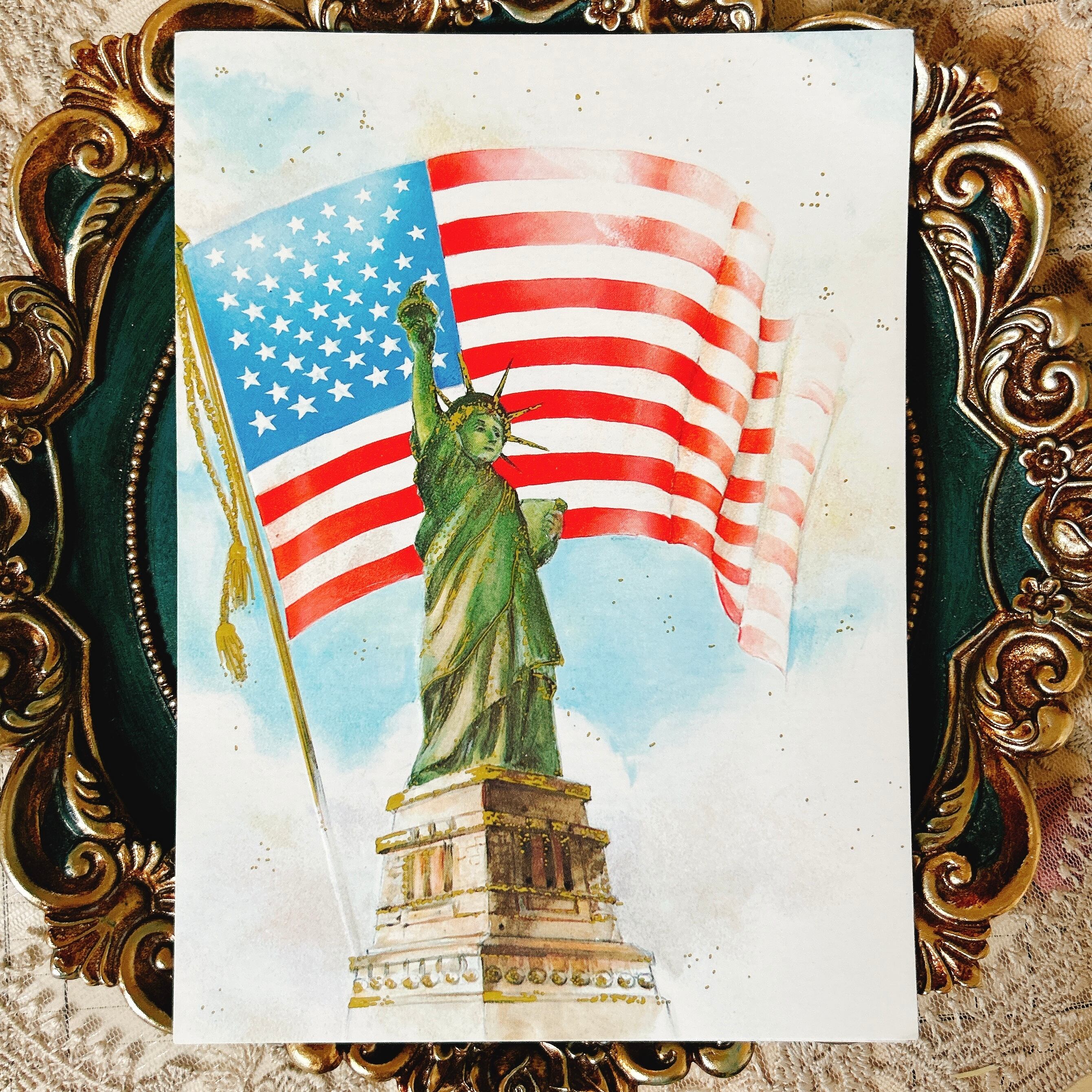 こちらは、アメリカの象徴とも言える自由の女神像と星条旗を描いたヴィンテージのグリーティングカードです。鮮やかな青空を背景に、力強く掲げられたアメリカ国旗が風になびき、その前に堂々と佇む自由の女神像が大きく描かれています。堂々とした筆致と水彩タッチの柔らかさが融合したデザインで、見る者の心にアメリカの誇りと平和への願いを強く訴えかけてくるような印象を与えます。背景には繊細な金箔の星のようなドットが施されており、控えめながらも祝祭感を演出しています。
