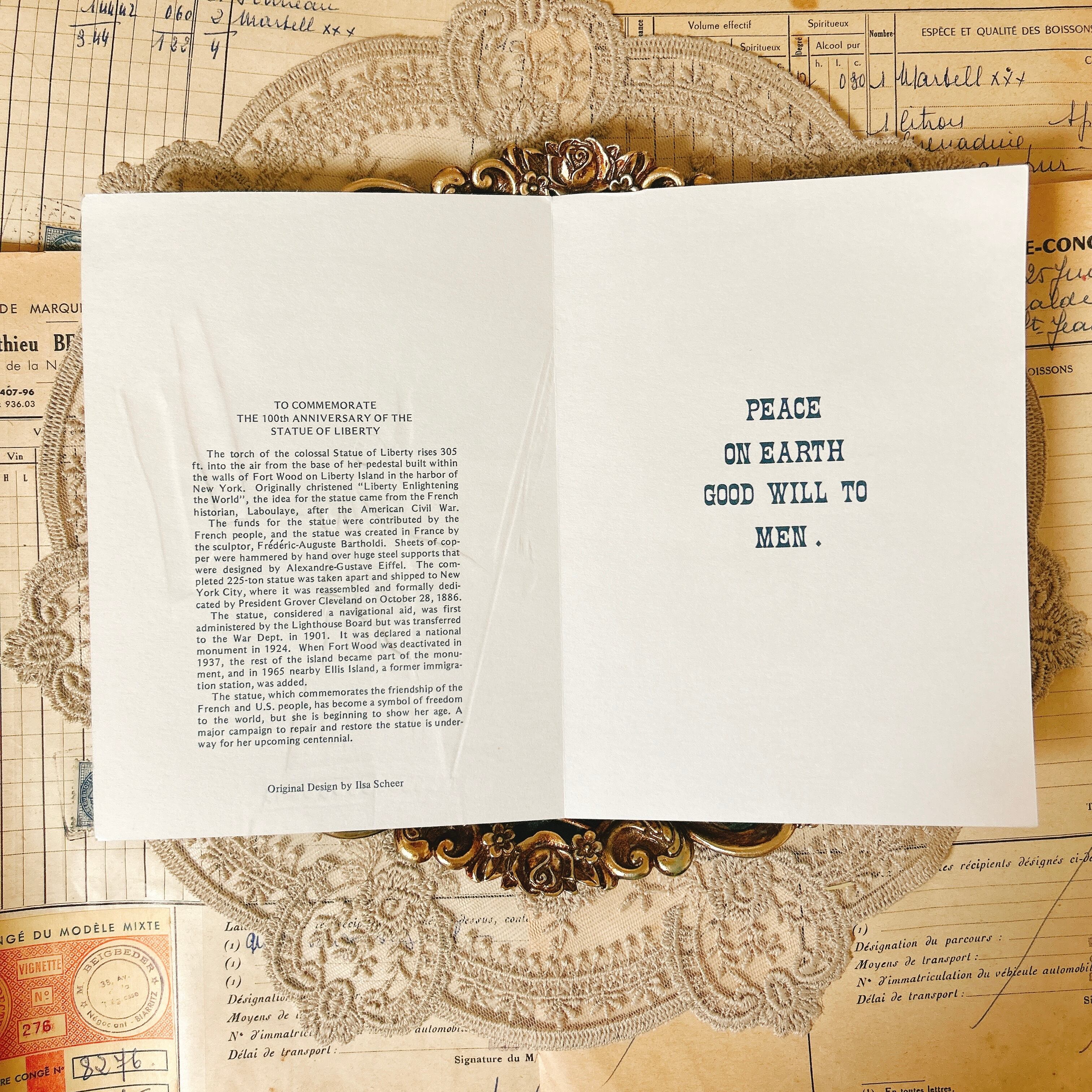 カードの内側には、左面に自由の女神建立100周年を記念した文章が綴られており、その歴史と意義について丁寧に紹介されています。フランスからの贈り物であり、希望と自由の象徴として世界中の移民を迎え入れてきたこの像の背景を改めて伝えることで、カードそのものが一種の歴史的ドキュメントとしても機能しています。右面にはシンプルに「PEACE ON EARTH / GOOD WILL TO MEN.(地上に平和を、人々に善意を)」という言葉がレタープレス風の濃紺文字で配されており、非常に静謐で荘厳な雰囲気を漂わせています。