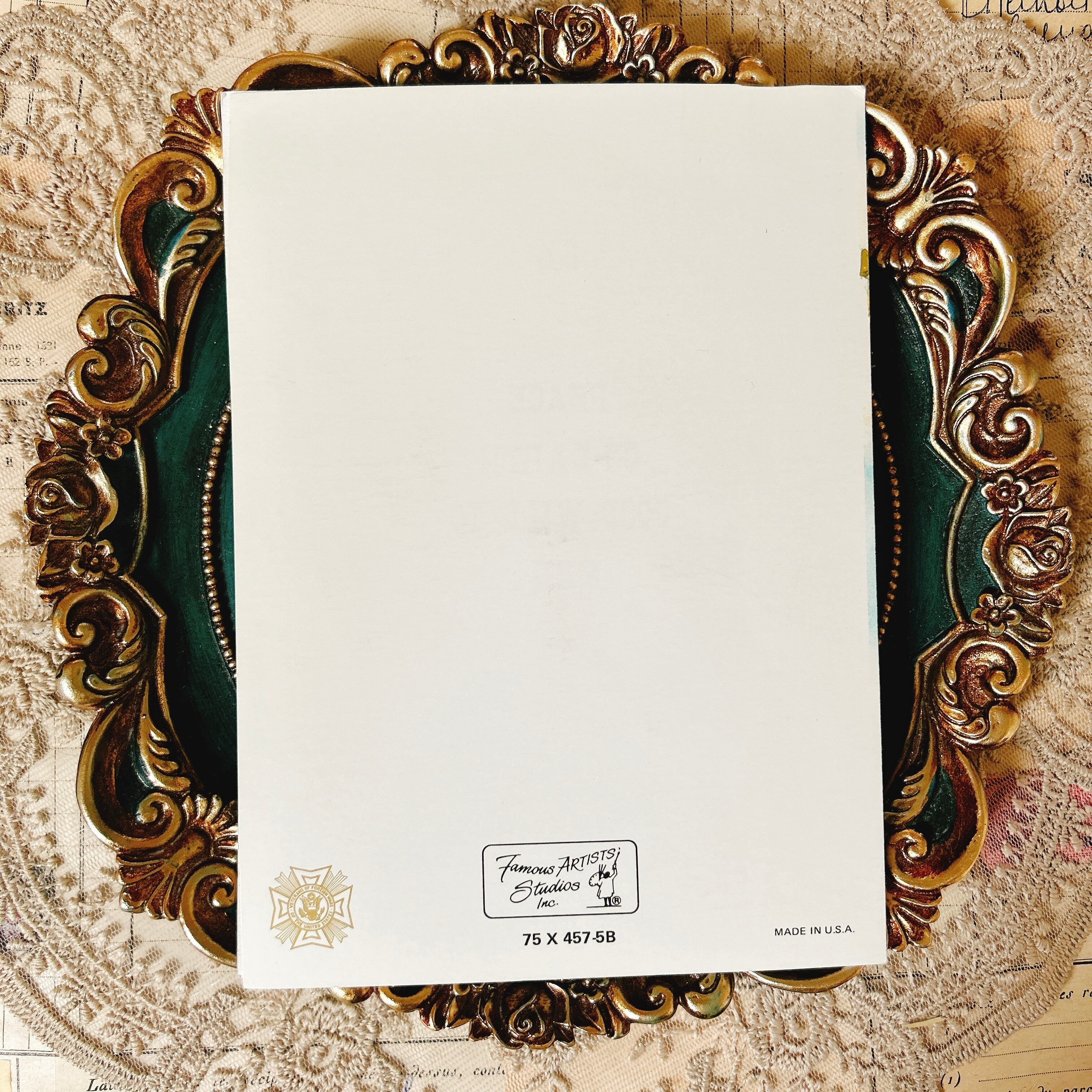 背面にはFamous Artists Studios Inc.のロゴが印刷されており、正規のアーティスト制作によるクオリティの高さを保証しています。カード全体は光沢を抑えたやや厚手の紙で作られており、未使用の状態ですので贈り物としてはもちろん、額装してアメリカンヴィンテージインテリアの一部としてディスプレイするのにも最適です。特に愛国的な記念日やインディペンデンス・デイ、また平和への願いを込めた展示テーマにふさわしい一枚としておすすめできます。