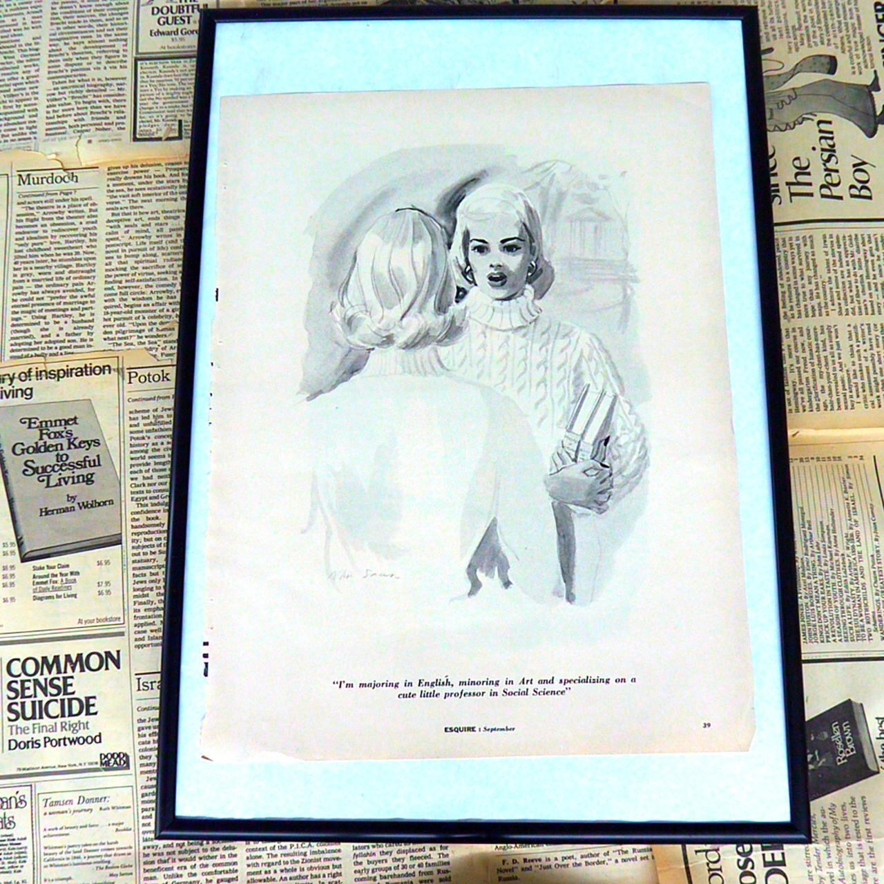 このイラストは、壁際に縛られた男性と、目の前に並ぶ銃を持った多数の兵士たちが描かれた風刺的なワンシーンです。男性はリラックスした様子で煙草をくゆらせながら「本当にマイルドだ……」と語りかけており、いかにも処刑直前という緊迫した場面のはずが、タバコの感想を述べることでその状況をユーモラスに転化しています。イラストレーターJohn Dullioによる独特のタッチで、背景にはスペイン風の建物や青い空が描かれています。処刑隊と囚人という重いテーマを逆手に取って、タバコ広告などでよく見られる「マイルドさ」を皮肉る内容となっており、洒落たブラックユーモアが光る1枚です。この作品は1970年代のエスクワイヤー誌に掲載されたもので、当時の大人の知的な笑いを象徴するイラストとしてもおすすめです。