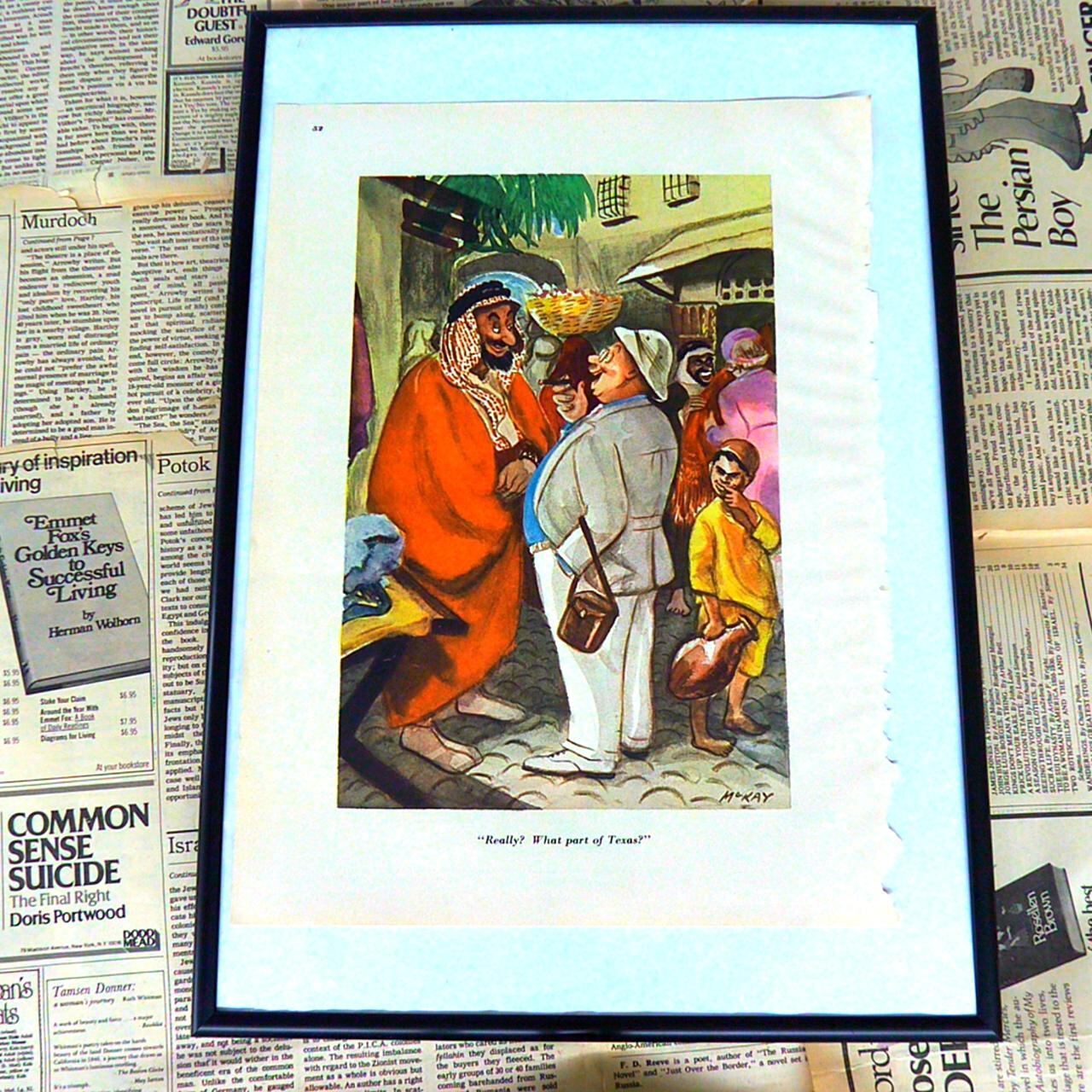 このイラストは、海外の市場と思しき場所で、伝統的な民族衣装をまとった男性と観光客風の中年女性が会話している様子を描いています。キャプションの“Really? What part of Texas?”(「本当に?テキサスのどのあたり?」)は、異国の文化や風貌に対してアメリカのテキサスと結び付けてしまうという、無知な旅行者のユーモラスな勘違いを風刺しています。背景には色鮮やかな衣服を着た通行人や、果物を入れた籠を頭に載せる女性、好奇心いっぱいにこちらを見ている子どもなどが描かれ、異国情緒にあふれた活気ある市場の雰囲気が伝わってきます。イラスト全体は明るくユーモラスなタッチで描かれており、旅行や異文化交流のエピソードをコミカルに切り取っています。壁に飾ることで、見る人のクスリと笑える会話や異文化の楽しさを感じさせてくれる一枚です。