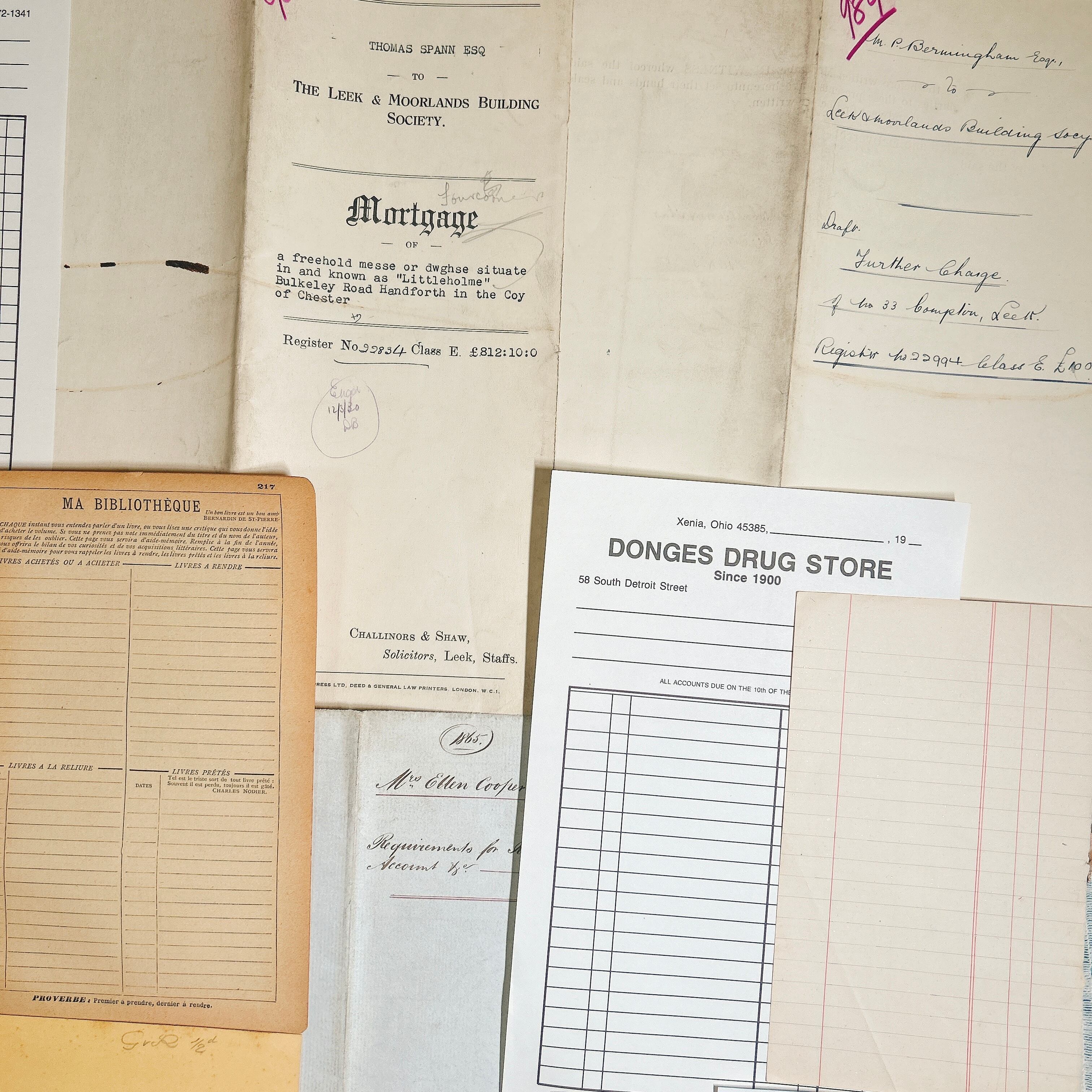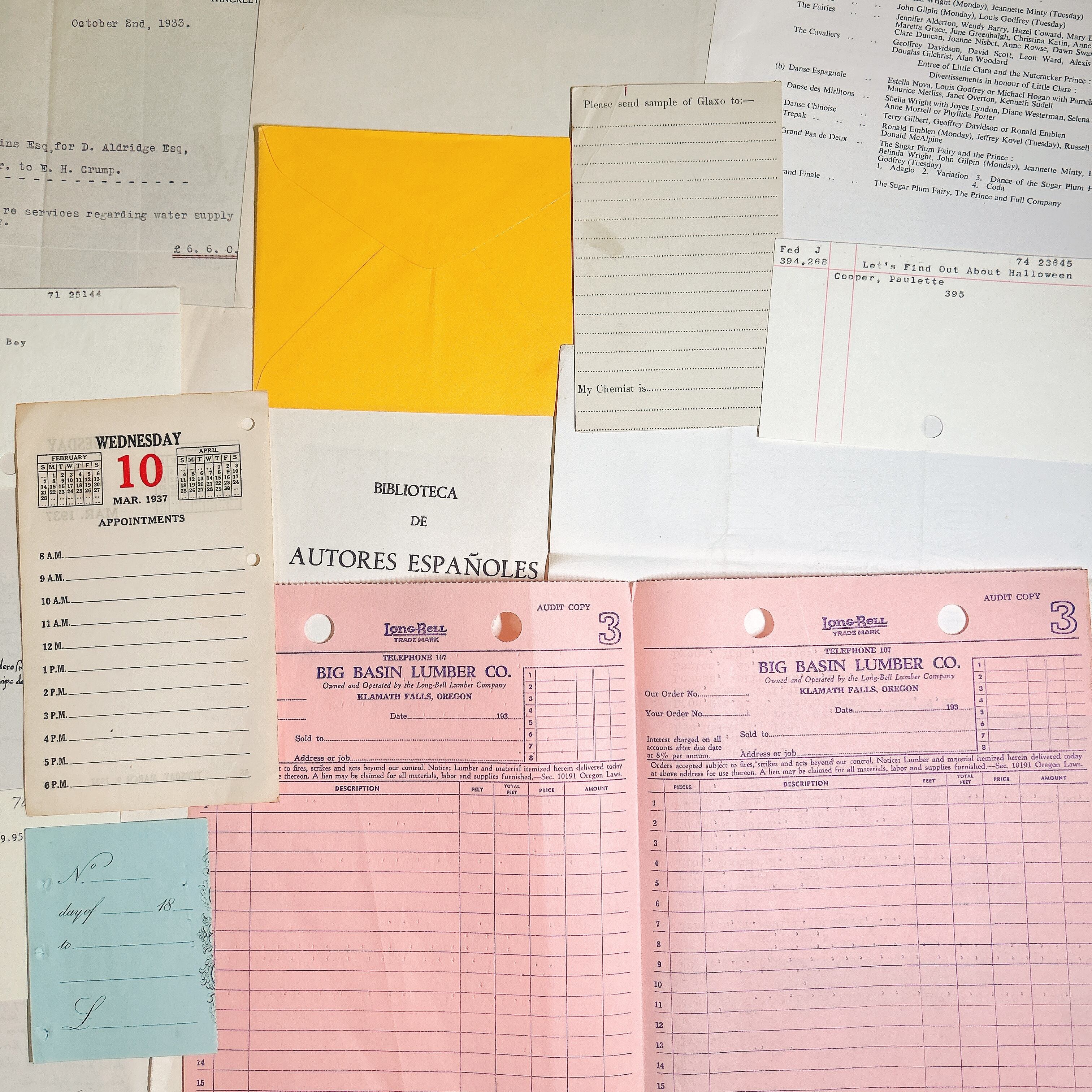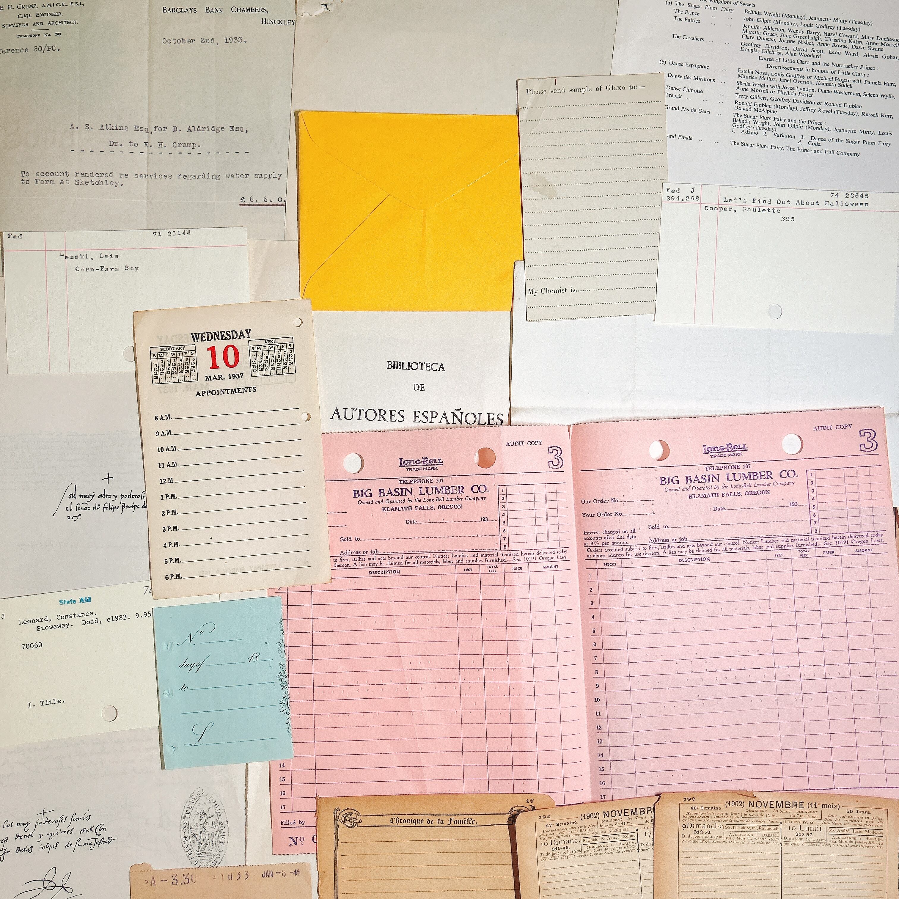 セットには年代を感じさせる書類や便箋、封筒などが含まれており、紙質やデザインもさまざま。特にアンティークの手触りや雰囲気を楽しみたい方におすすめです。