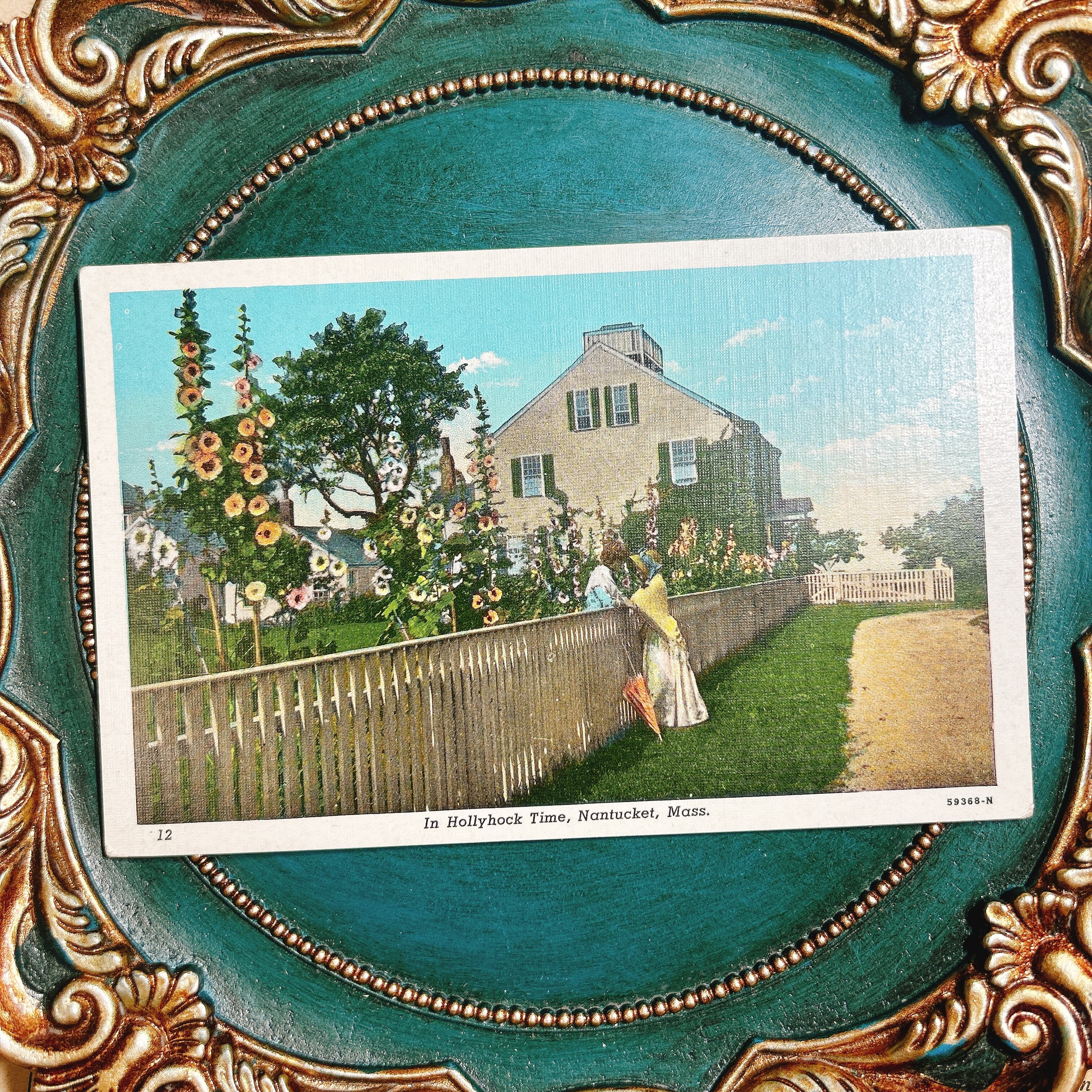 表面はリネン調の質感があり、印刷には鮮やかな発色と柔らかなトーンが組み合わさっており、実景に彩色を加えたリトグラフ技法が使用されています。紙質は厚手でしっかりとしており、保存状態も非常に良好です。ガーデン愛好家やアメリカ東海岸の風景、古き良き田舎暮らしの雰囲気が好きな方にとって、インテリアやコレクションに最適な一枚です。ナンタケットの穏やかな夏を今に伝える、優美なヴィンテージポストカードです。