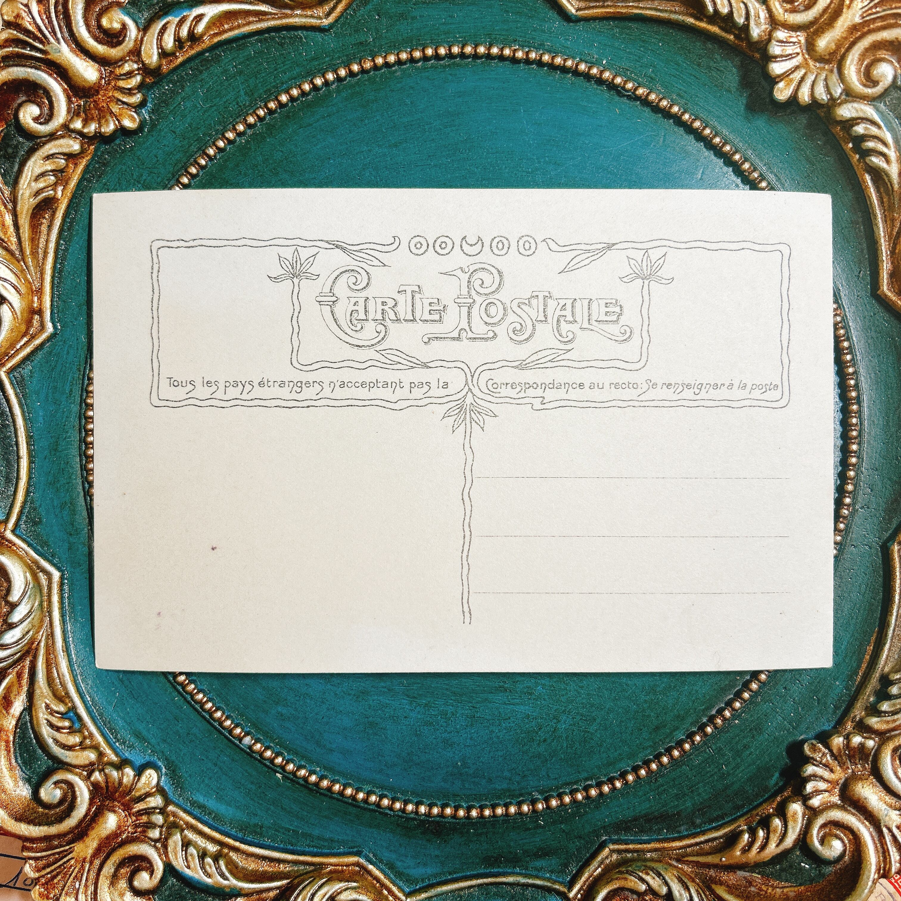 裏面は未使用で、当時のポストカードに見られる美しいアール・ヌーヴォー風の装飾文字「CARTE POSTALE」が印刷されており、通信欄と宛名欄が明確に分かれたデザインになっています。海外発送についての注意書きも記載されており、1900年代初頭の国際郵便仕様に則った形式です。