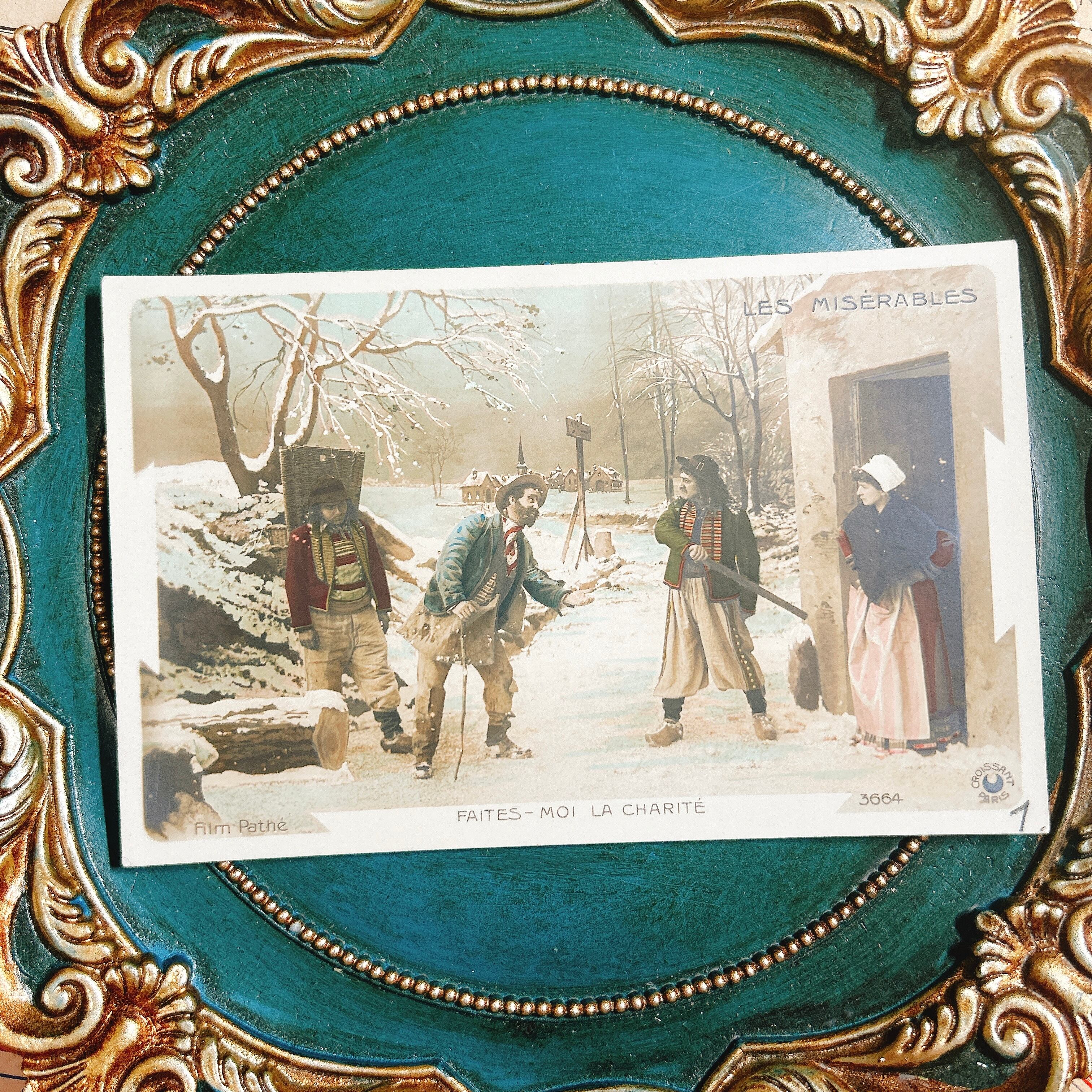 『レ・ミゼラブル』の映像文化とフランスの絵葉書芸術が融合した貴重な作品であり、文学・映画・郵趣いずれの観点から見ても収集価値の高い一枚です。保存状態も良好で、当時の社会情勢や美意識を伝える資料としても魅力的なアンティークカードです。