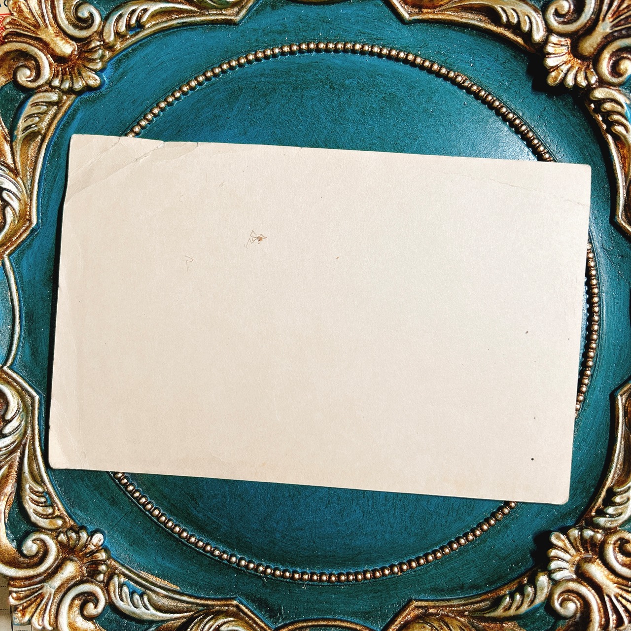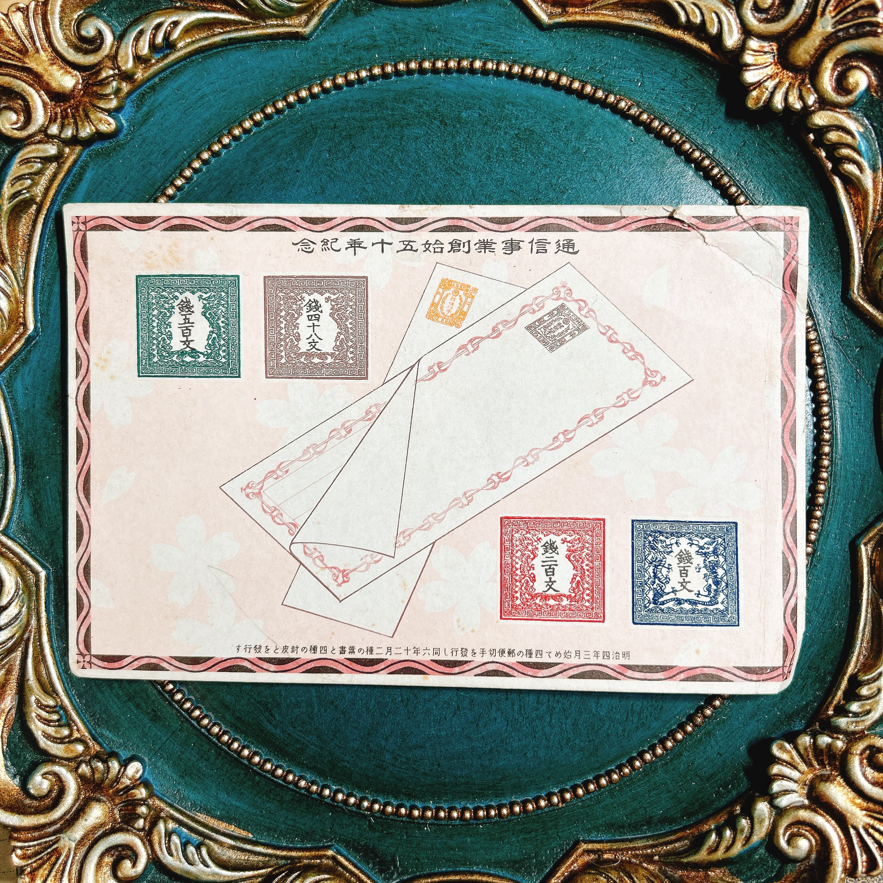 こちらは、日本の逓信省による「通信事業創始五十年記念」カードです。明治時代の郵便制度創設から50周年を記念して発行されたもので、表面には当時の郵便切手や封筒の意匠が精緻に再現されています。描かれているのは、一銭五厘、四十八文、十銭などの額面を持つ切手のデザインや、赤い唐草模様が施された便箋・封筒など、明治初期の郵便用品を象徴するアイテムです。背景には淡い桜模様があしらわれ、全体として柔らかな和の雰囲気を感じさせる一枚に仕上がっています。下部には印刷物の法的告示に関する記述が小さく入っており、公式な記念品として発行されたことがわかります。裏面は無地で書き込みはありません。コレクターズアイテムとしても価値が高く、日本近代郵便史を語る上で貴重な資料となるカードです。