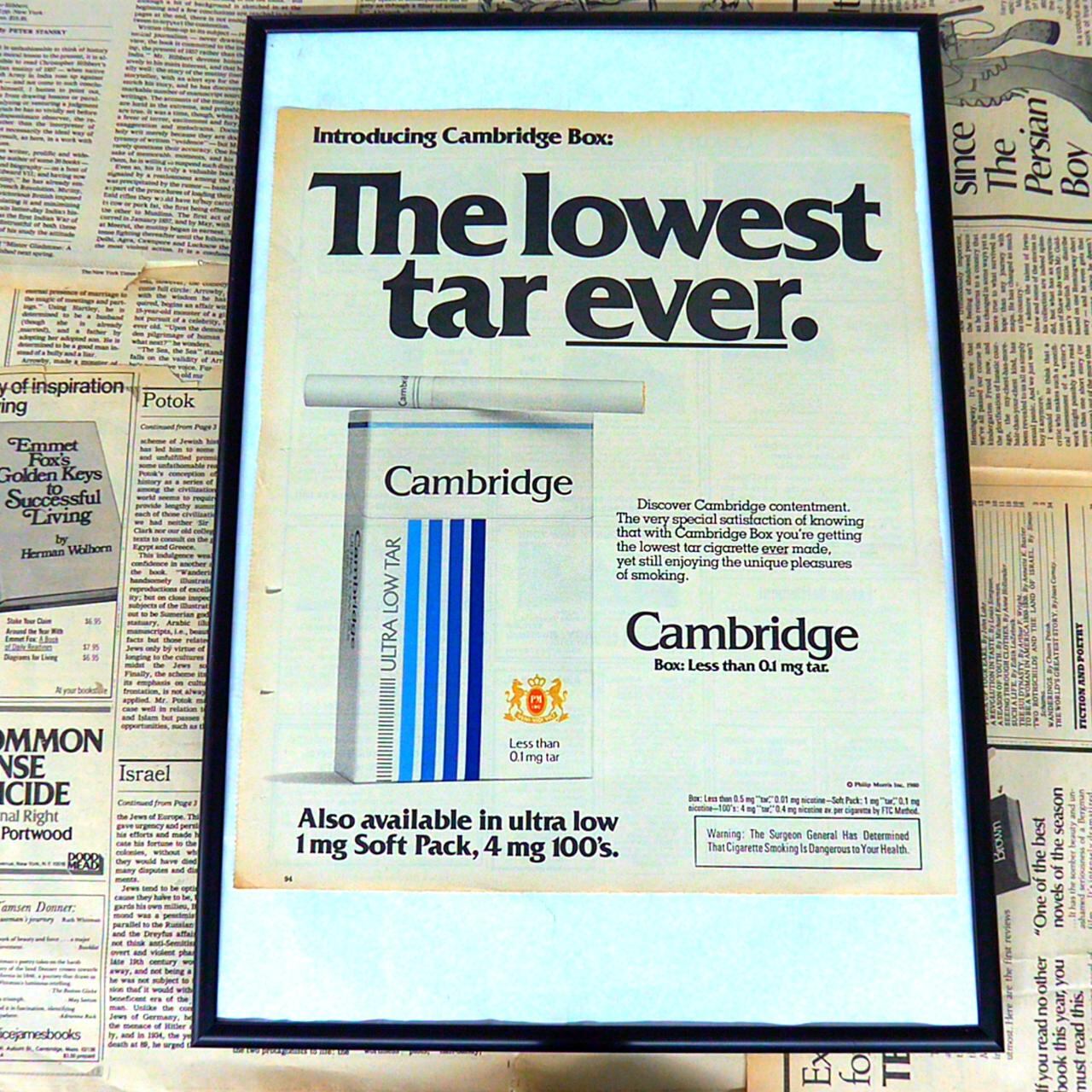 Cambridgeは、かつてアメリカで展開されていたタバコブランドです。1970年代、健康意識の高まりを受けて「超低タール」というコンセプトで登場し、安全志向の愛煙家をターゲットにしました。特に本広告に見られる「最も低いタール値」を謳い文句に、従来のタバコよりも健康リスクが低いと宣伝。パッケージデザインもスマートで洗練されたイメージを打ち出し、現代的で理性的な消費者にアピールしました。Cambridgeは時代背景を反映し、健康志向と喫煙の両立を目指したユニークなブランドです。
