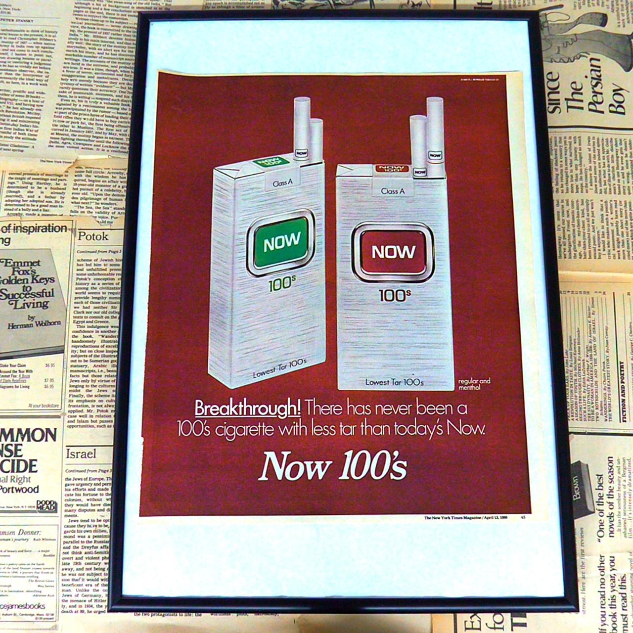 Nowは1970年代から1980年代にかけてアメリカで販売されていたタバコブランドです。低タール・低ニコチンを強く打ち出したブランドとして登場し、健康志向が高まる社会背景の中で『よりクリーンな喫煙』を求める消費者層に向けて商品展開を行いました。Nowの広告は、従来の紙巻きタバコに比べてタール含有量が非常に少ないことを特徴として前面に押し出し、他ブランドとの差別化を図っています。メンソールやレギュラーといったバリエーションも展開し、時代の流れに合わせたプロモーションを展開してきたブランドです。