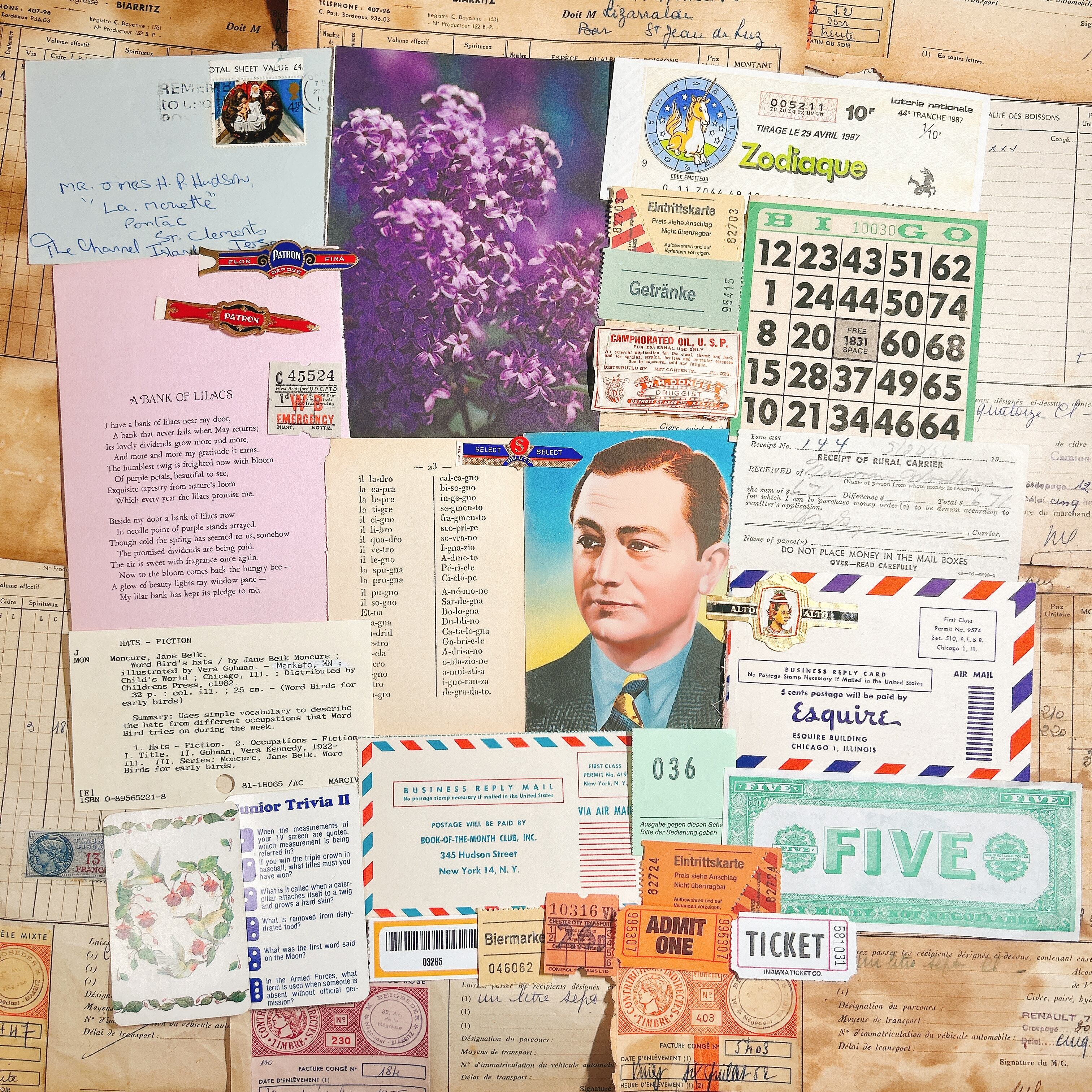 こちらは、異国の時を越えた物語がぎゅっと詰め込まれた、アンティーク・ヴィンテージの紙もの30枚セットです。封筒、領収書、乗車券、診療明細、雑誌の申し込み用紙、絵葉書、チケット、切手などが、年代や国を超えて1つのセットに集められています。それぞれの紙片に書かれた手書きの文字、スタンプ、印刷されたデザインには、使われていた当時の空気や生活がそのまま息づいています。