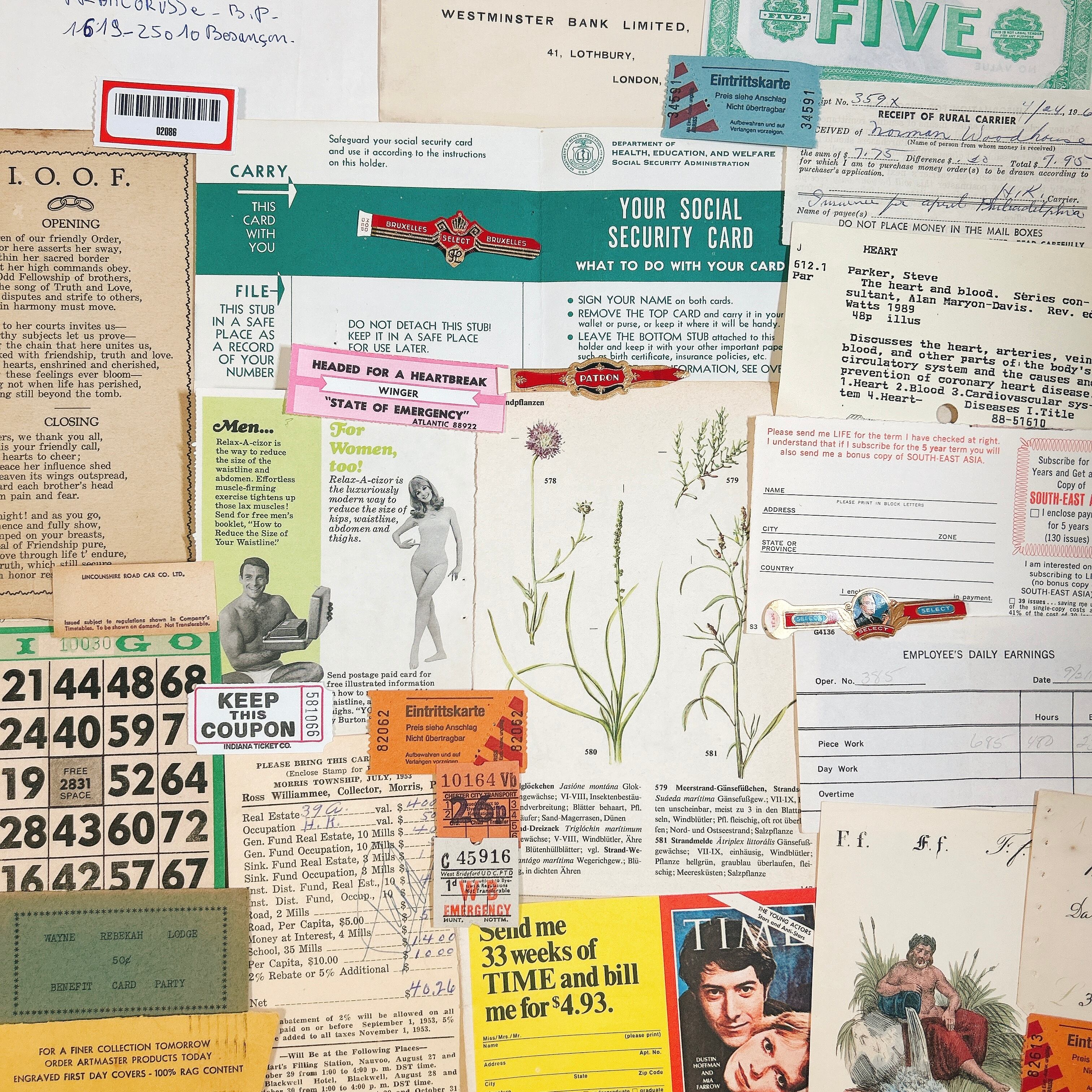 例えば、アメリカの獣医の診察明細には、1950年代の人々の暮らしぶりや、農村部でのやりとりが感じられます。封筒には、切手と手書きの美しい筆致が残され、まるで遠く離れた土地から届いた手紙を開くようなときめきを与えてくれます。ドイツ語で書かれたチケットは、どこかの劇場や列車の記憶を彷彿とさせ、過去の旅人たちの足跡を想像させます。カラフルな広告や、イラストが描かれたカードは、当時の印刷技術や美意識も垣間見せてくれます。