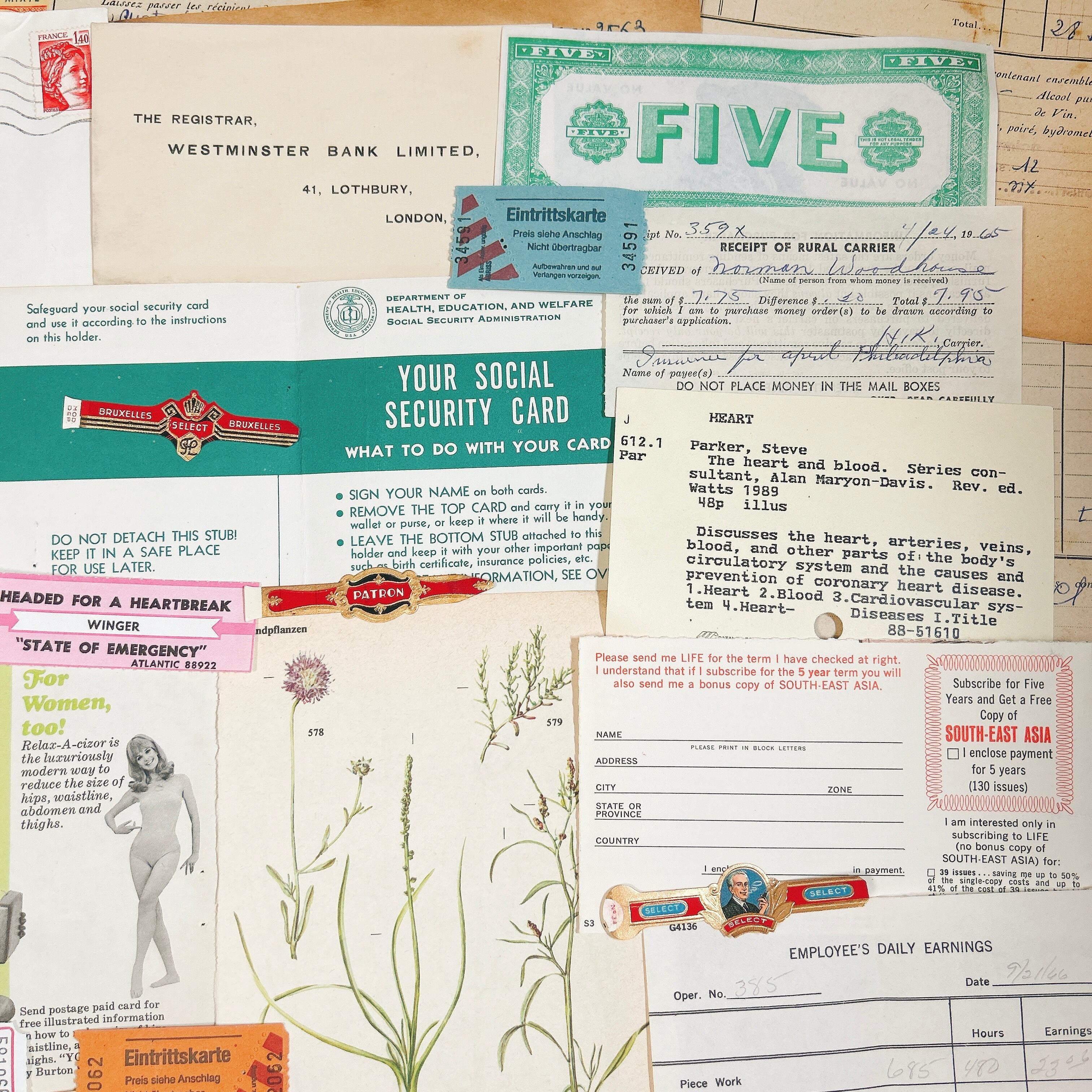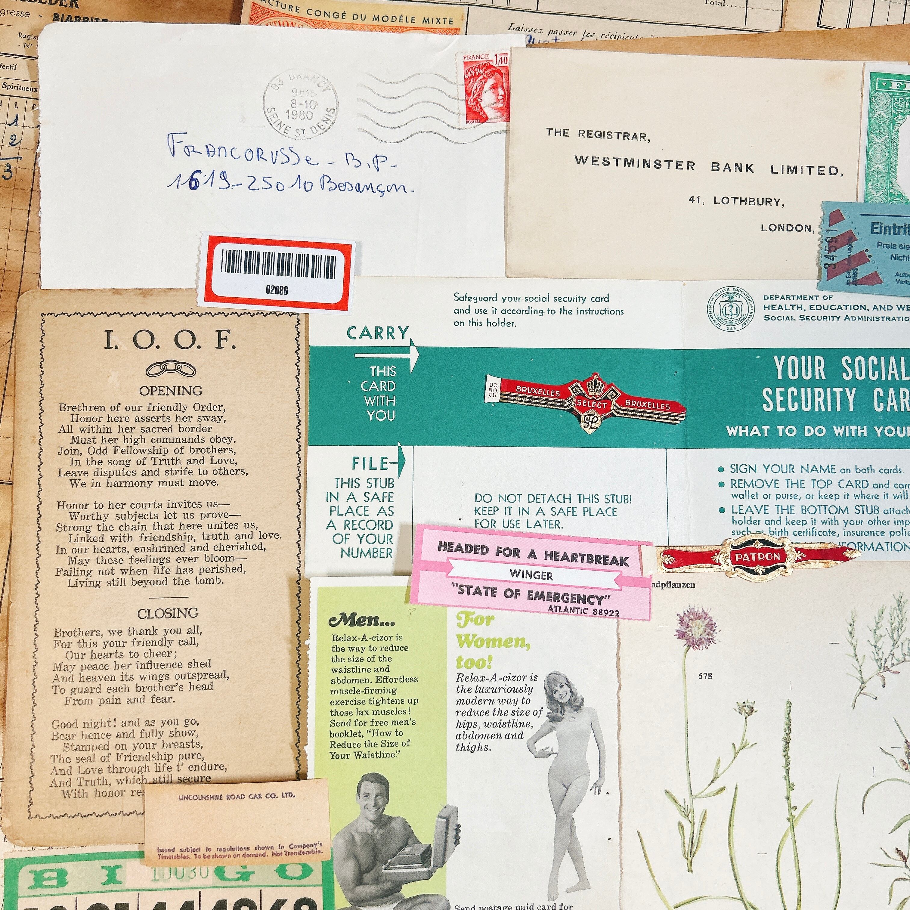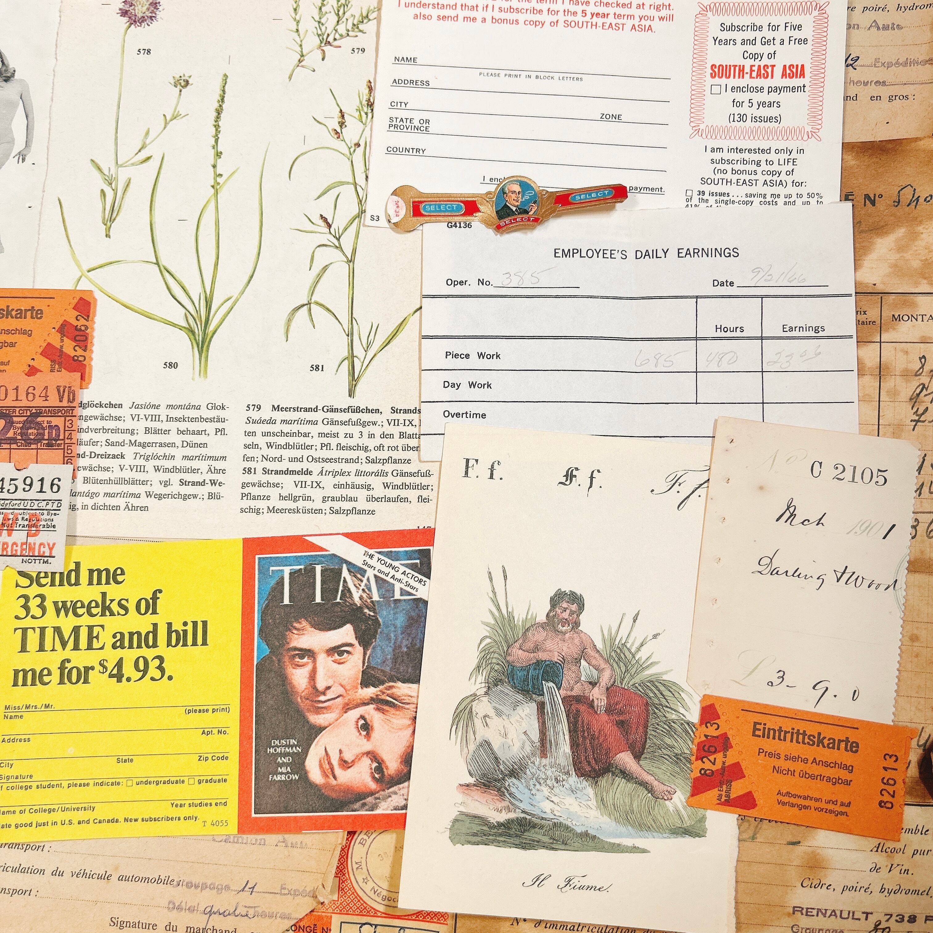 こちらは、異国の時を越えた物語がぎゅっと詰め込まれた、アンティーク・ヴィンテージの紙もの30枚セットです。封筒、領収書、乗車券、診療明細、雑誌の申し込み用紙、絵葉書、チケット、切手などが、年代や国を超えて1つのセットに集められています。それぞれの紙片に書かれた手書きの文字、スタンプ、印刷されたデザインには、使われていた当時の空気や生活がそのまま息づいています。