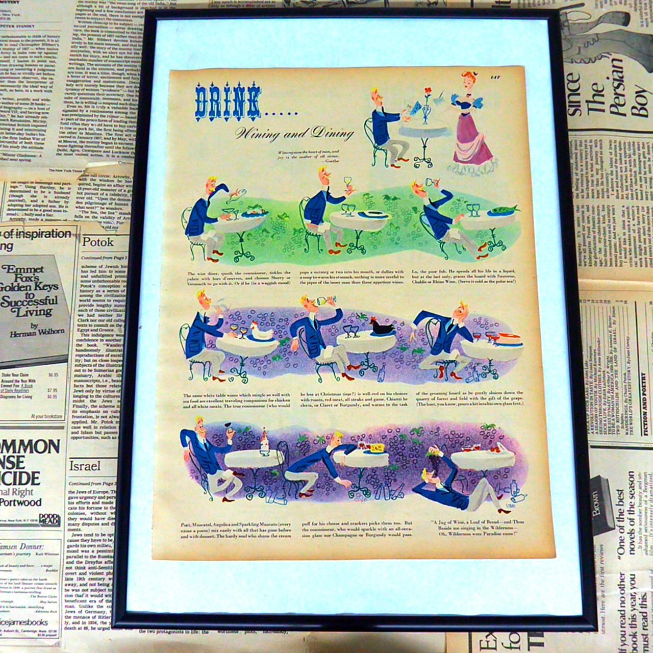 このイラストはクリスマスの季節をテーマにしたユーモラスな4コマ構成で、様々な人々がワッサイル(ホットワインの一種)を片手に陽気に過ごしている様子が描かれています。上部にはクリスマスツリーの下でワインを掲げる男性、小さな犬と共に楽しげな雰囲気が広がります。隣では帽子を被ったカップルがソファで密やかに乾杯しています。下段左では、紳士が鏡の前で肖像画と向き合いながら一人乾杯しており、少し皮肉めいた孤独な祝杯の様子がユーモラスに描写されています。右下では暖炉の前で複数の男性が乾杯し、温かみとコミュニティ感が伝わります。キャプションはそれぞれのシーンに合わせた短い詩やフレーズで、クリスマスや年末の祝祭を皮肉と洒落を交えて表現しています。イラスト全体にレトロな色使いと軽やかなタッチが特徴的で、当時の雑誌らしい遊び心と社交文化が感じられます。