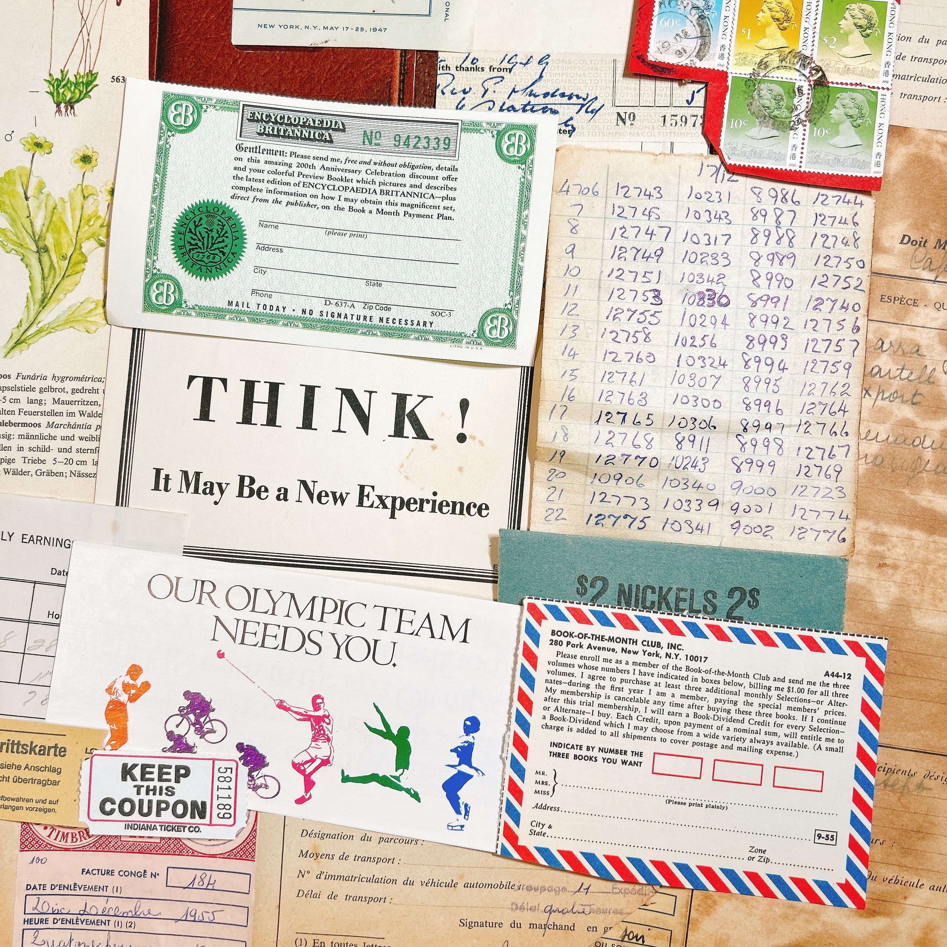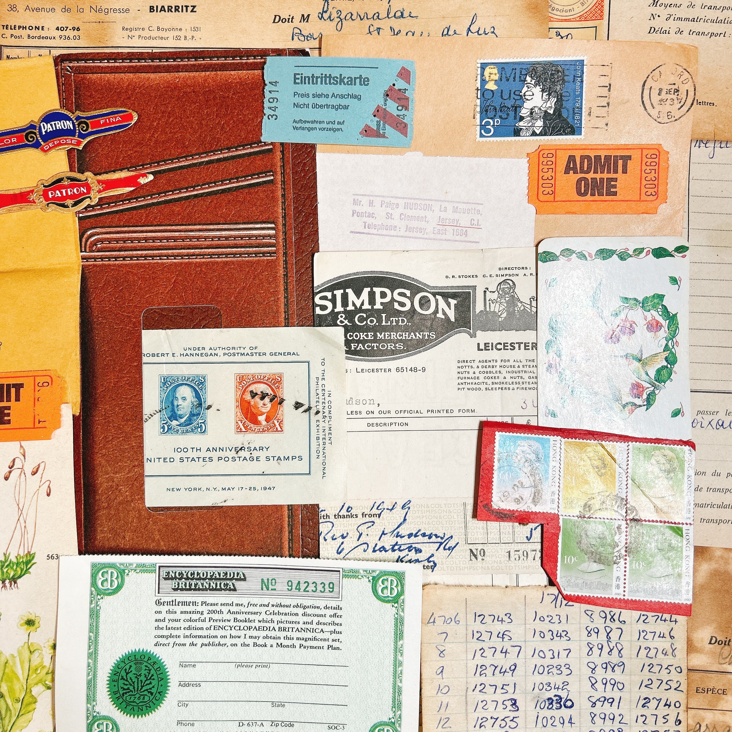 こちらは、異国の時を越えた物語がぎゅっと詰め込まれた、アンティーク・ヴィンテージの紙もの30枚セットです。封筒、領収書、乗車券、診療明細、雑誌の申し込み用紙、絵葉書、チケット、切手などが、年代や国を超えて1つのセットに集められています。それぞれの紙片に書かれた手書きの文字、スタンプ、印刷されたデザインには、使われていた当時の空気や生活がそのまま息づいています。