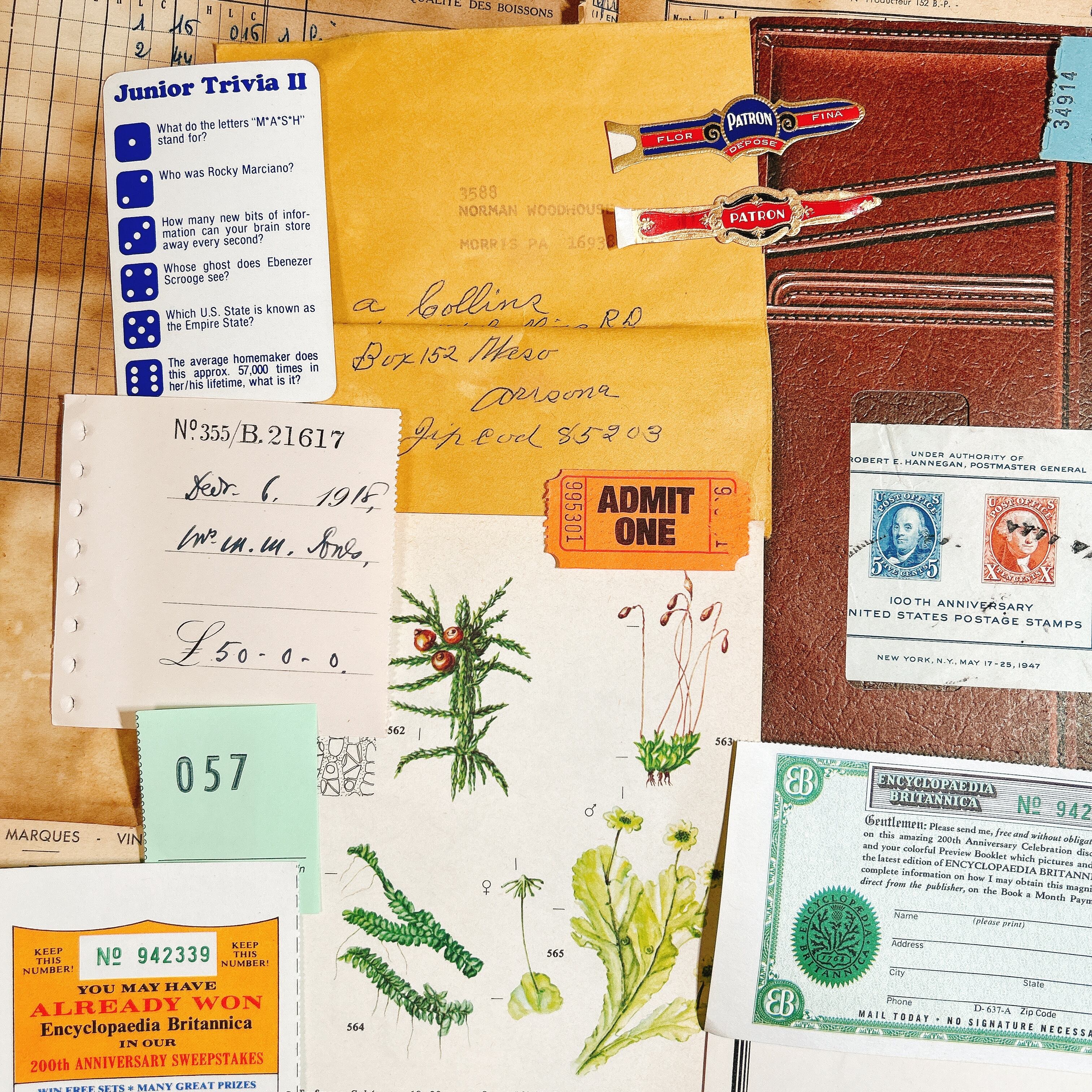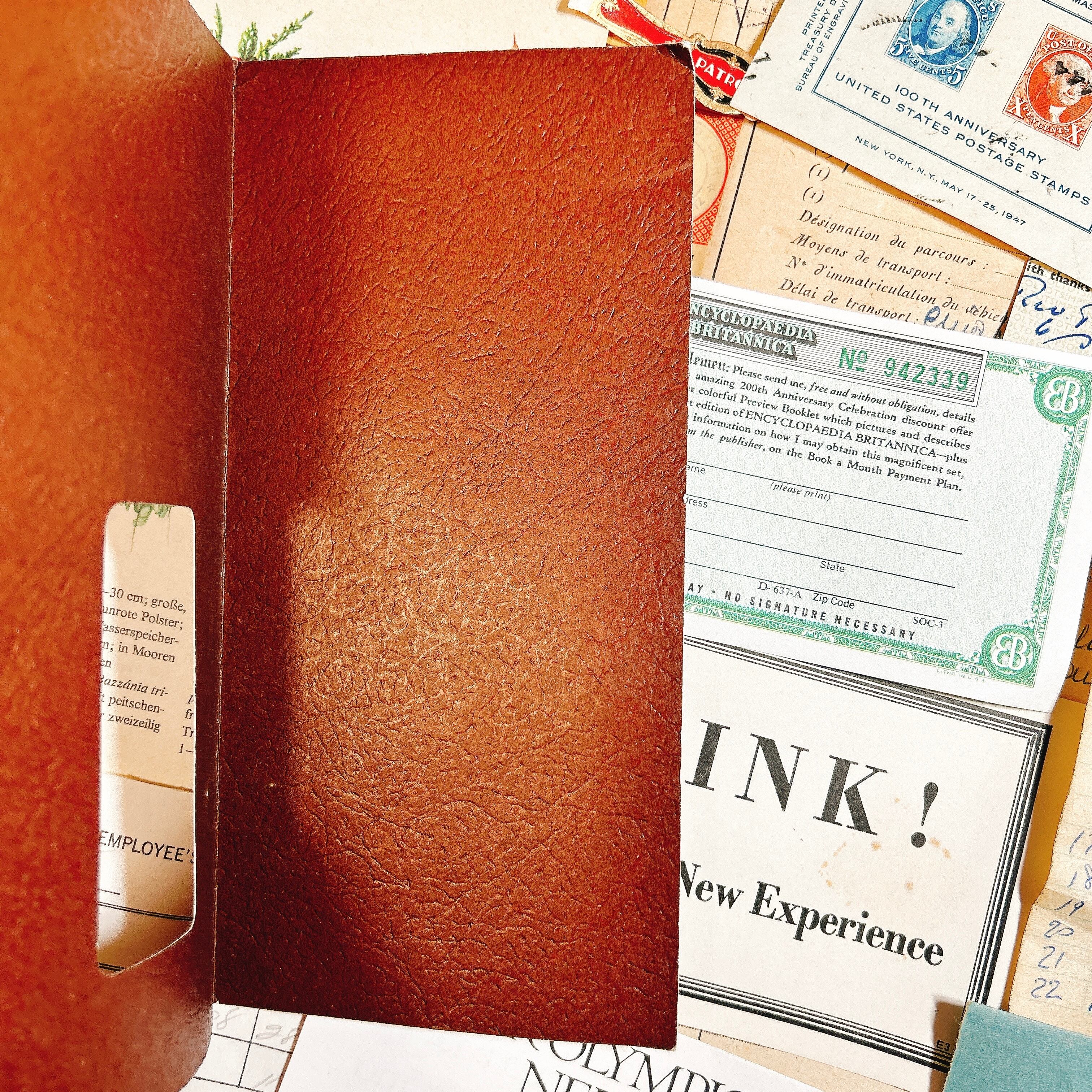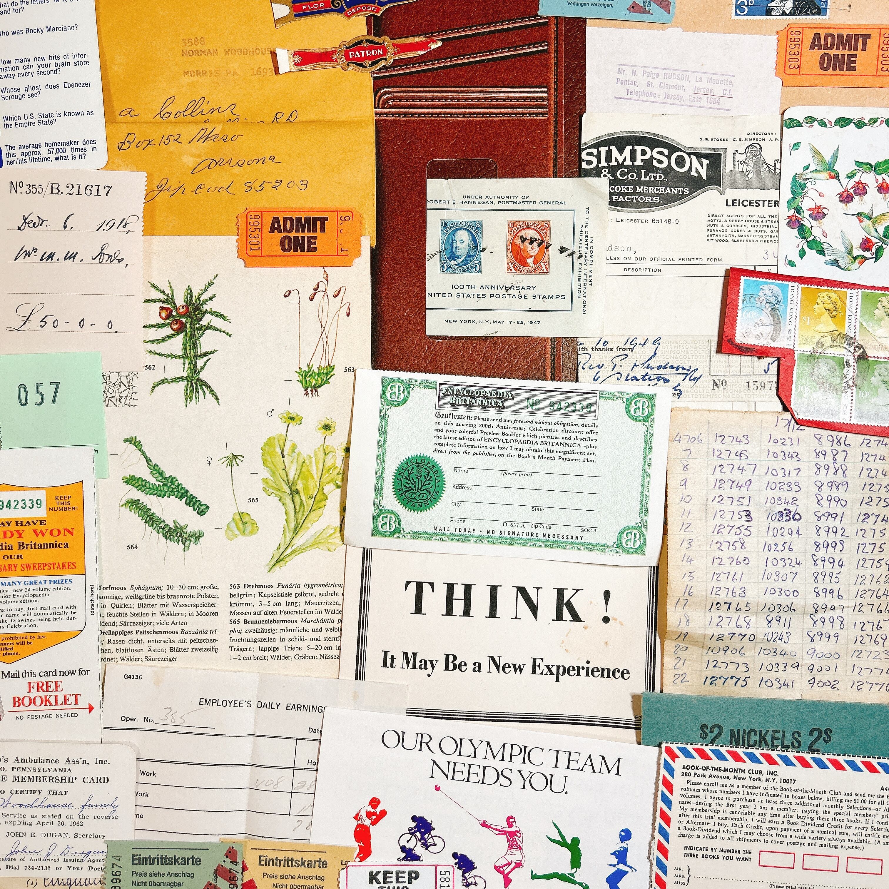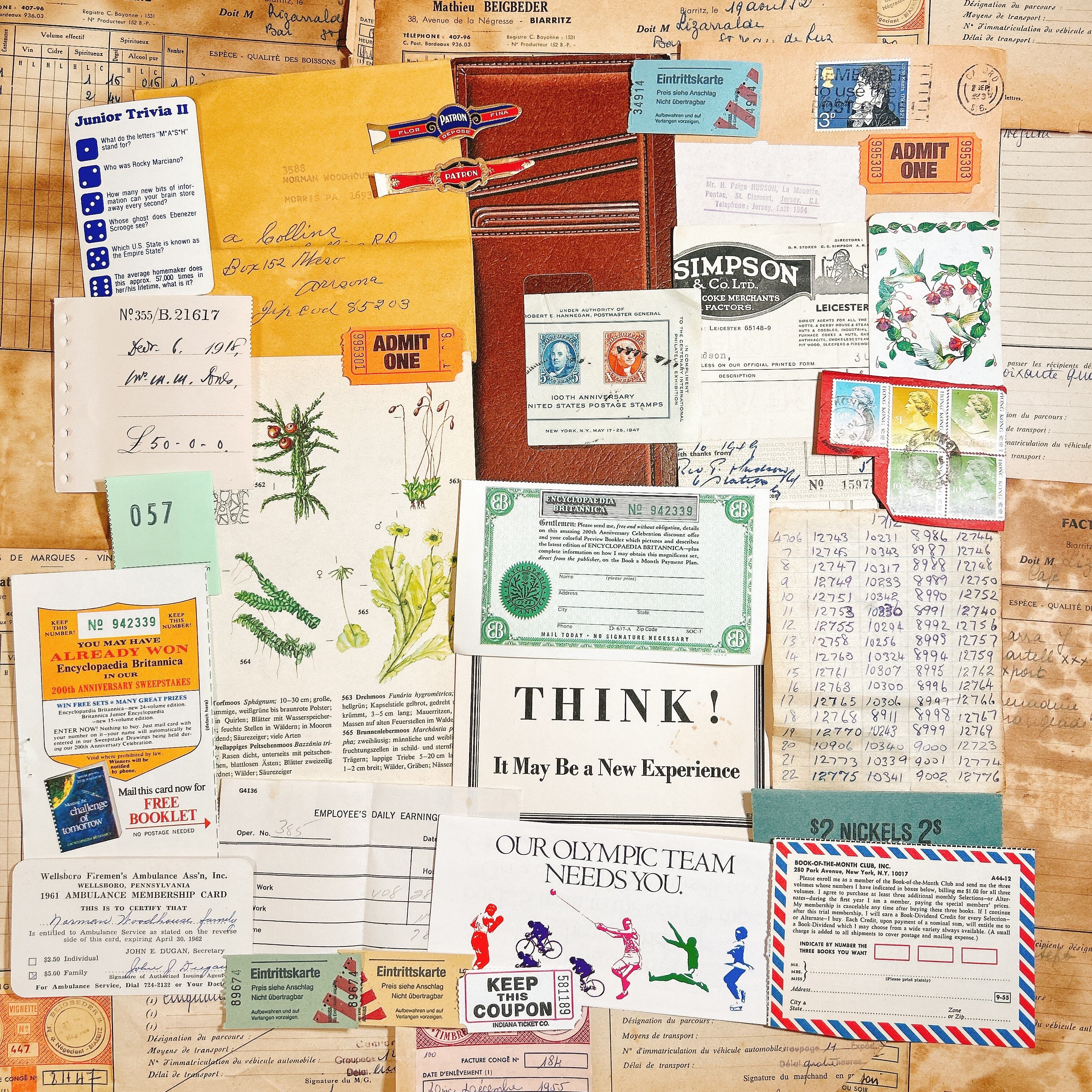 例えば、アメリカの獣医の診察明細には、1950年代の人々の暮らしぶりや、農村部でのやりとりが感じられます。封筒には、切手と手書きの美しい筆致が残され、まるで遠く離れた土地から届いた手紙を開くようなときめきを与えてくれます。ドイツ語で書かれたチケットは、どこかの劇場や列車の記憶を彷彿とさせ、過去の旅人たちの足跡を想像させます。カラフルな広告や、イラストが描かれたカードは、当時の印刷技術や美意識も垣間見せてくれます。