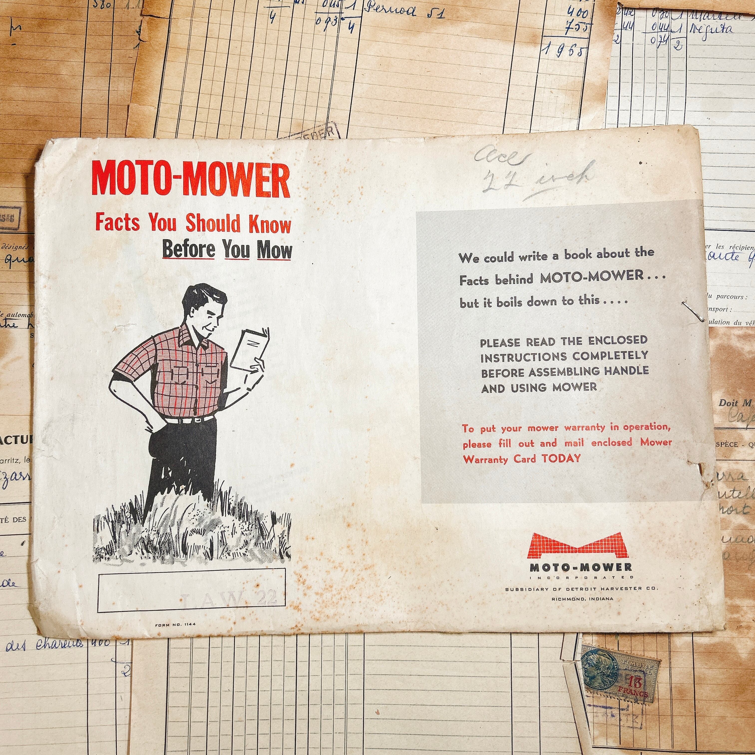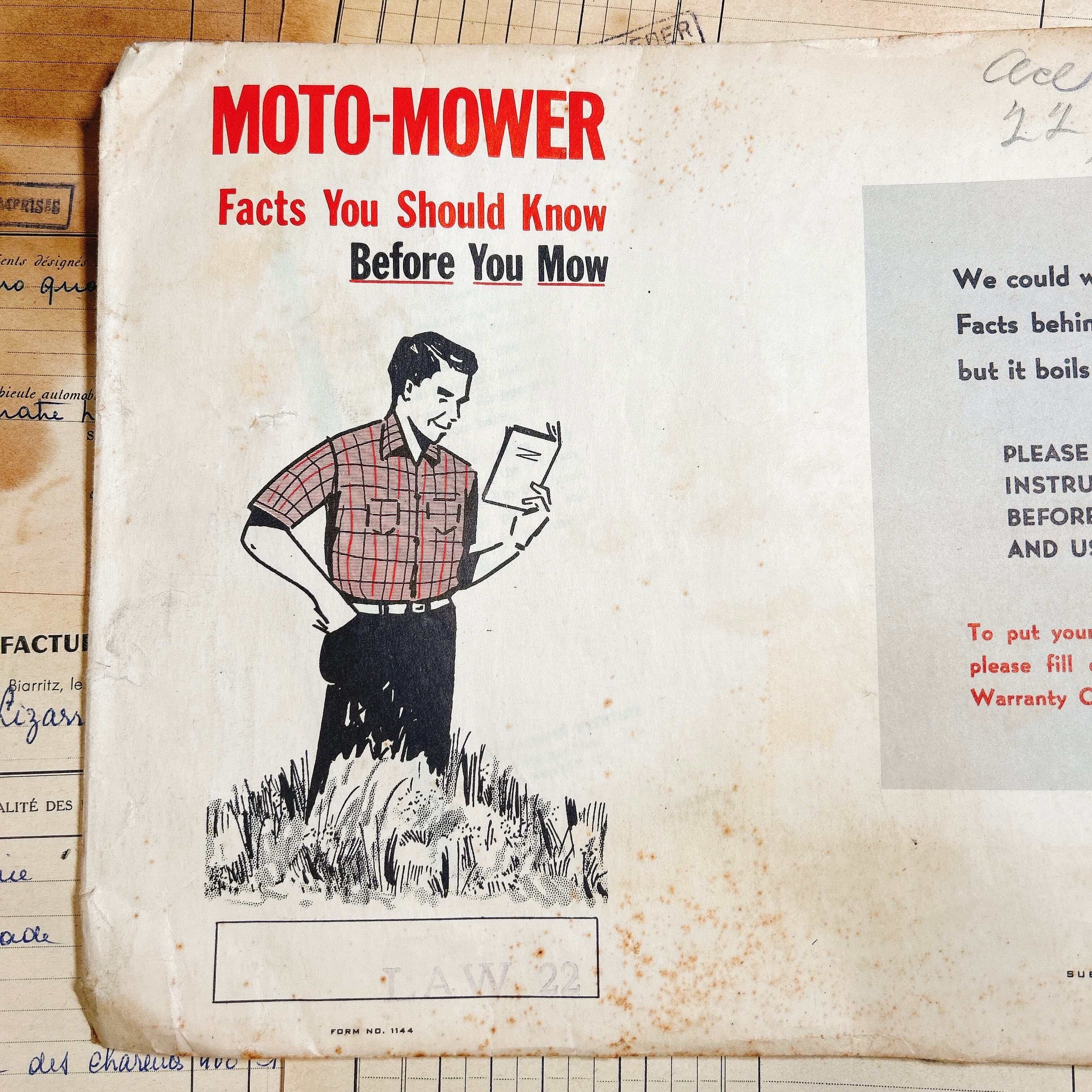 こちらはアメリカ・インディアナ州リッチモンドのMOTO-MOWER社が発行した、ヴィンテージの芝刈り機用マニュアル封筒です。封筒表紙には「Facts You Should Know Before You Mow(芝刈り前に知っておくべきこと)」のタイトルが赤黒の印字で大きく記され、赤チェックシャツの男性が真剣な面持ちで取扱説明書を読む姿が描かれています。サイズは約30.5×22.5cmで、大判のパンフレットや説明書を収納できるゆとりある封筒です。