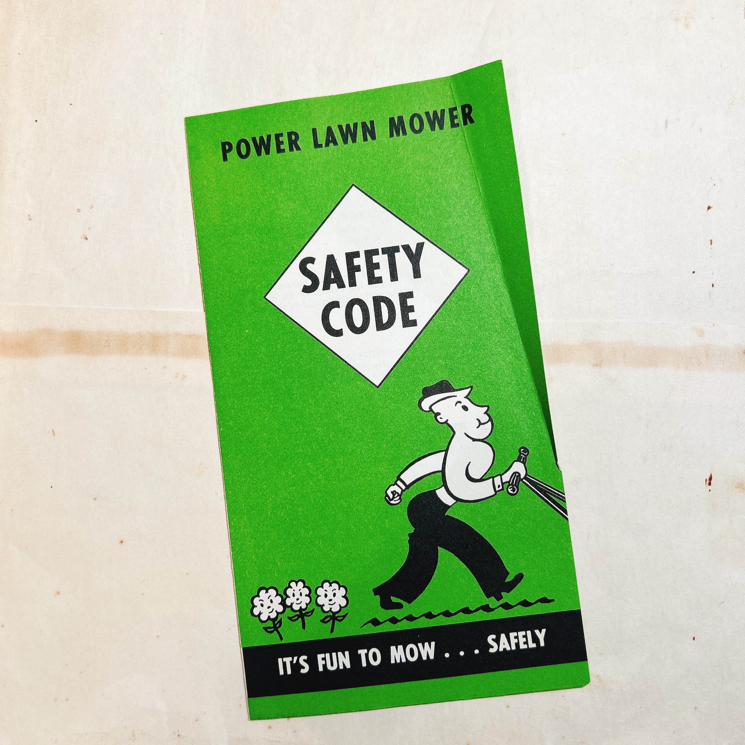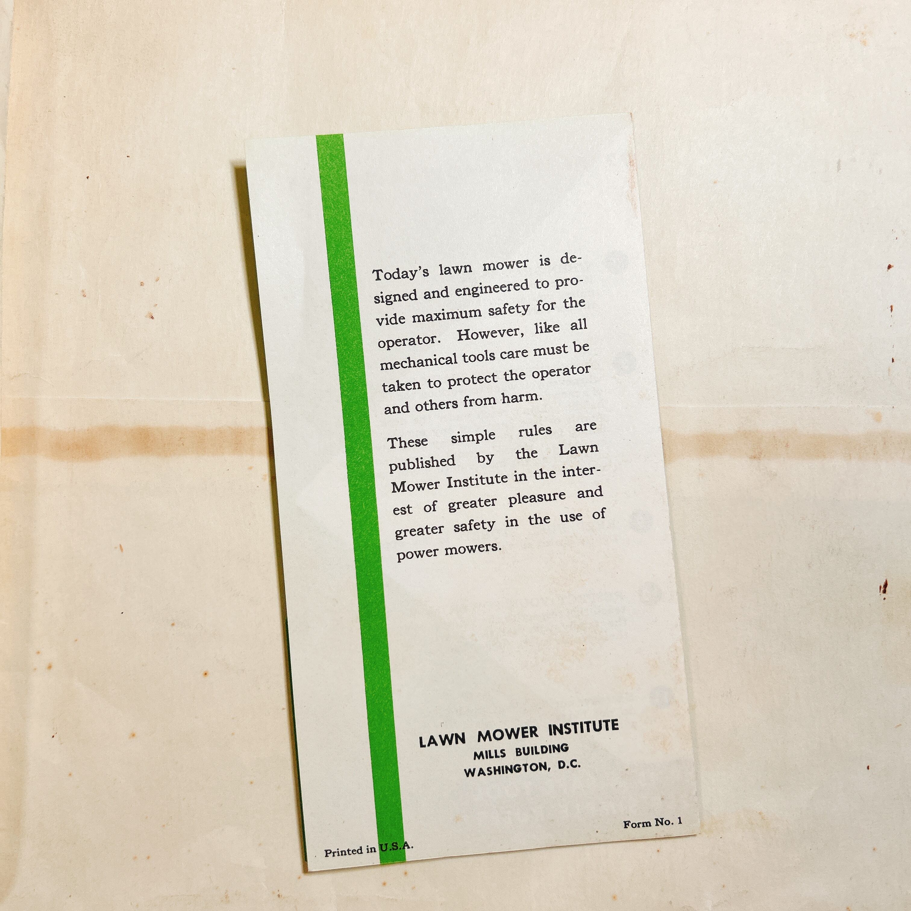 今回のセットには、当時封入されていた「POWER LAWN MOWER SAFETY CODE」のグリーンのパンフレットが付属しています。この冊子には、芝刈り機を安全に使用するための11のルールがイラスト付きで簡潔にまとめられており、レトロでユーモラスなデザインが魅力です。裏面にはLAWN MOWER INSTITUTE(ワシントンD.C.)の発行である旨も記載されており、当時の生活様式や安全教育への意識を感じさせます。